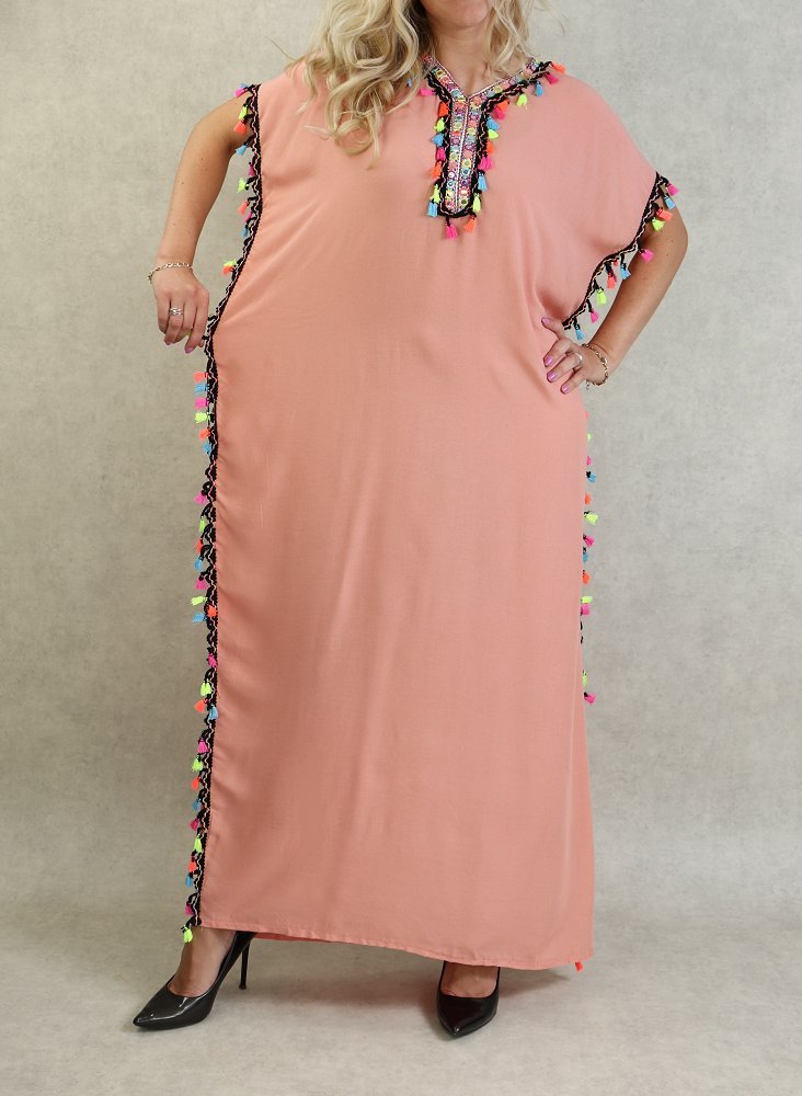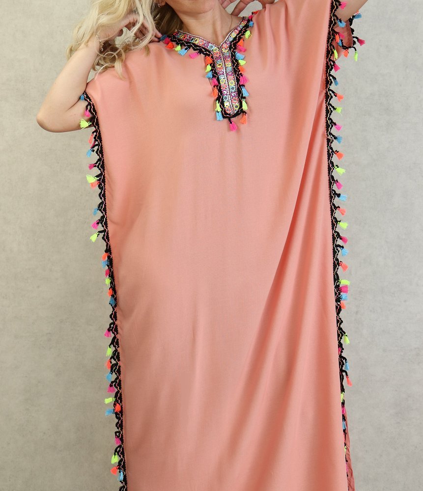 Robe orientale avec broderies et pompons, coupe droite, col rond semi ouvert, sans manches. La coupe ainsi que sa matière faciliteront une décontraction évidente.