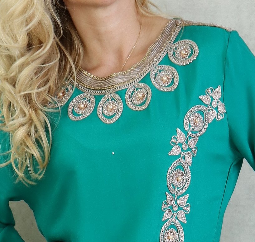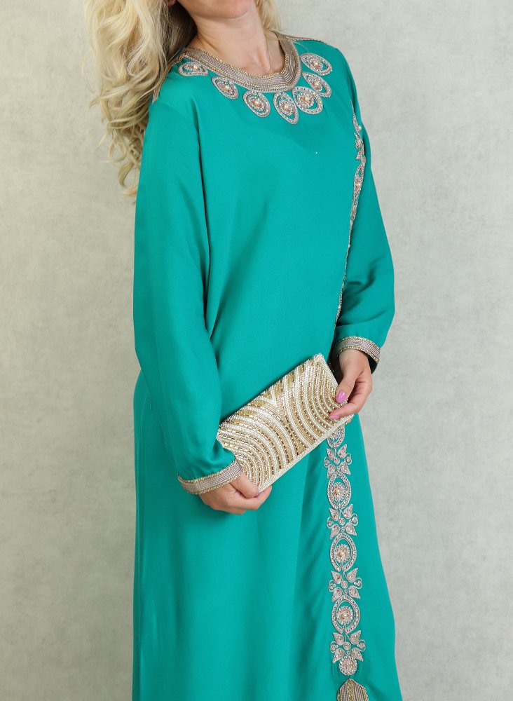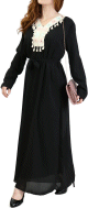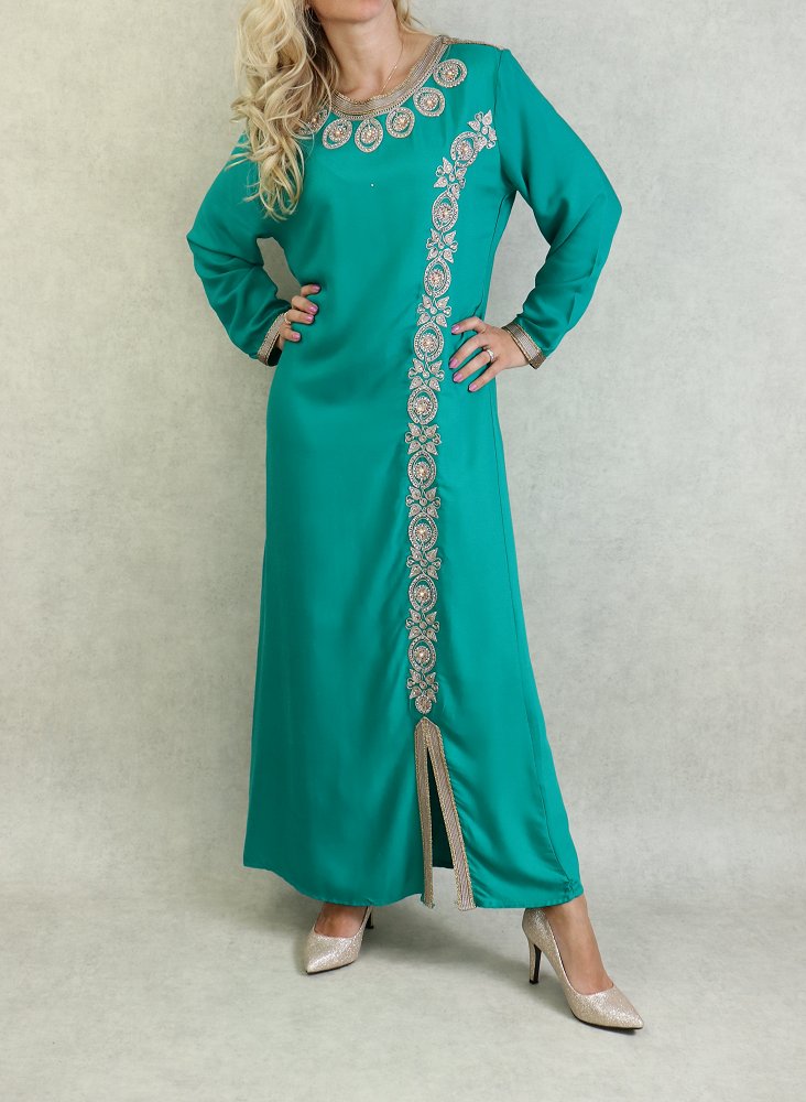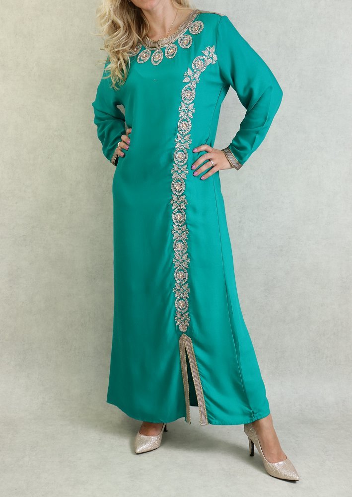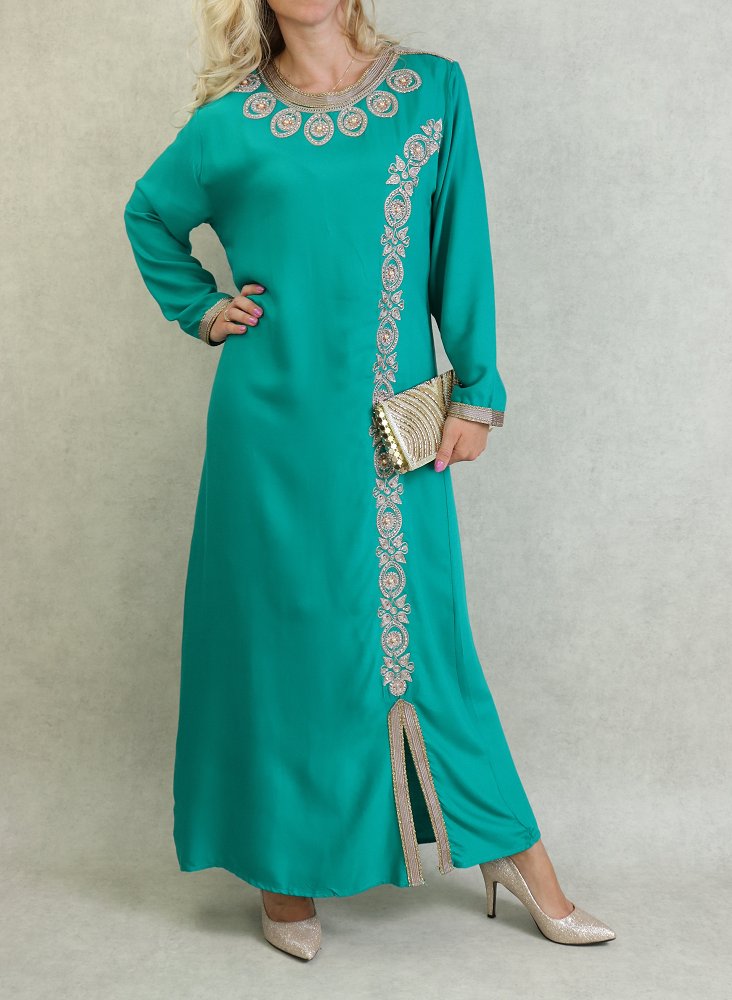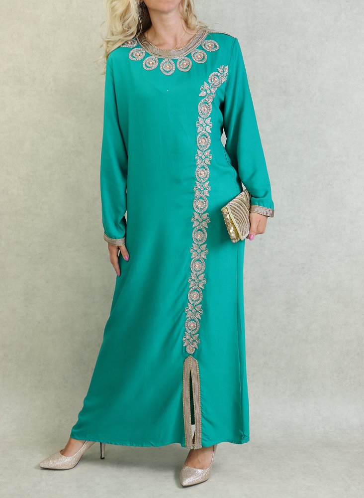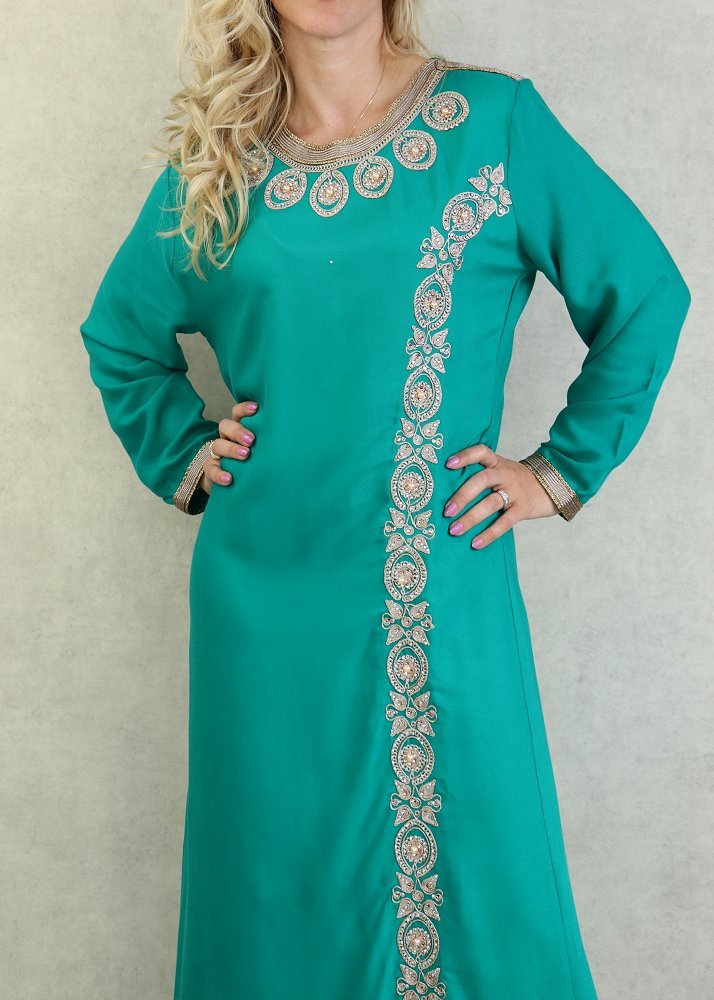 Belle robe style oriental avec broderies de qualité sur l'encolure, la longueur et finitions sur les poignets. Tenue sobre et élégante, parfaite pour occasions et événements.