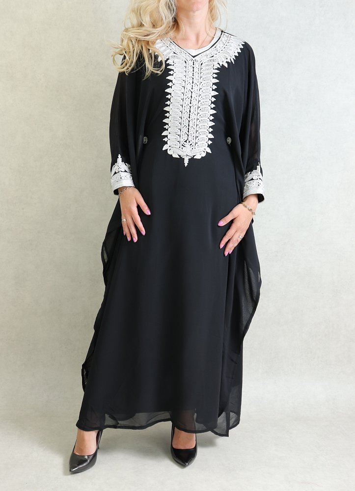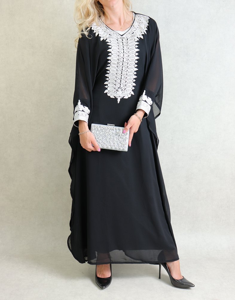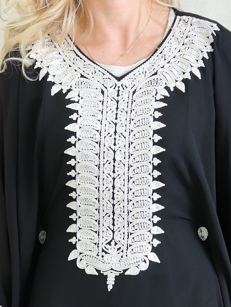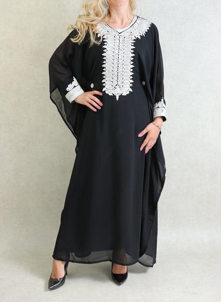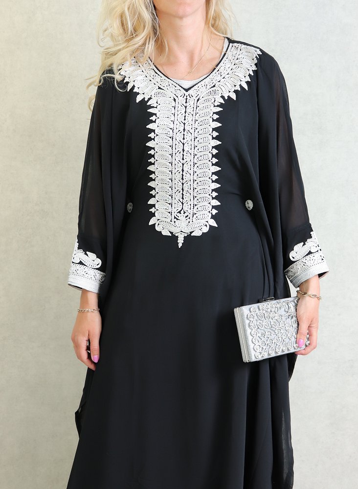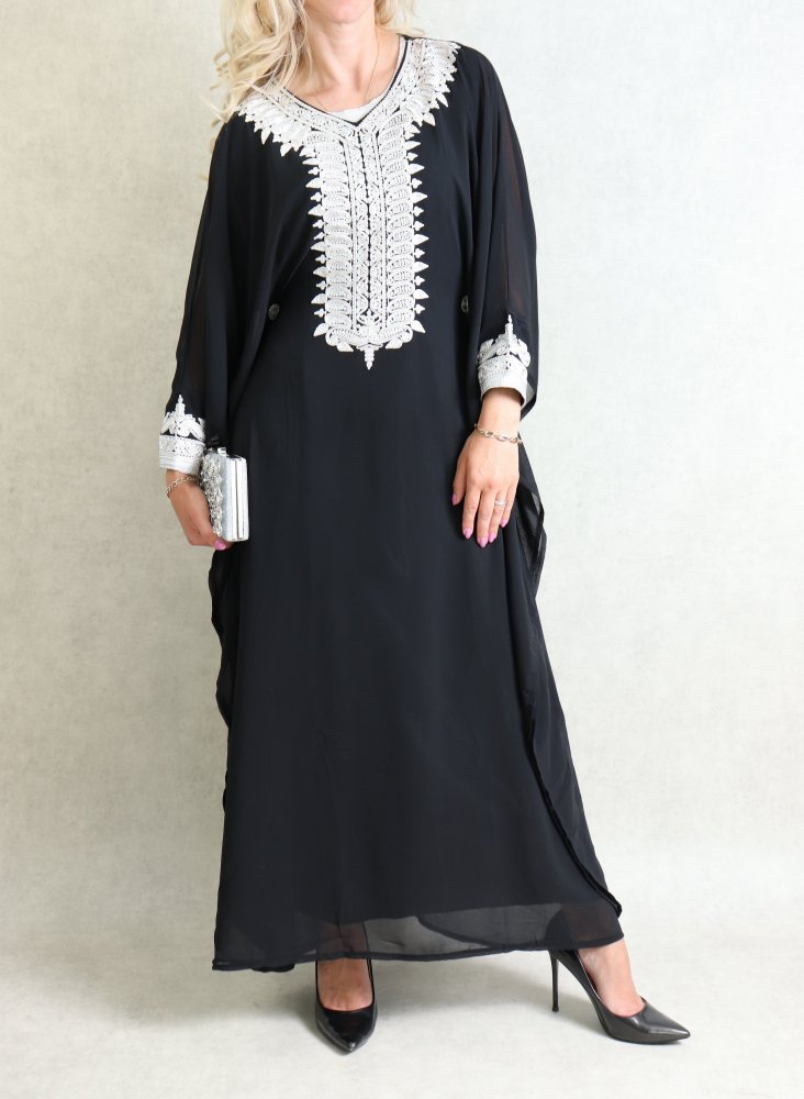 Robe Abaya Dubaï noire de qualité avec broderie et strass argenté et ceinture interne - REF. 38194 (45.00 €)