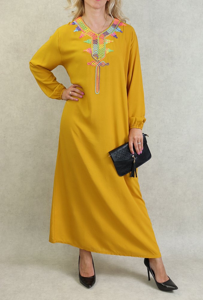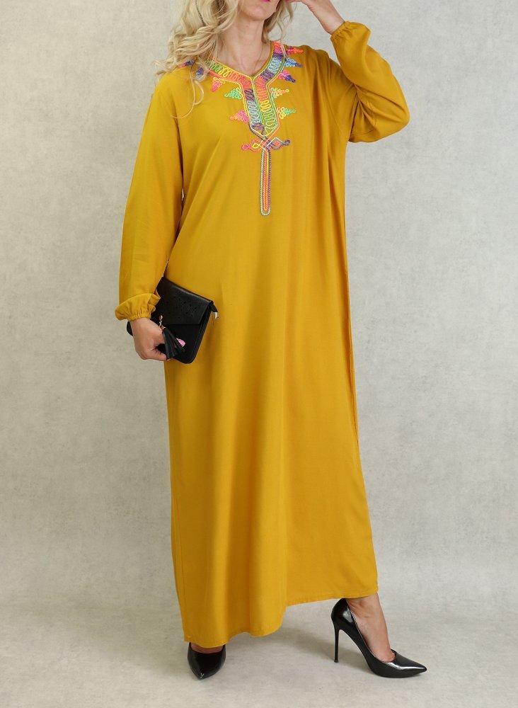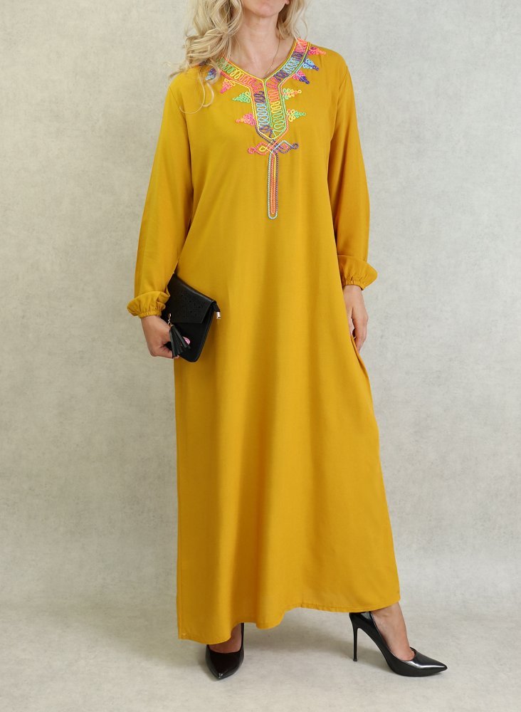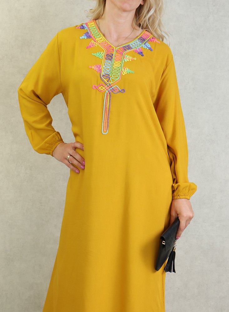 Robe fluide d'été à manches longues avec broderies multicolore - Couleur Jaune moutarde Vetement & Accessoire