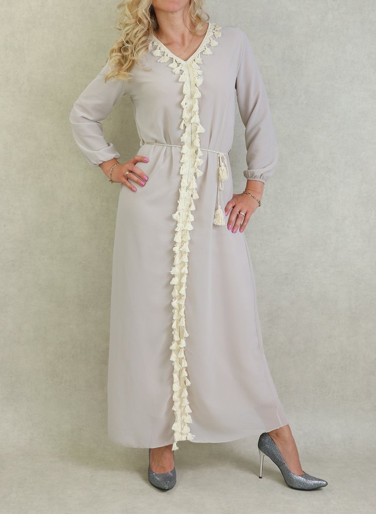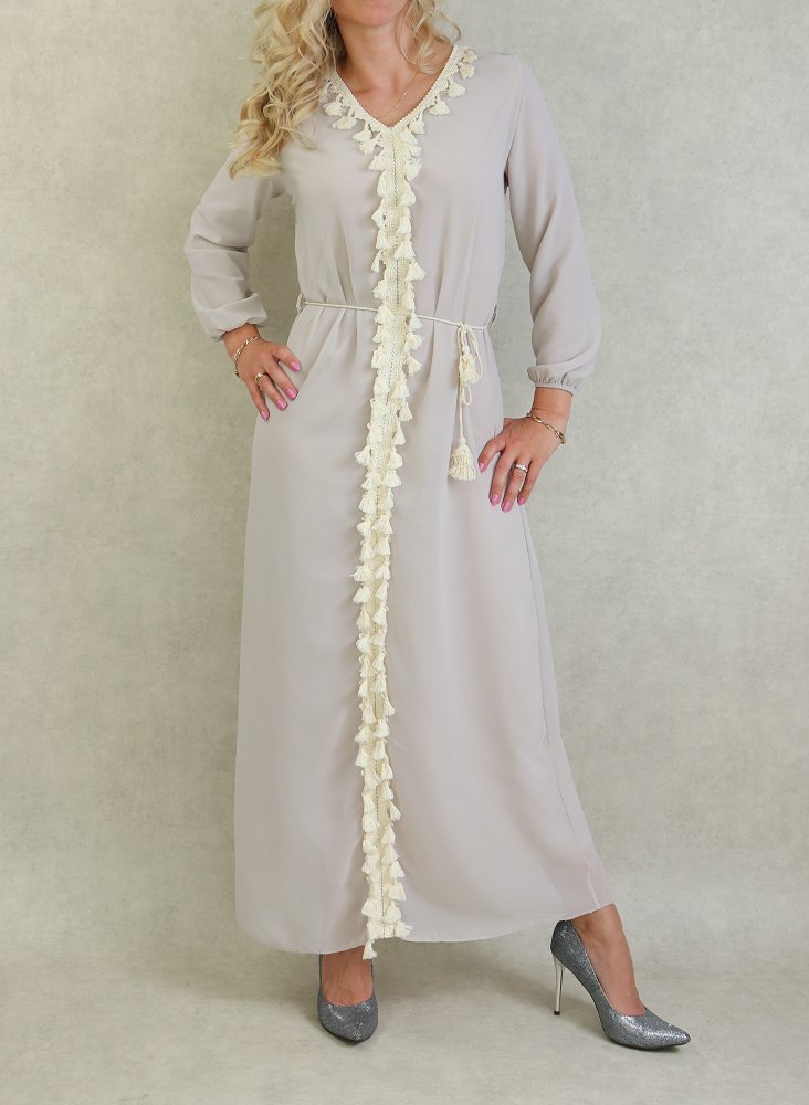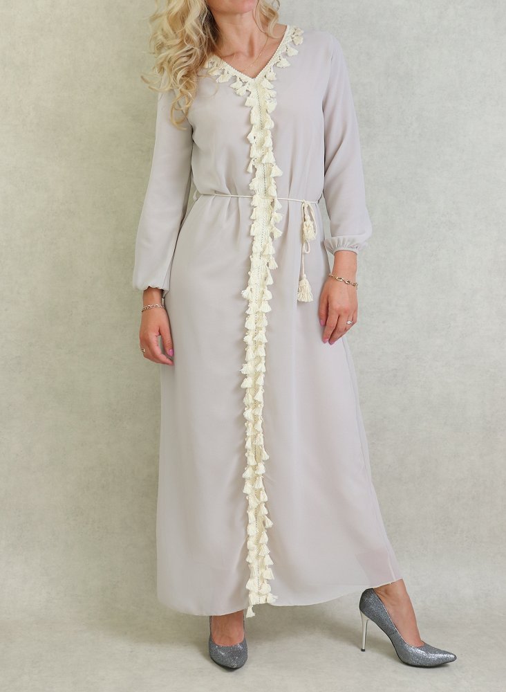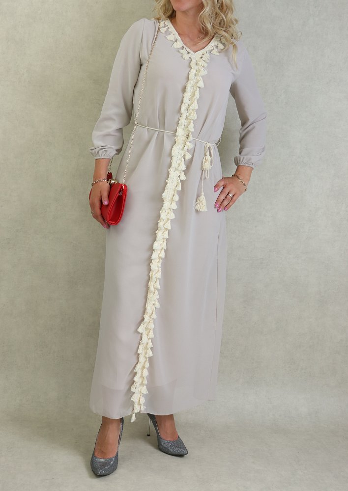 Robe longue, col en V, manches finition élastiques, ceinture à passants ajustable, entièrement doublée, coupe droite.