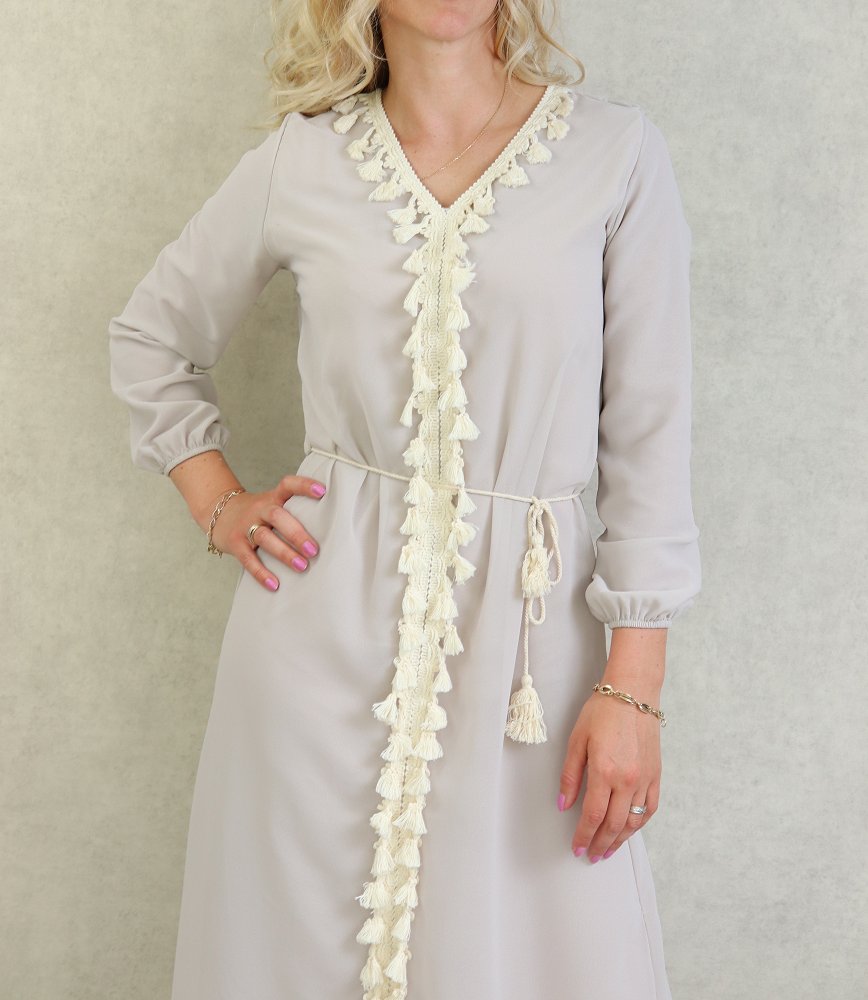 Modèle pile dans la tendance avec ses broderies, finement accompagné d'un lien qui se termine par des pompons.