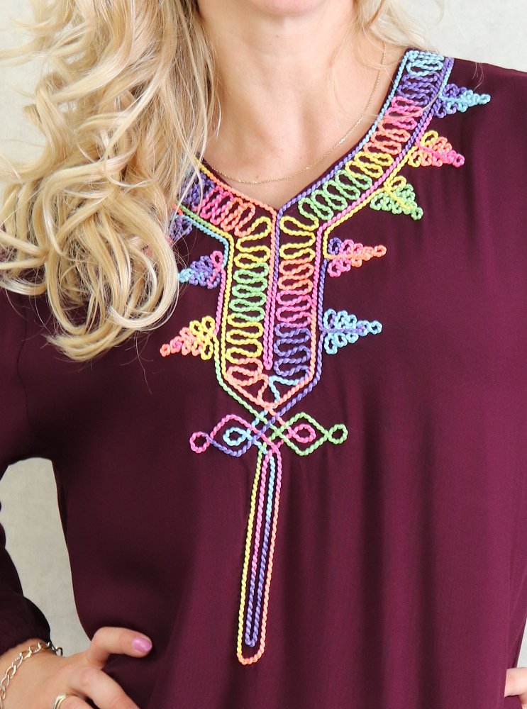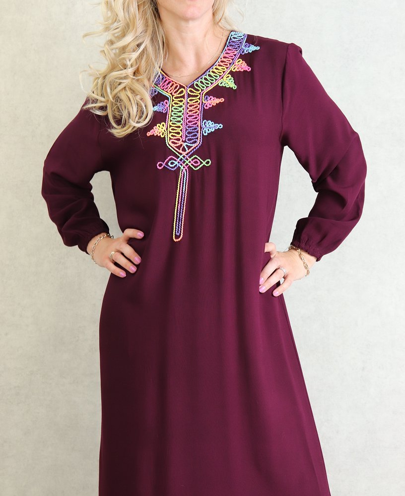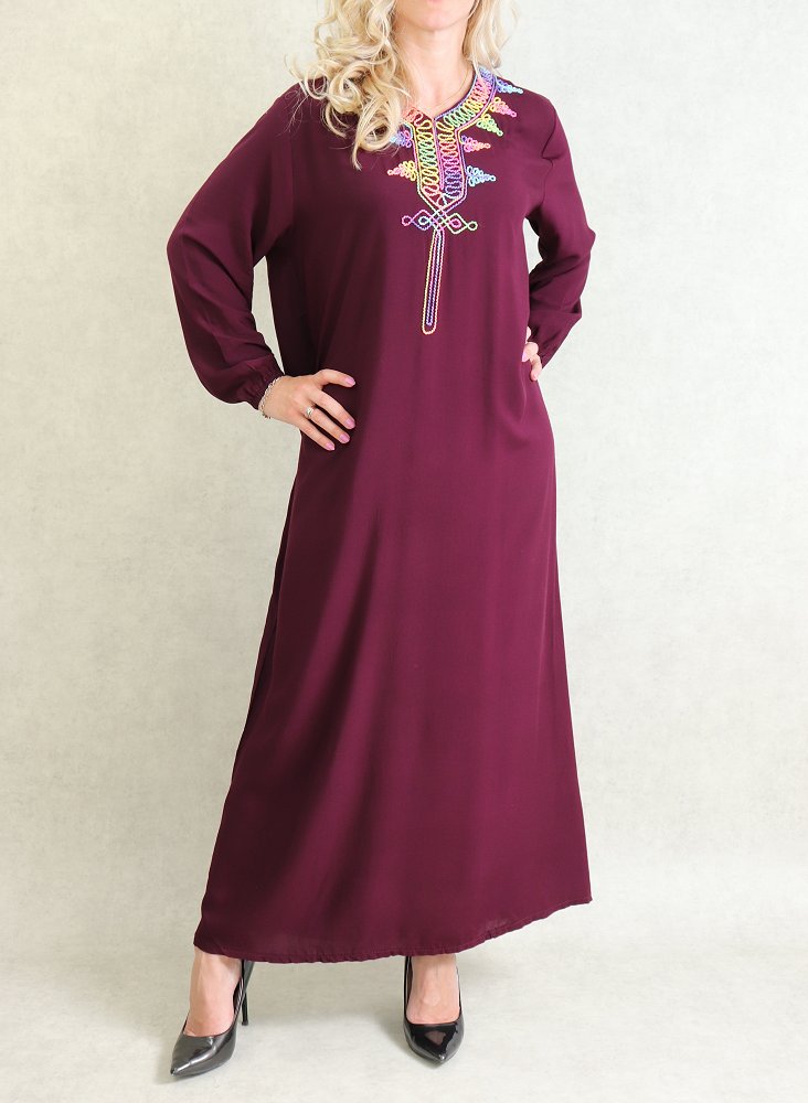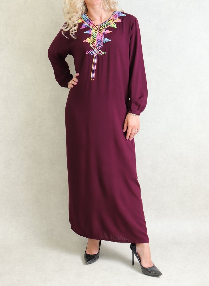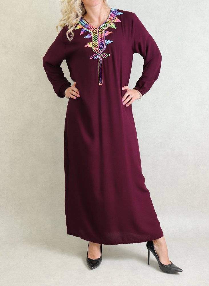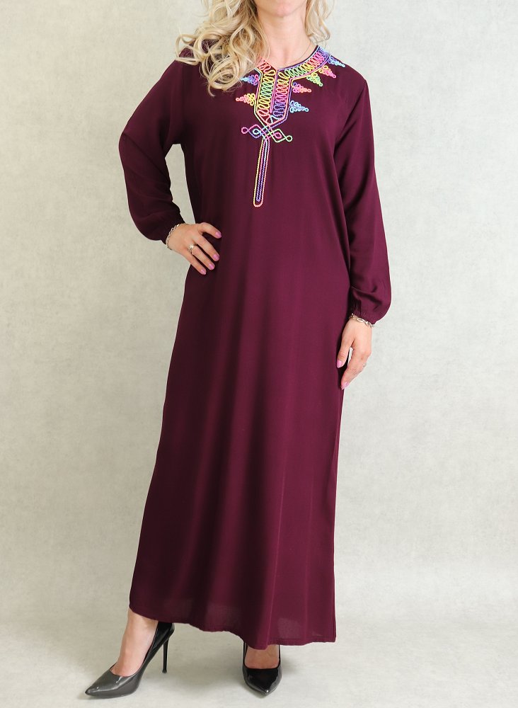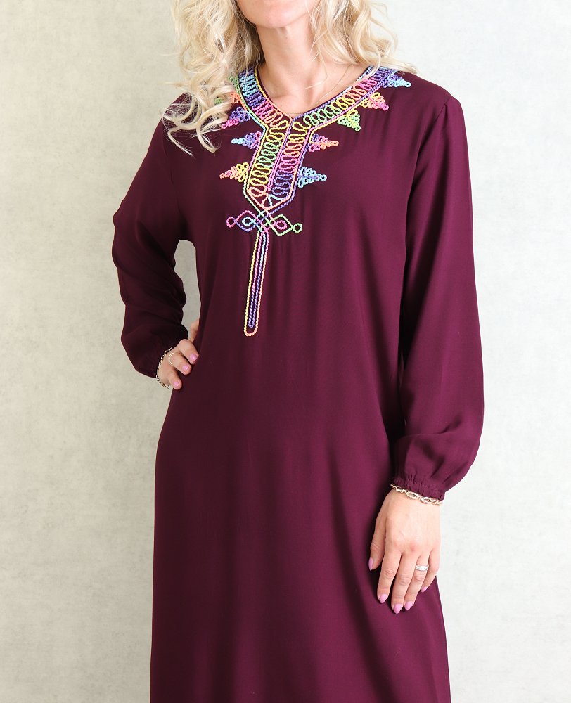 Robe de maison fluide à manches longues avec broderies multicolore pour femme - Couleur Prune Vetement & Accessoire