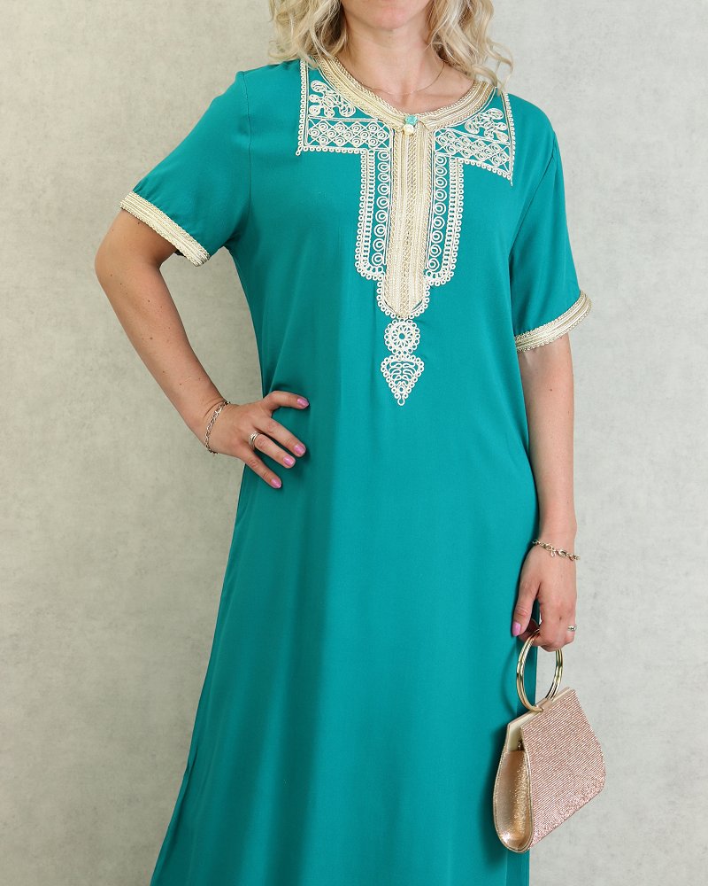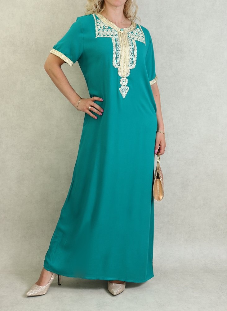Robe marocaine d'été manches courtes avec broderies - Couleur Verte émeraude Vetement & Accessoire