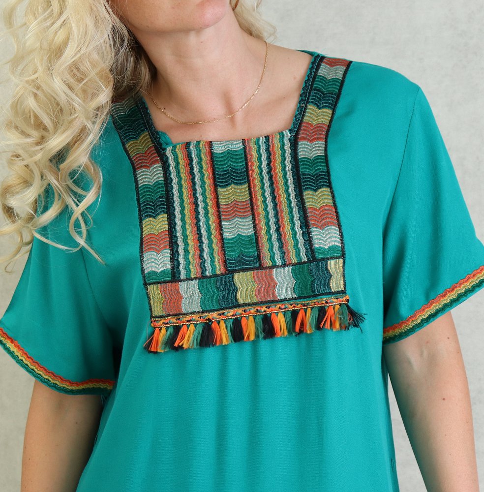 Robe longue manches courtes pour femme avec broderies originales, coupe droite, tissu fluide et doux au toucher coton.