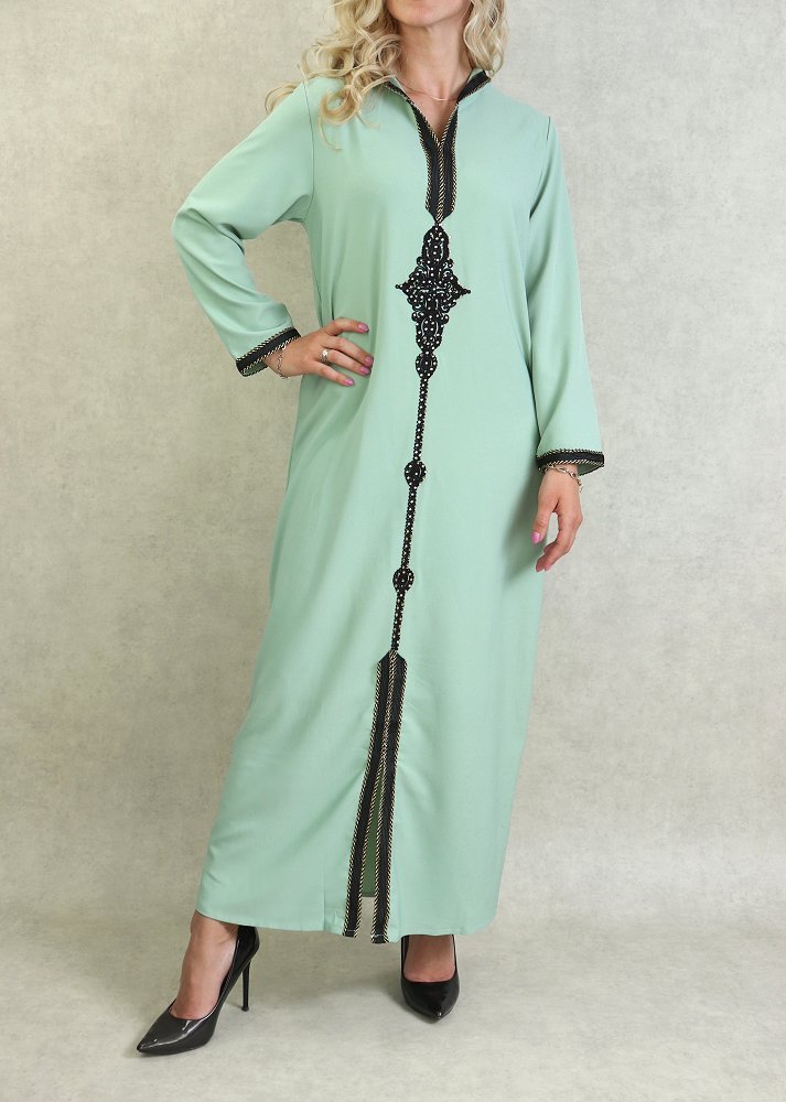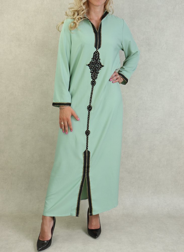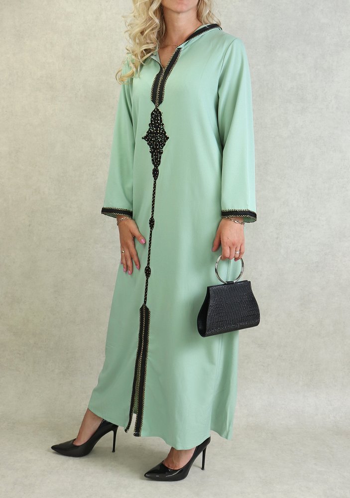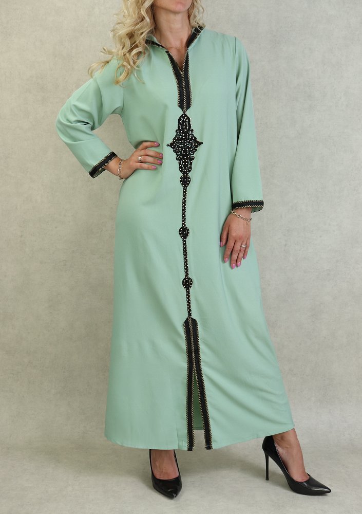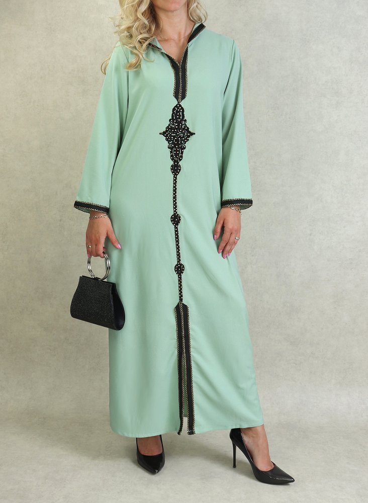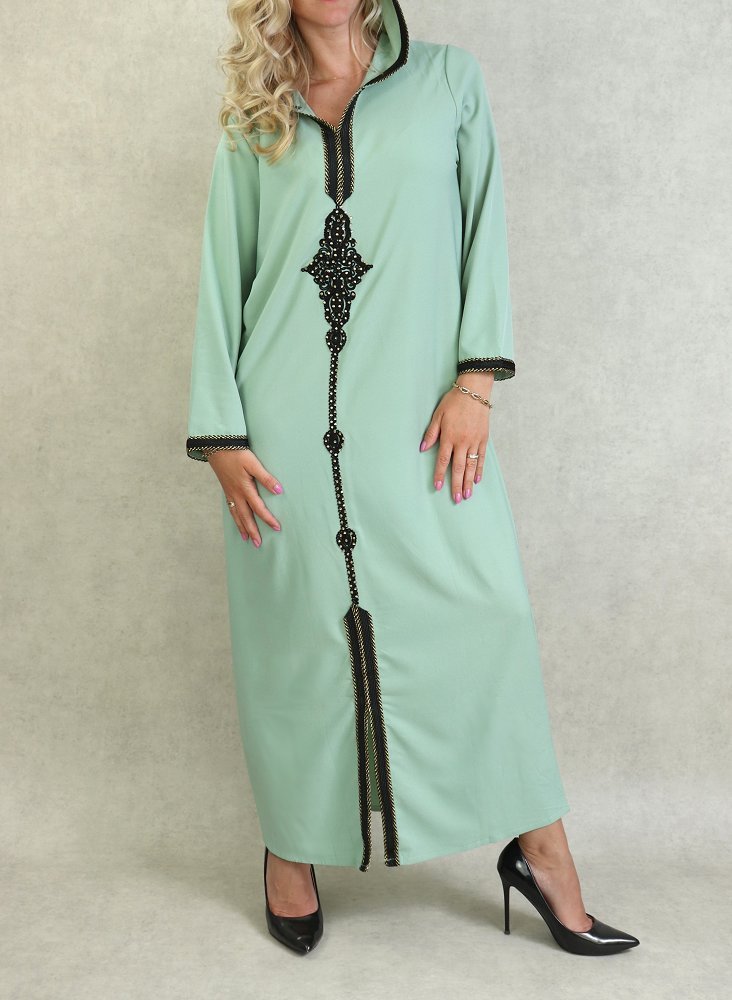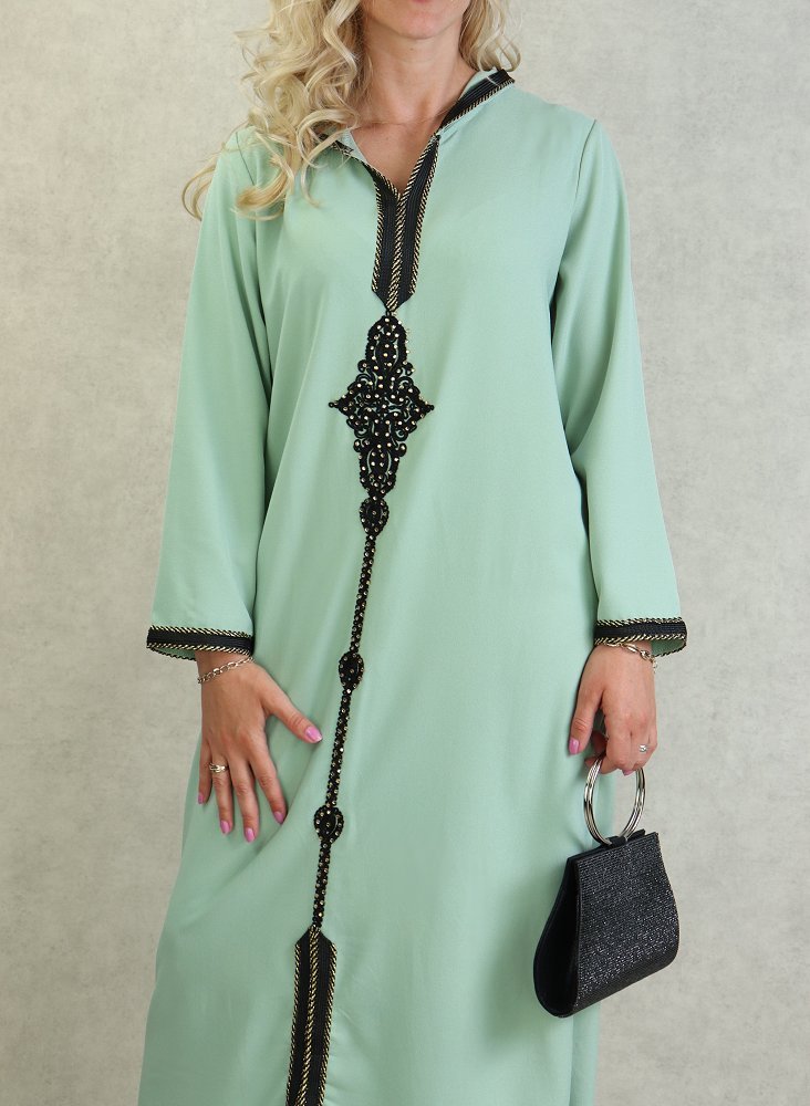 Djellaba marocaine avec broderies et strass dorées sur le devant, sur les poignets ainsi que le contour de la capuche.