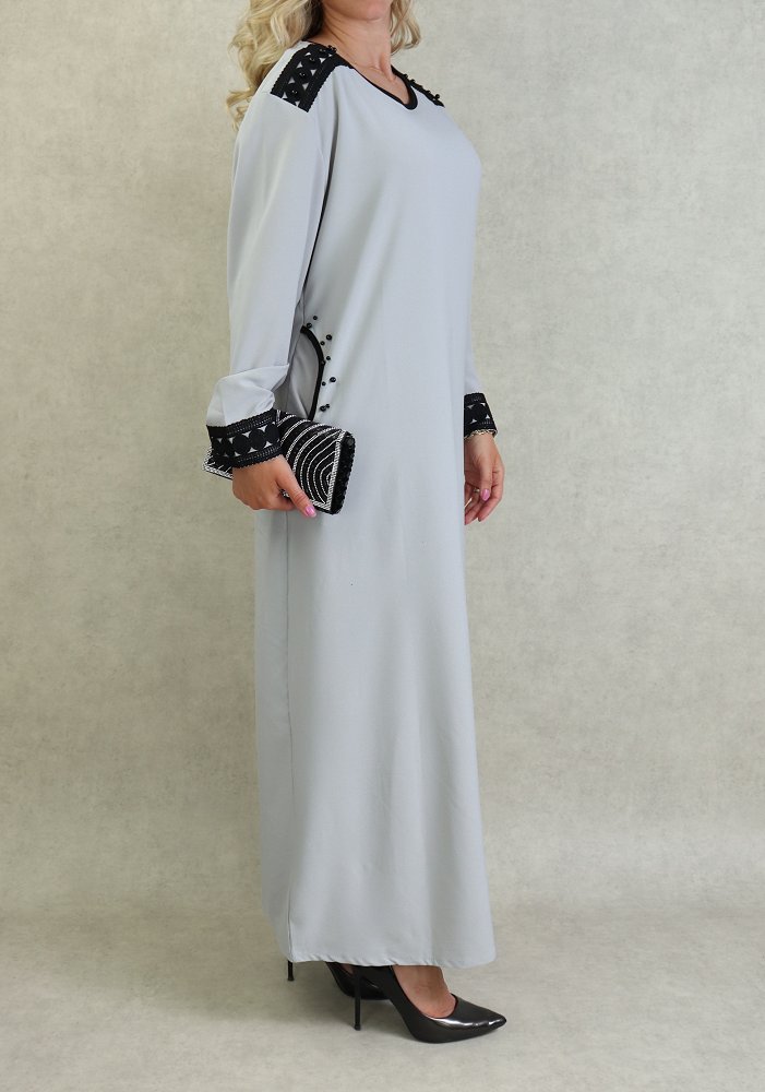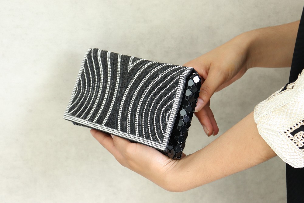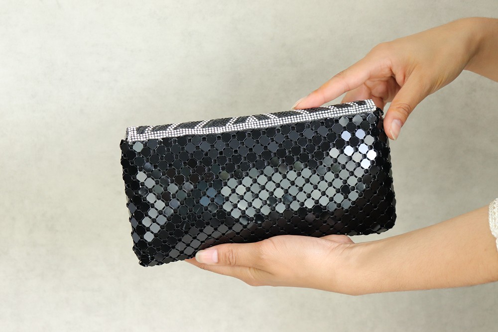 Élégante pochette de soirée en tissu art déco en rehaussé de sequins. Il se porte à la main ou à l'épaule grâce à sa bandoulière en chaînette amovible. Doté d'un rabat avec bouton pression.