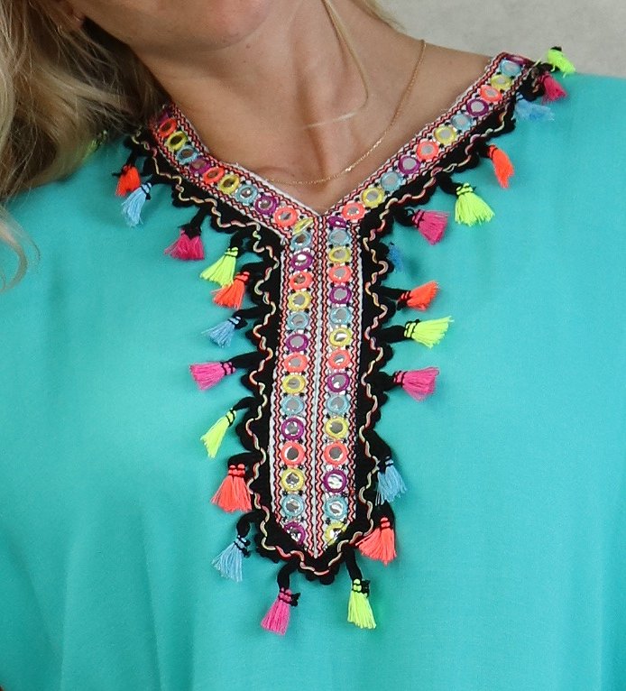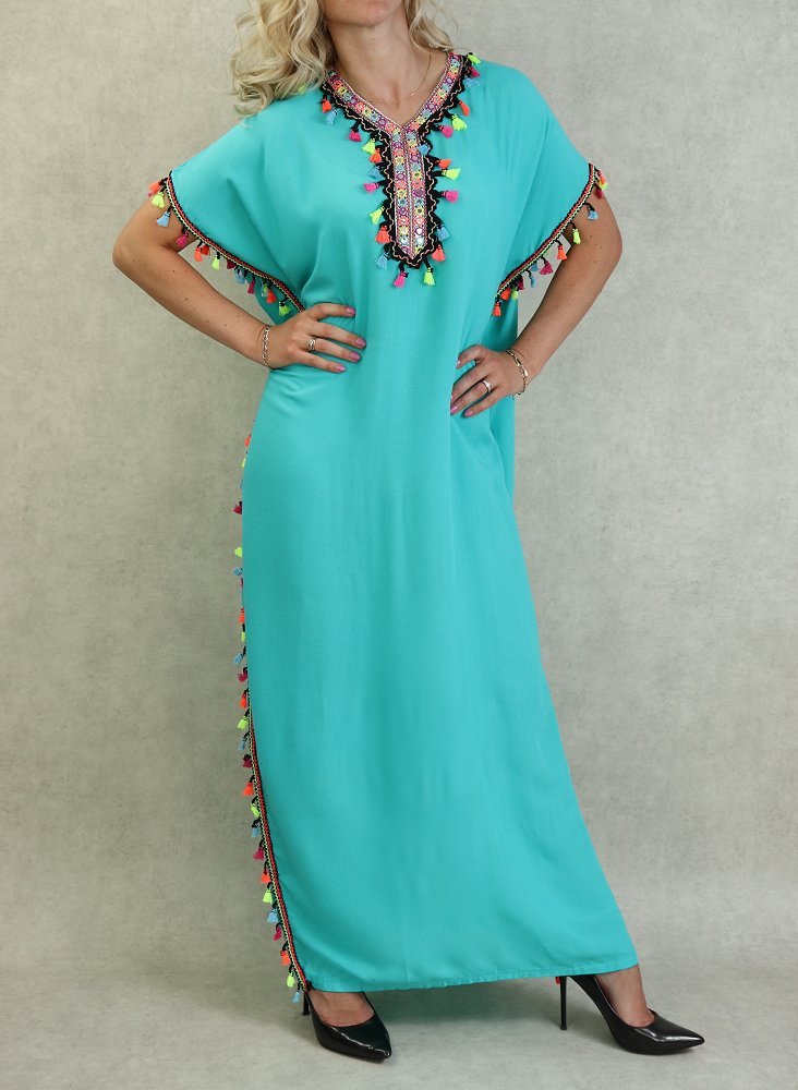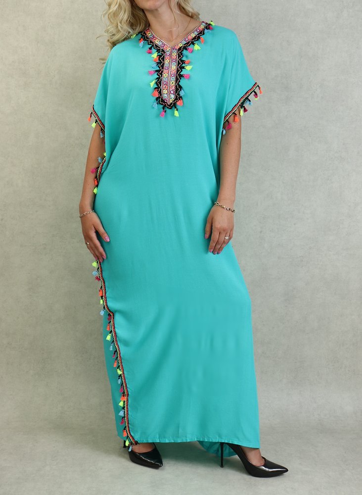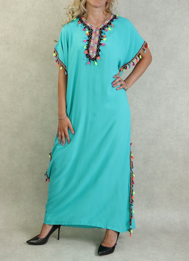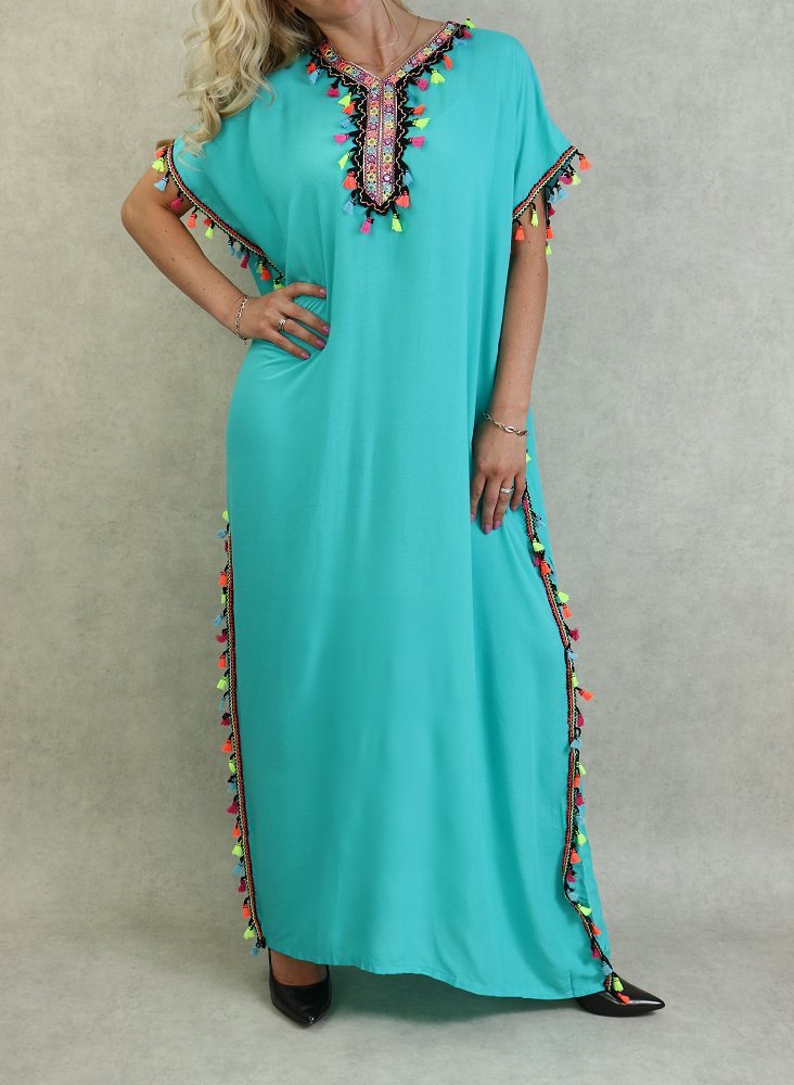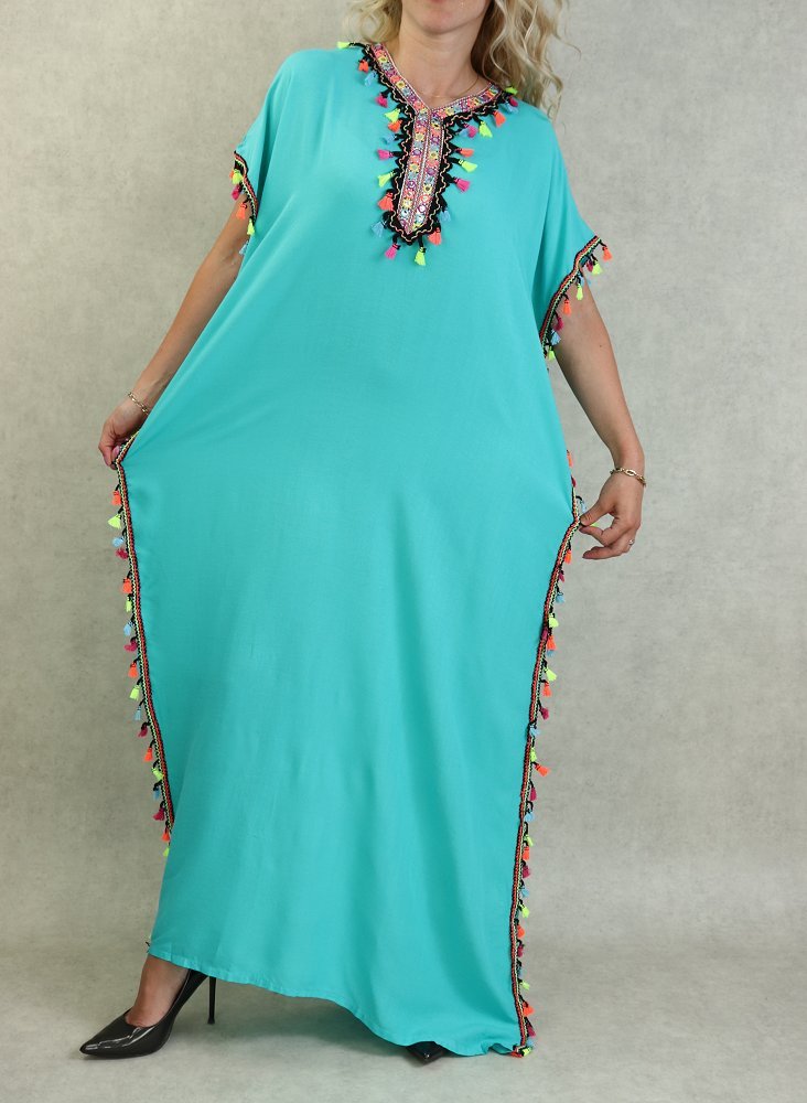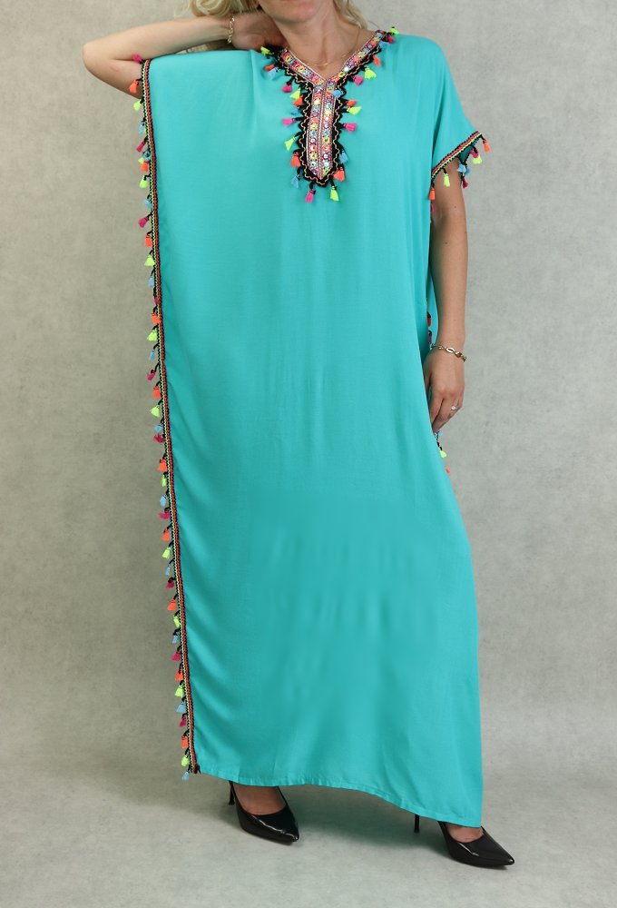 Robe orientale extra large avec broderies et pompons, coupe droite, col rond semi ouvert, sans manches. La coupe ainsi que sa matière faciliteront une décontraction évidente.