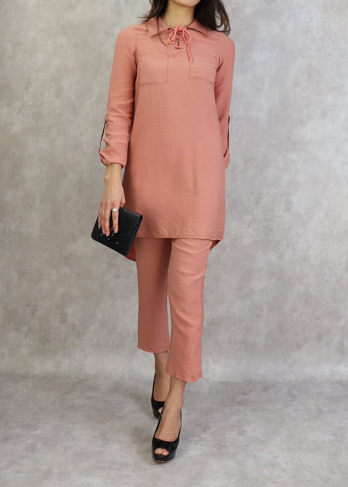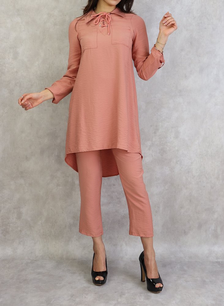 Ensemble casual : Tunique boutonnée -chemise longue- et son pantalon pour femme (Vêtement Hijab moderne) - Couleur rose poudré - REF. 37096 (35.00 €)