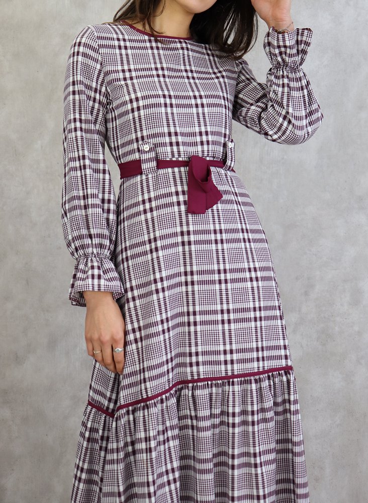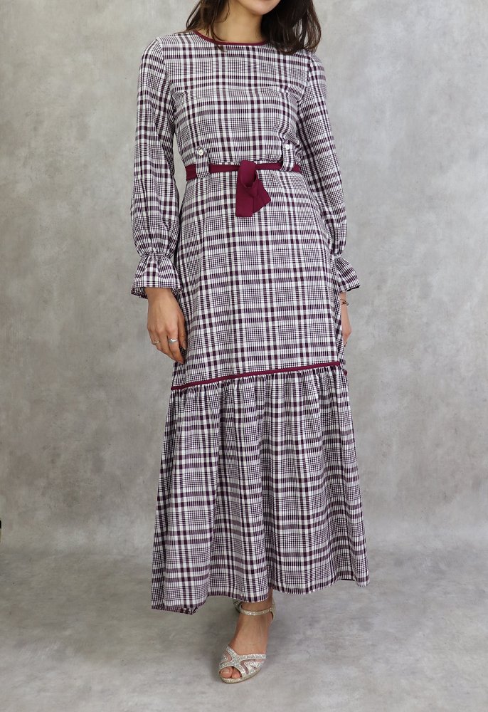 Cette robe longue évasée à carreaux, se pare d'un col rond, fermeture éclair au dos, de manches longues élastique au poignets, de volants sur le bas, Ceinture amovible. Vous serez élégante en toutes circonstances et sans effort.