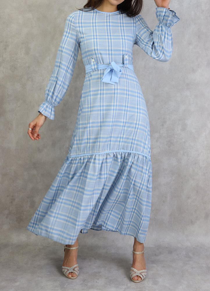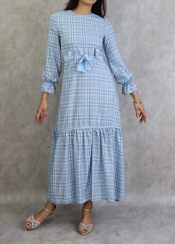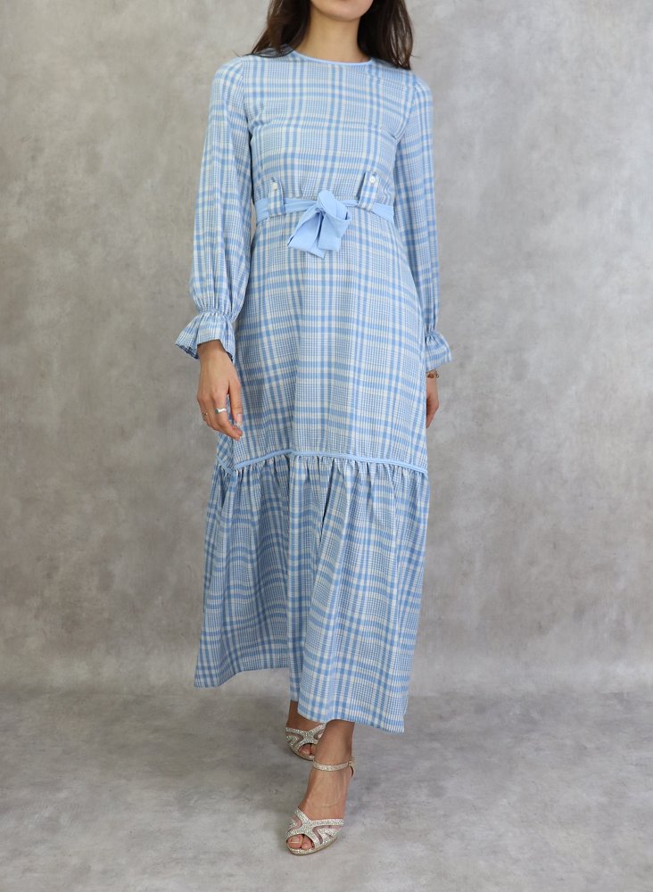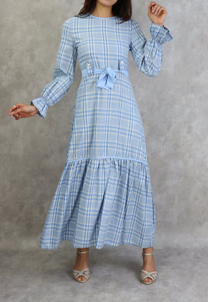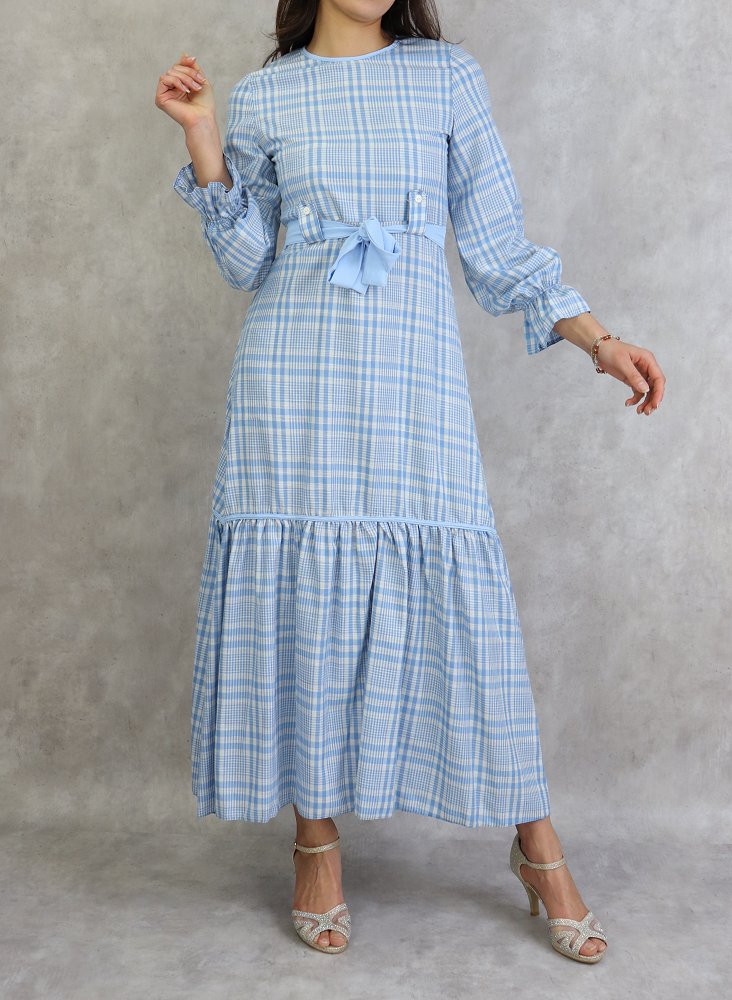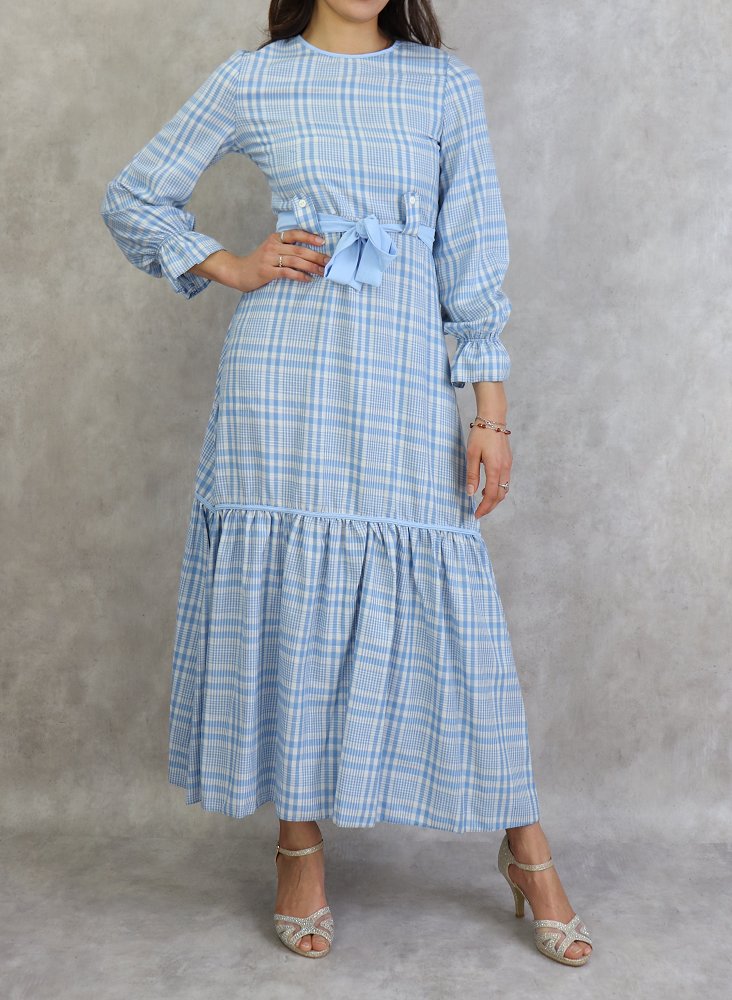 Robe longue a carreaux evasee - Couleur Bleu Ciel