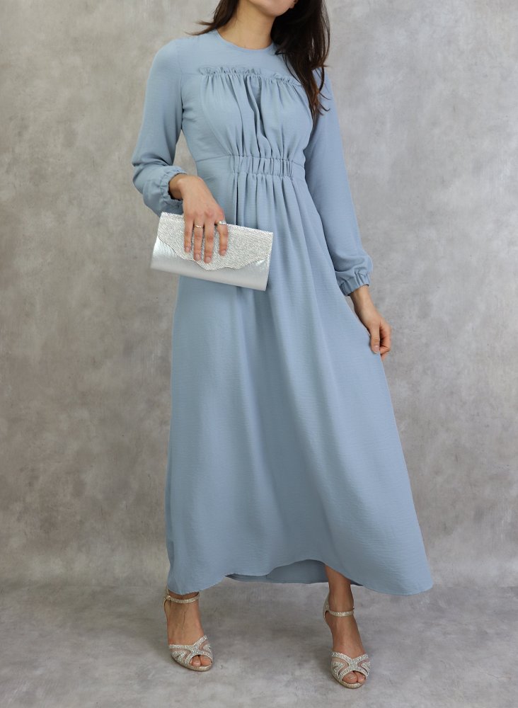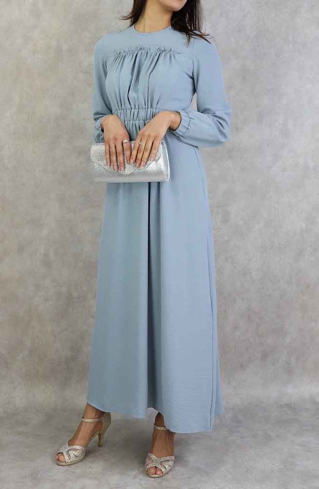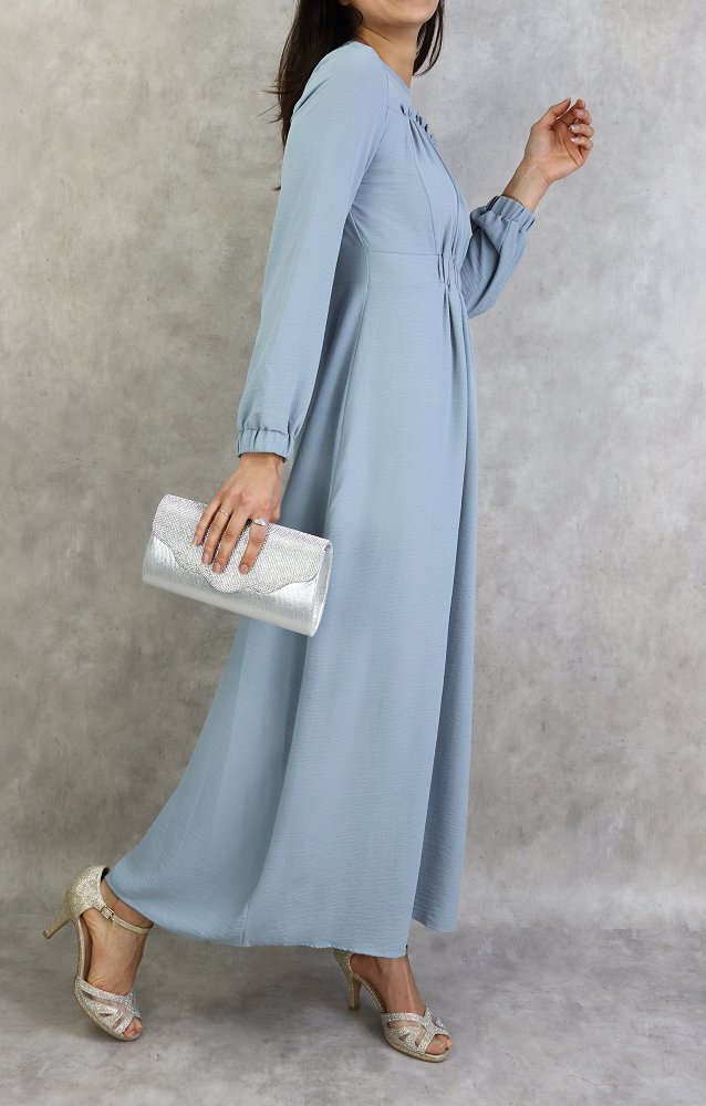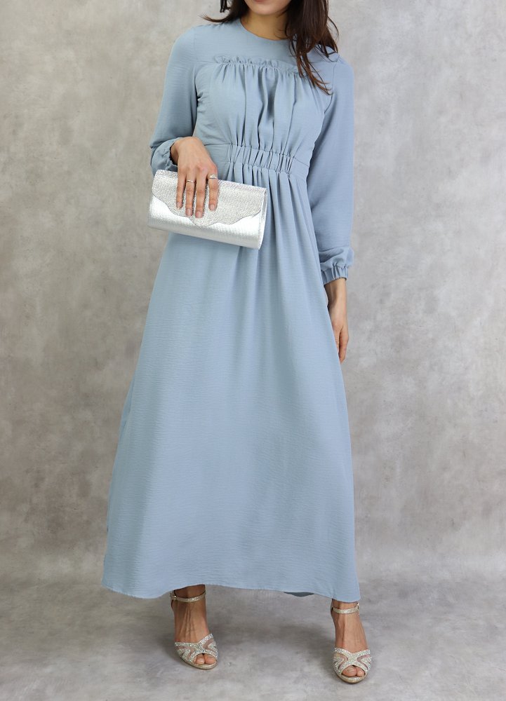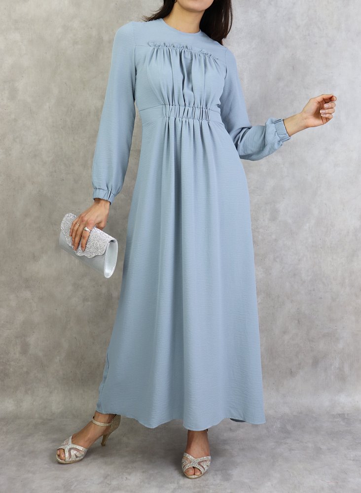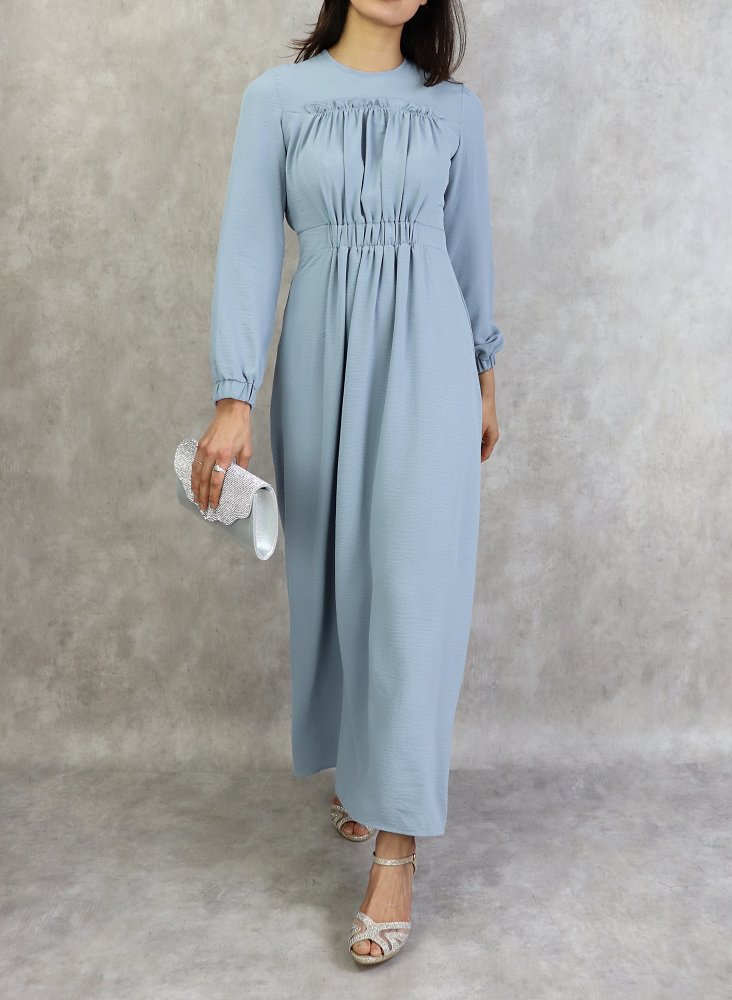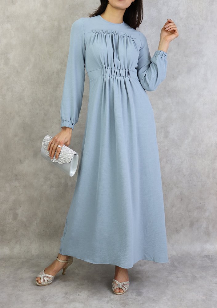 Robe longue couleur unie, tissu fluide de type crêpe, taille élastiquée à l'avant. Encolure ronde. Manches longues poignets élastiques