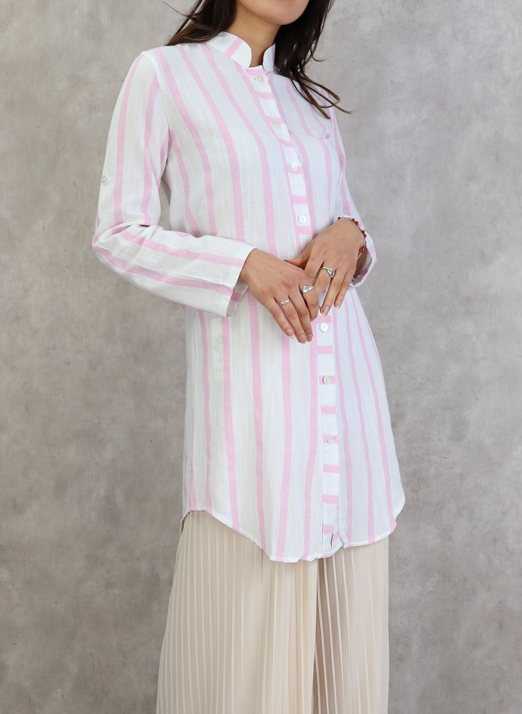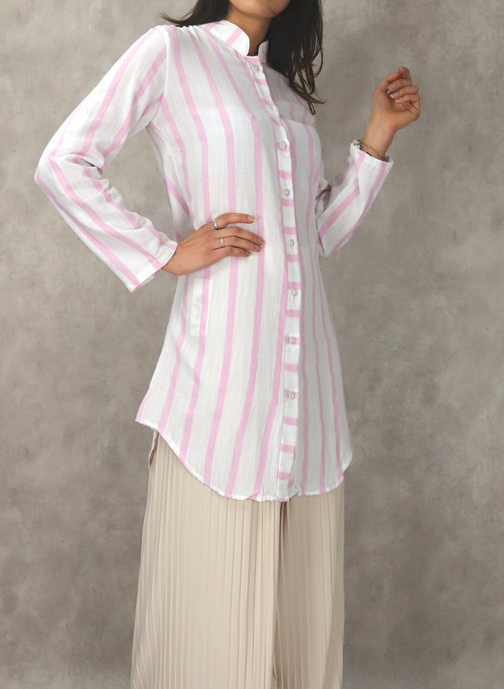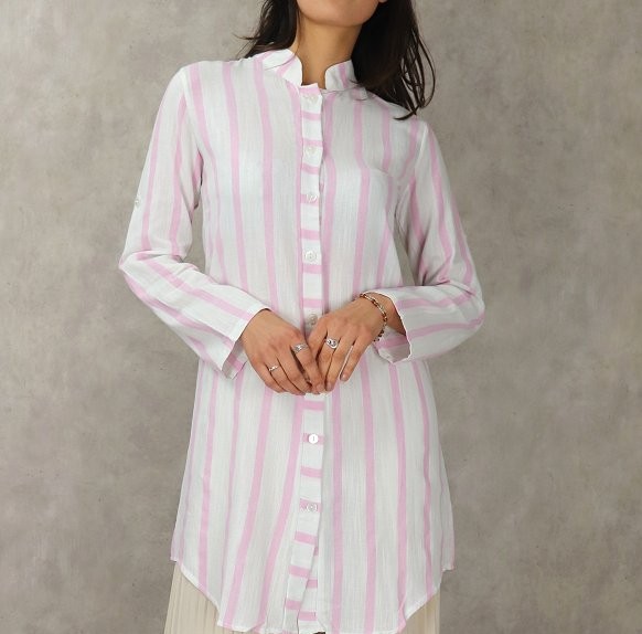 Chemise mi longue, col mao, manches ajustables (retroussables), fermeture boutons, tissu coton.