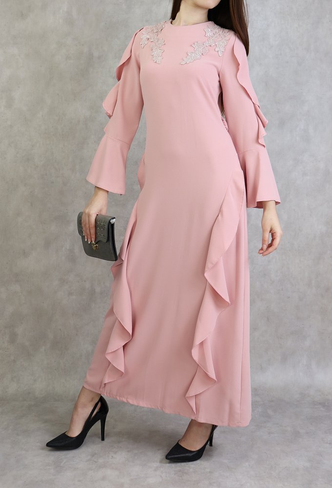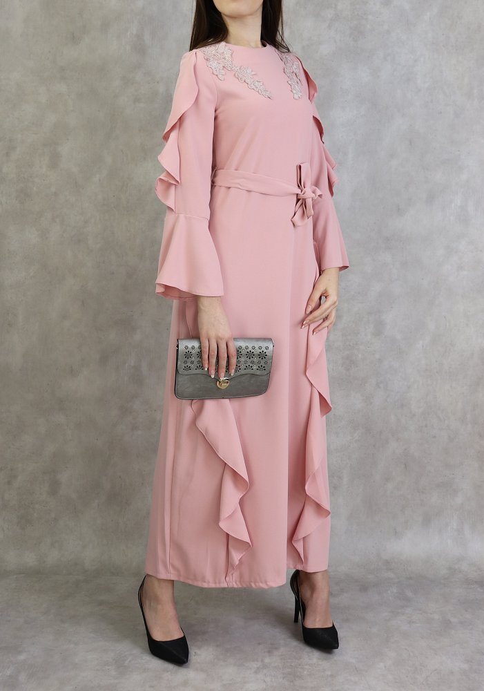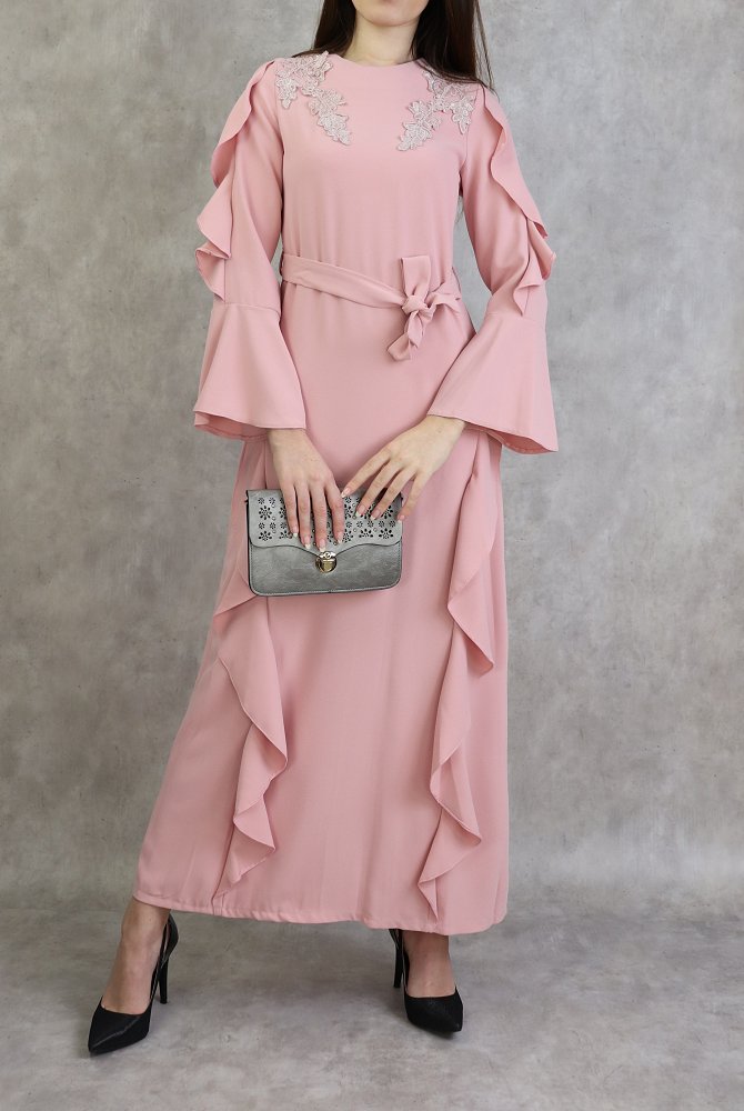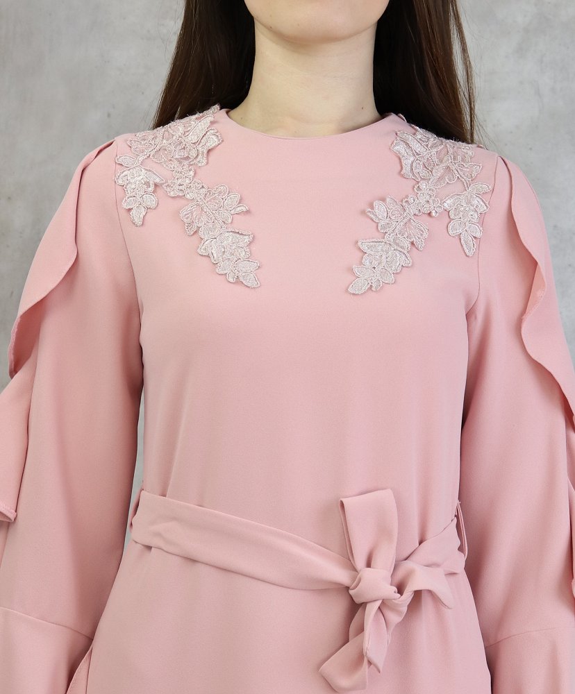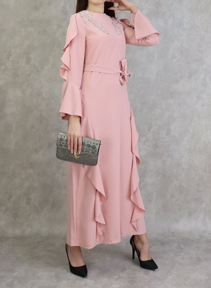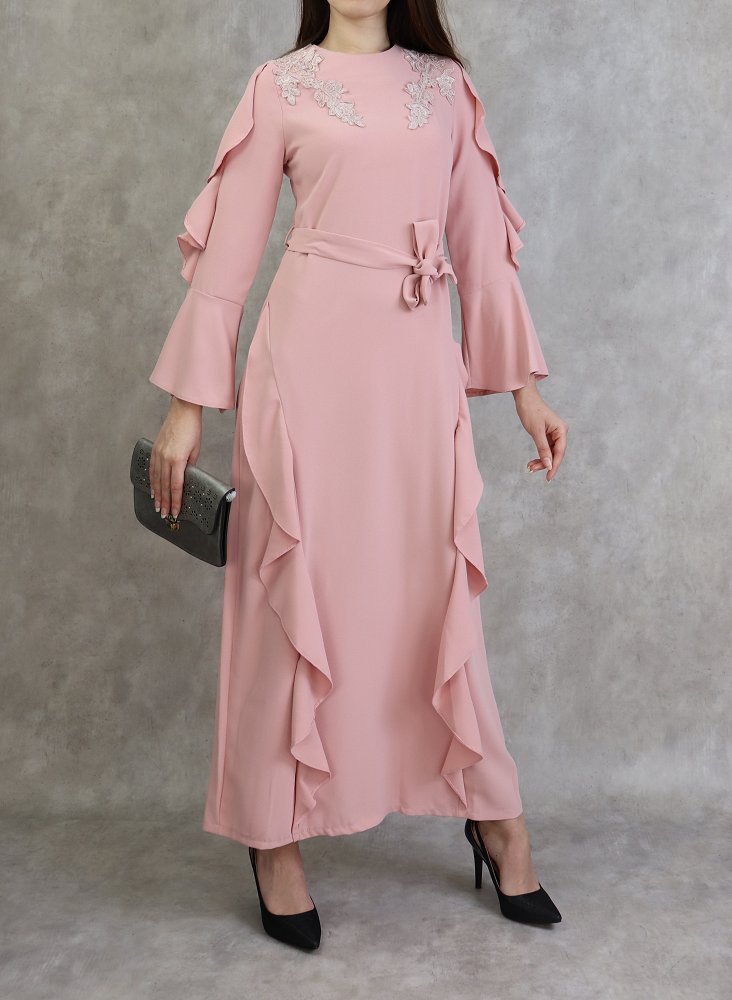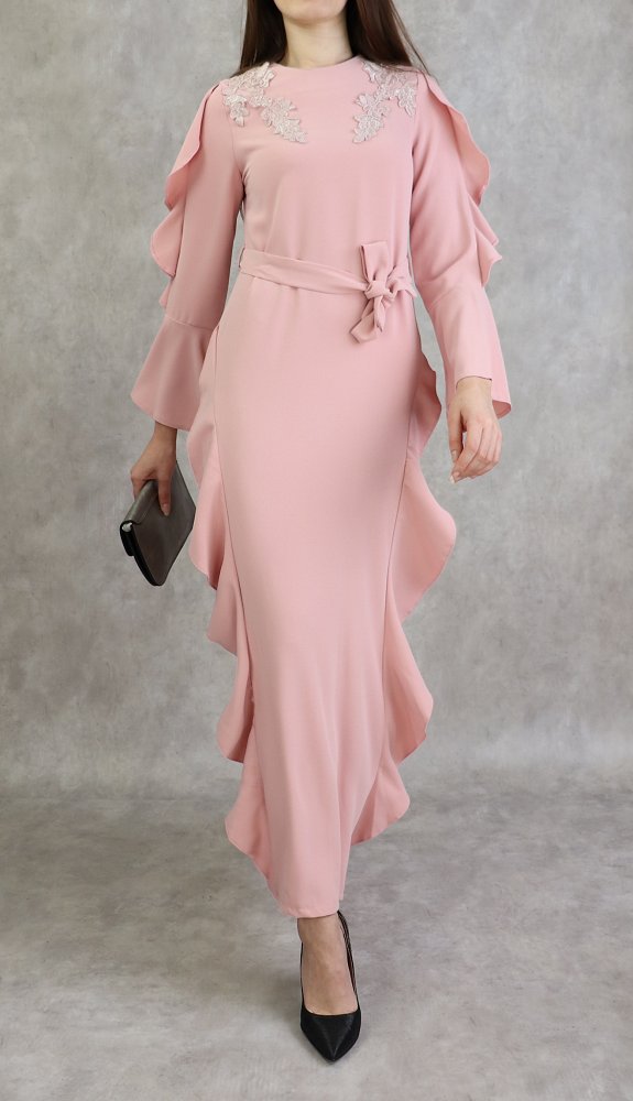 Robe longue, col rond, fermeture éclair au dos, broderies sur les épaules, manches longues, poignets évasés, ceinture assortie à passants. Coupe droite, tissu fluide et opaque, finitions froufrous sur les manches et la longueurs.