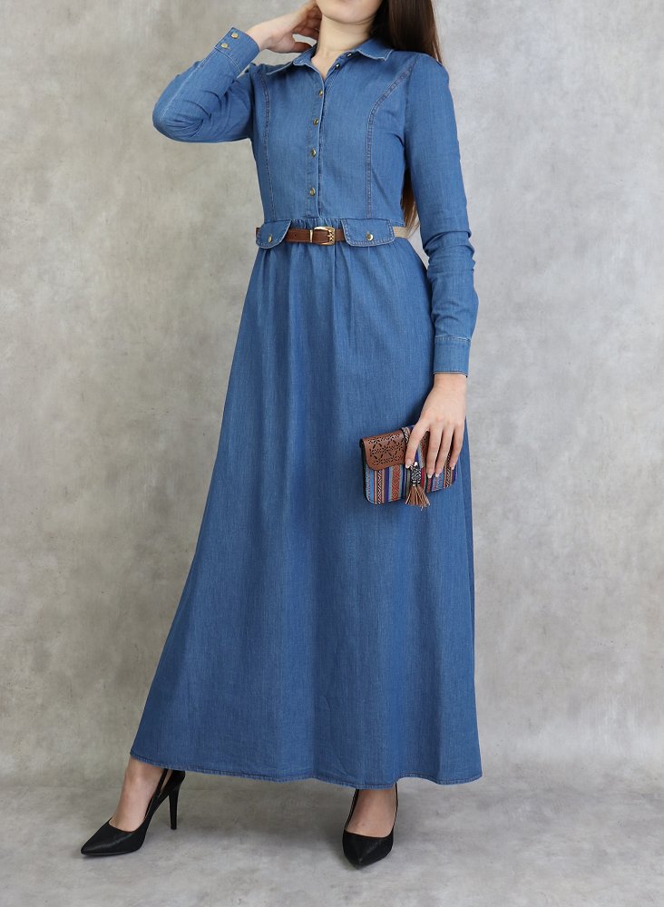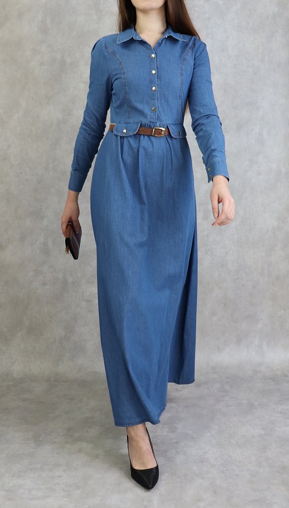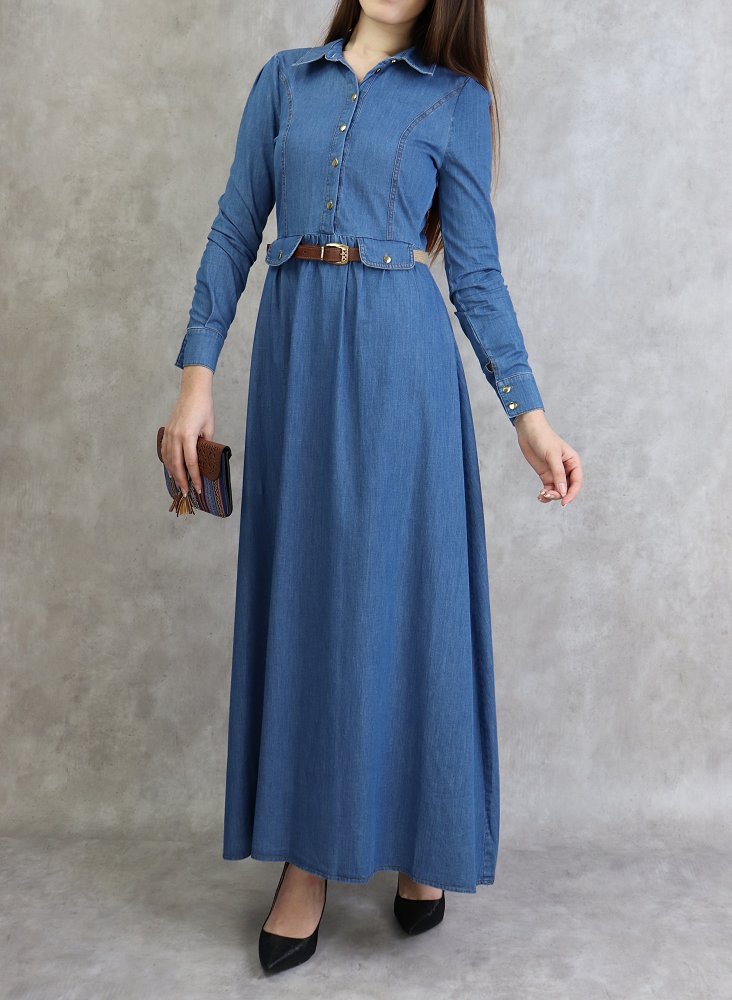 Robe longue, col chemise, fermeture boutons sur le buste, manches longues finition boutons aux poignets, taille cintrée, ceinture à passants. Coupe évasée vers le bas, tissu effet jean.