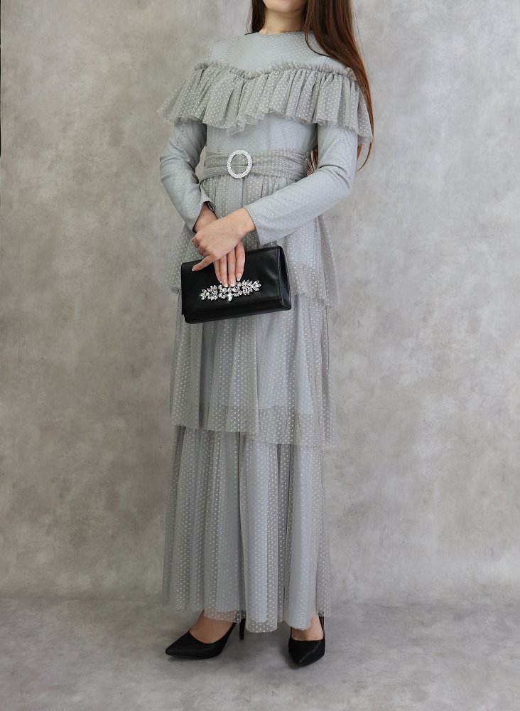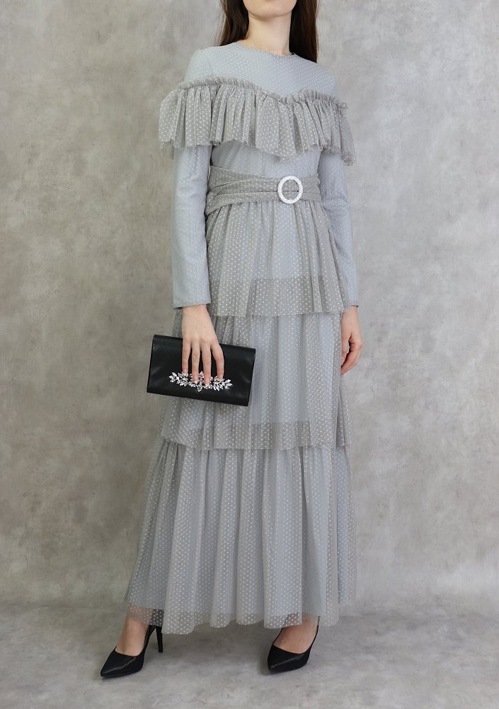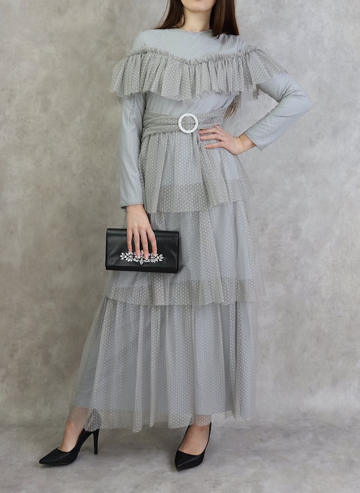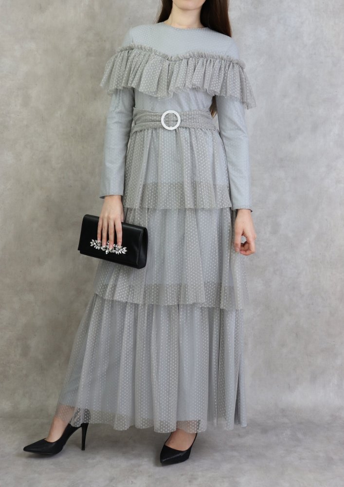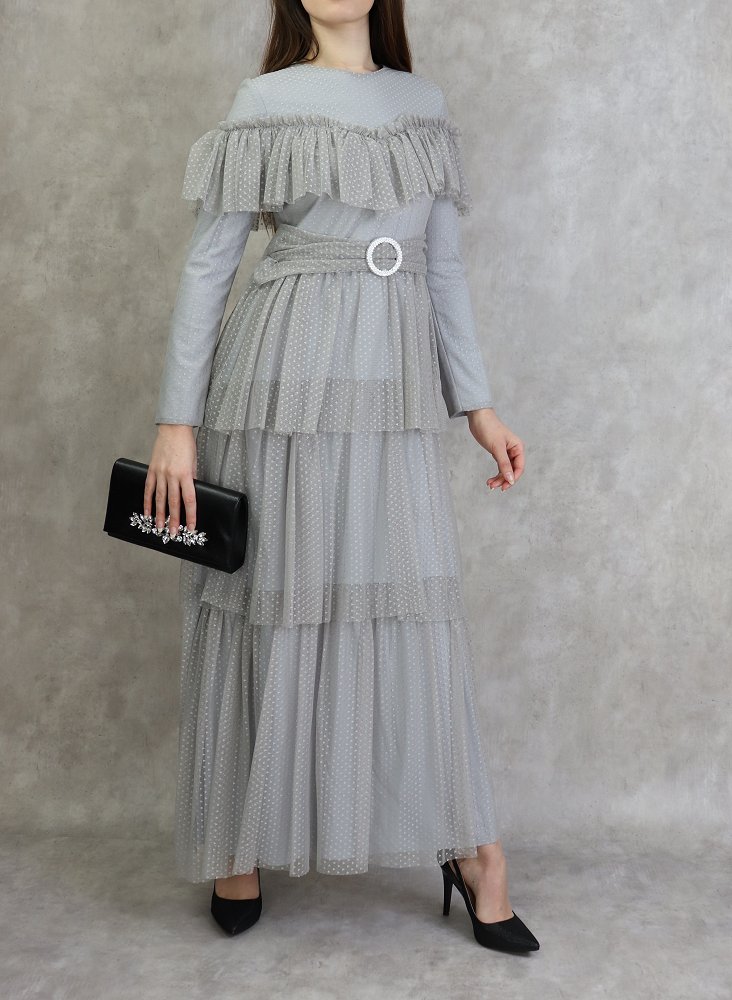 Robe longue, col rond, taille élastique, ceinture d'ornement en strass, fermeture glissière au dos, entièrement doublée, tissu extérieur effet tulle avec volants.