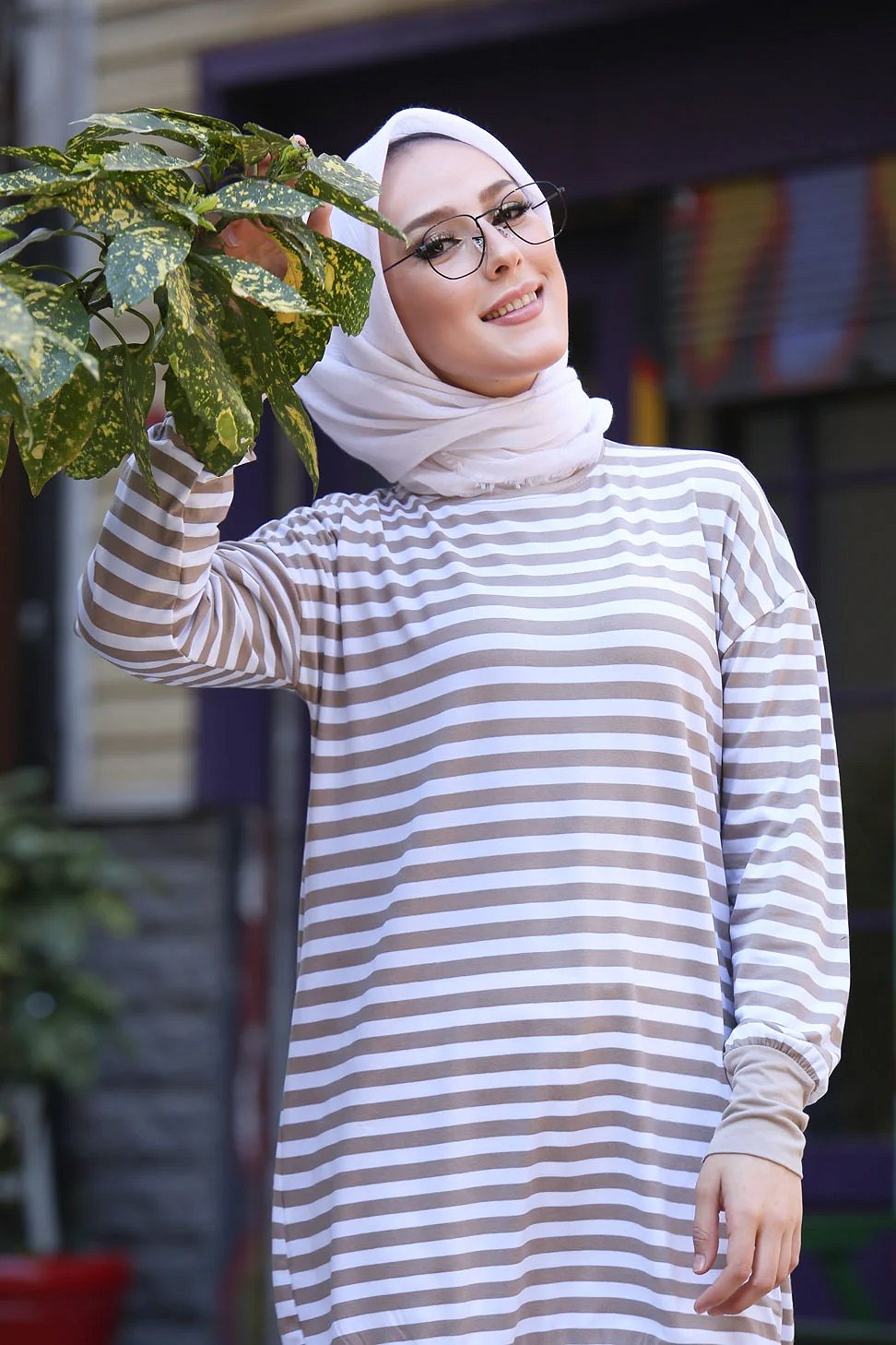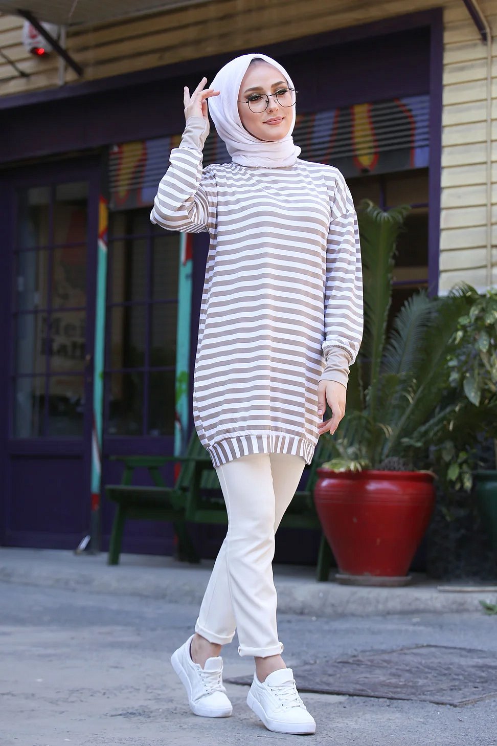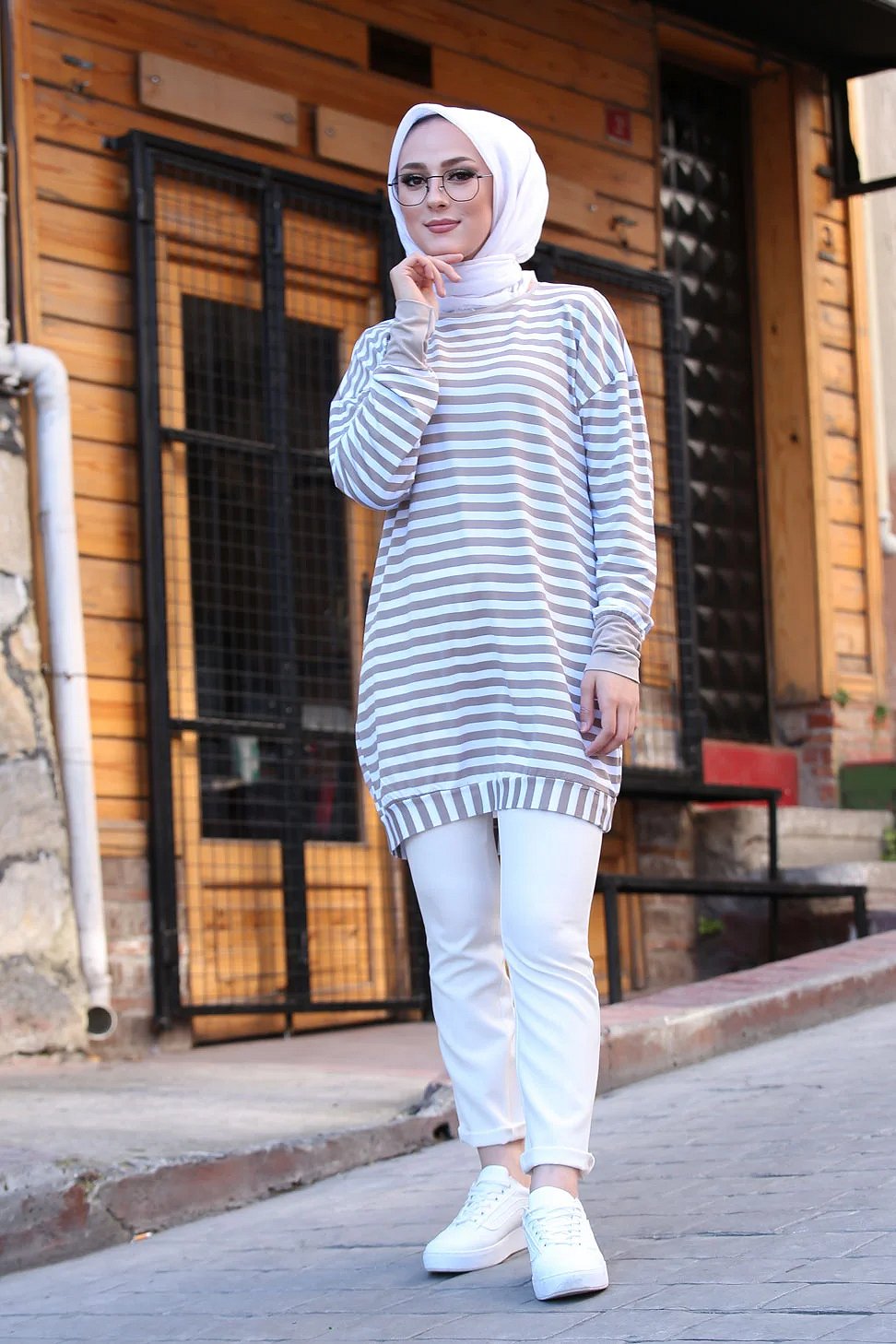 Pull - Tunique longue à rayures (Vêtement moderne femme voilée) - Couleur beige et blanc Vetement & Accessoire