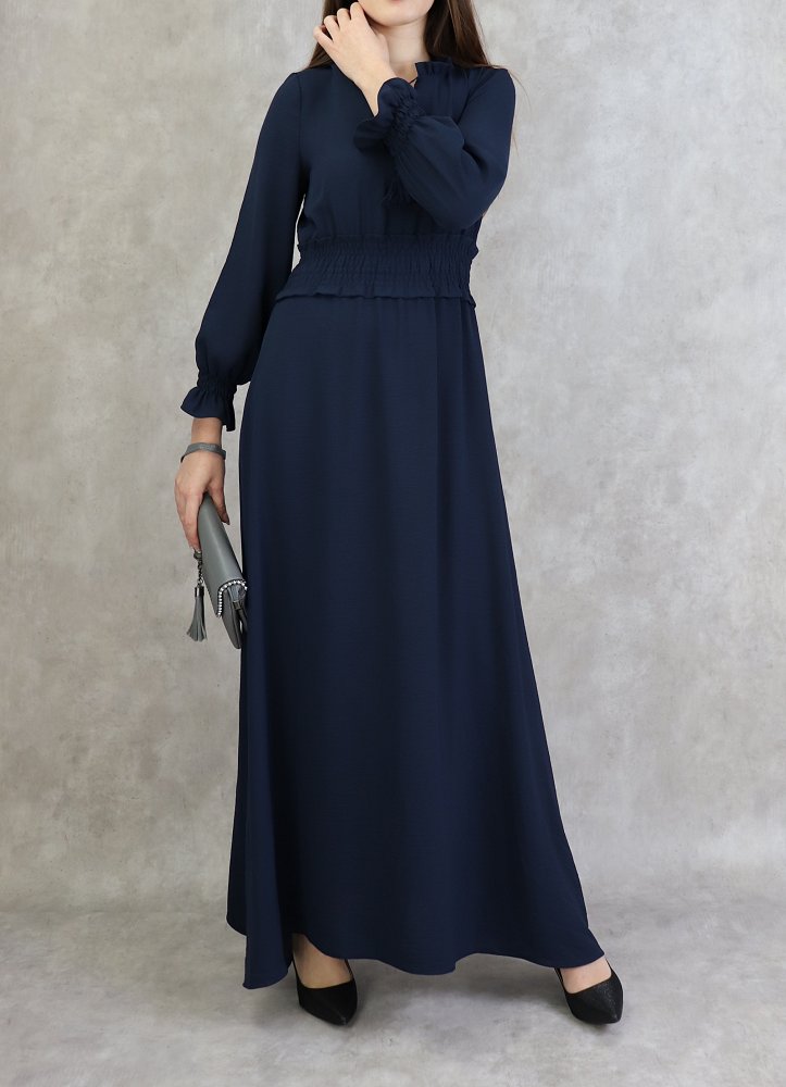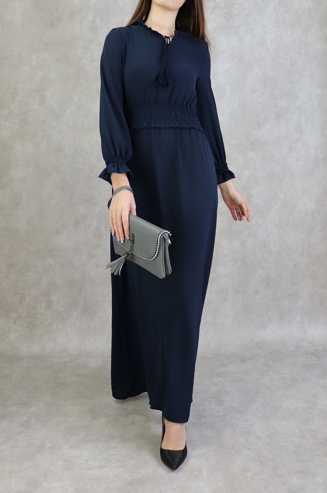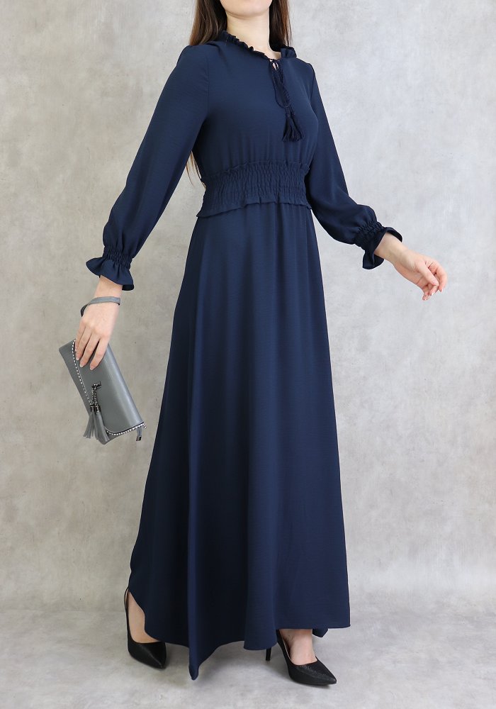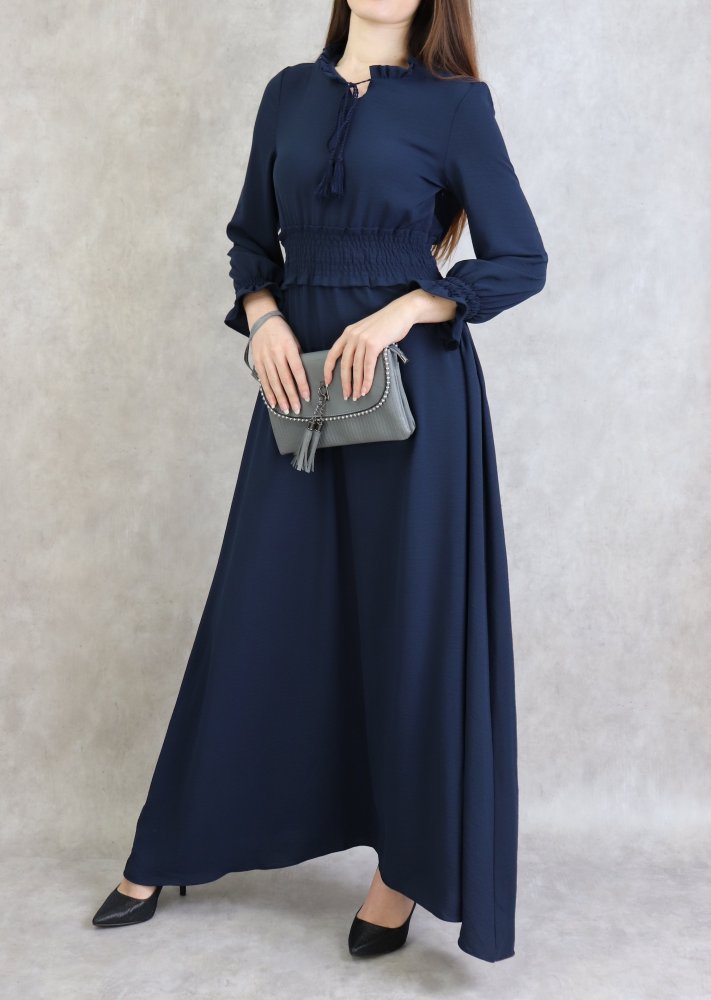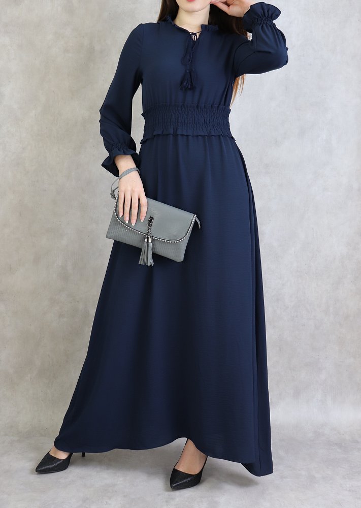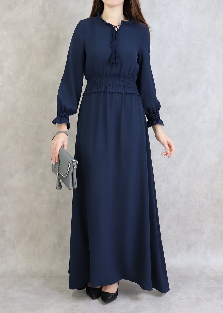 Robe longue, col semi ouvert, fermeture cordons avec pompons, manches finition élastiques, fermeture à glissière sur le coté, taille cintrée et élastique tissu fluide, léger et opaque.