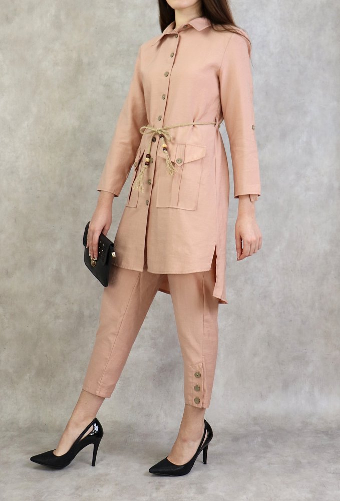 Ensemble 2 pièces. Veste : mi longue, col chemise, fermeture boutons, manches ajustables, ceinture tressée ornée de perles en bois, 2 poches plaquées à rabats. Pantalon : coupe droite, fermeture à glissière, boutons sur le bas. Tissu léger et opaque, effet tissé.