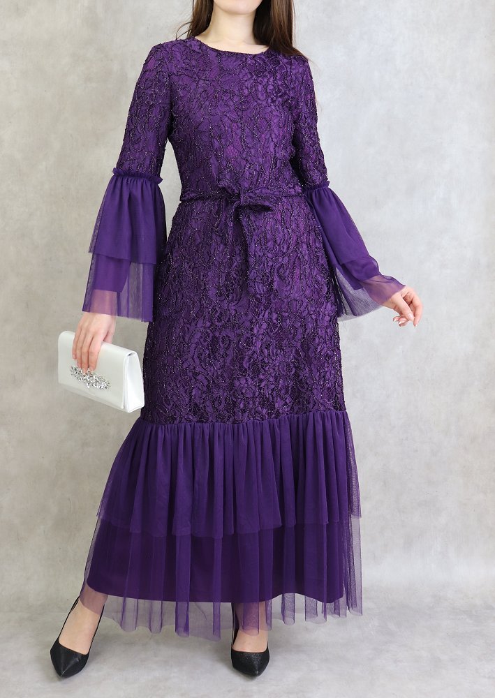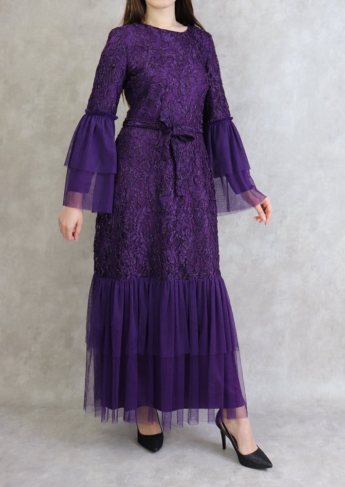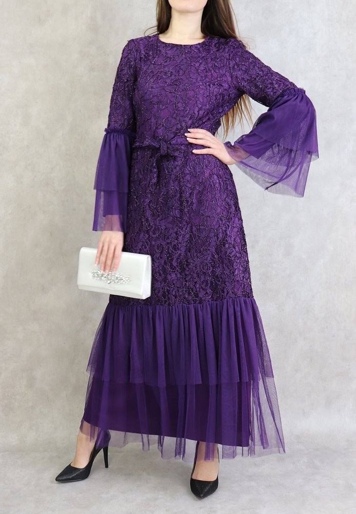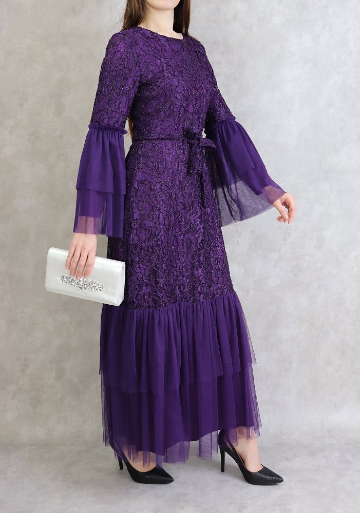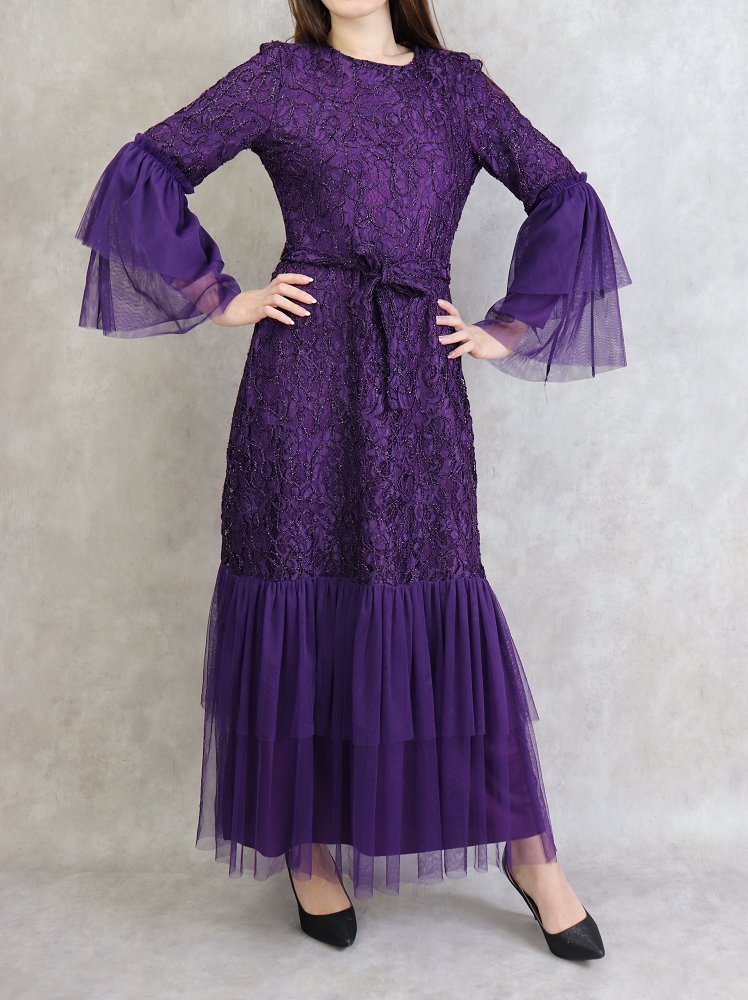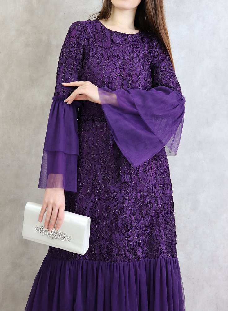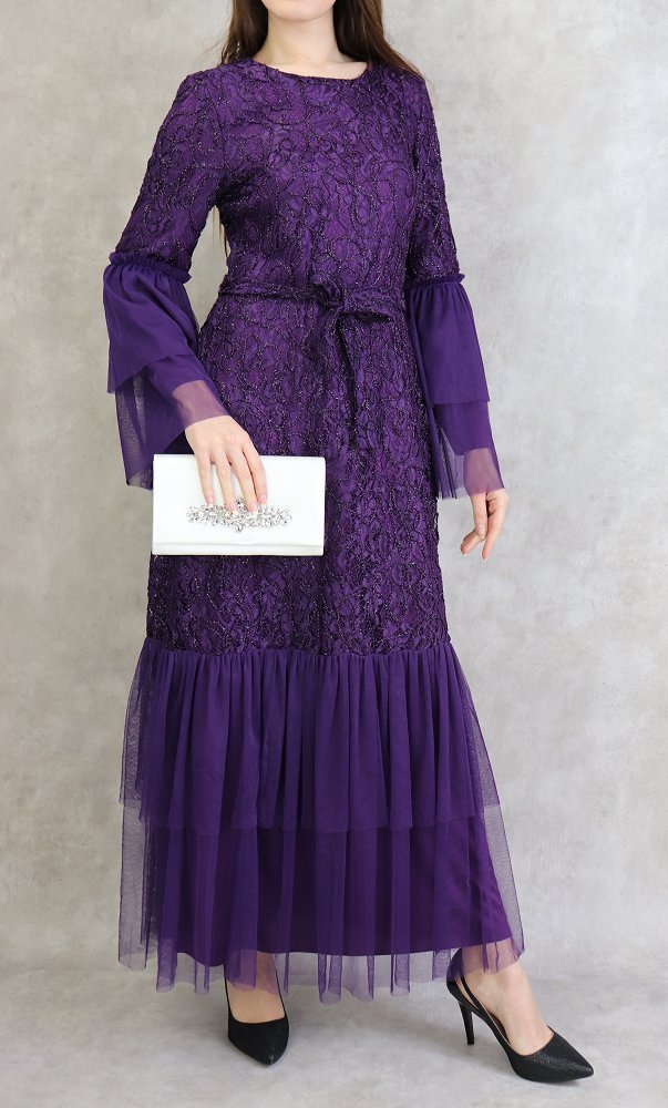 Robe longue, col rond, manches finition cloches, fermeture à glissière dans le dos, entièrement doublée, broderies sur tout la longueur et une partie des manches, tulle effet volant sur la partie basse.