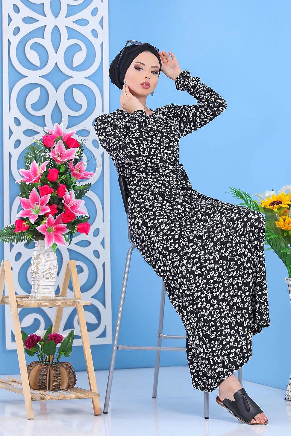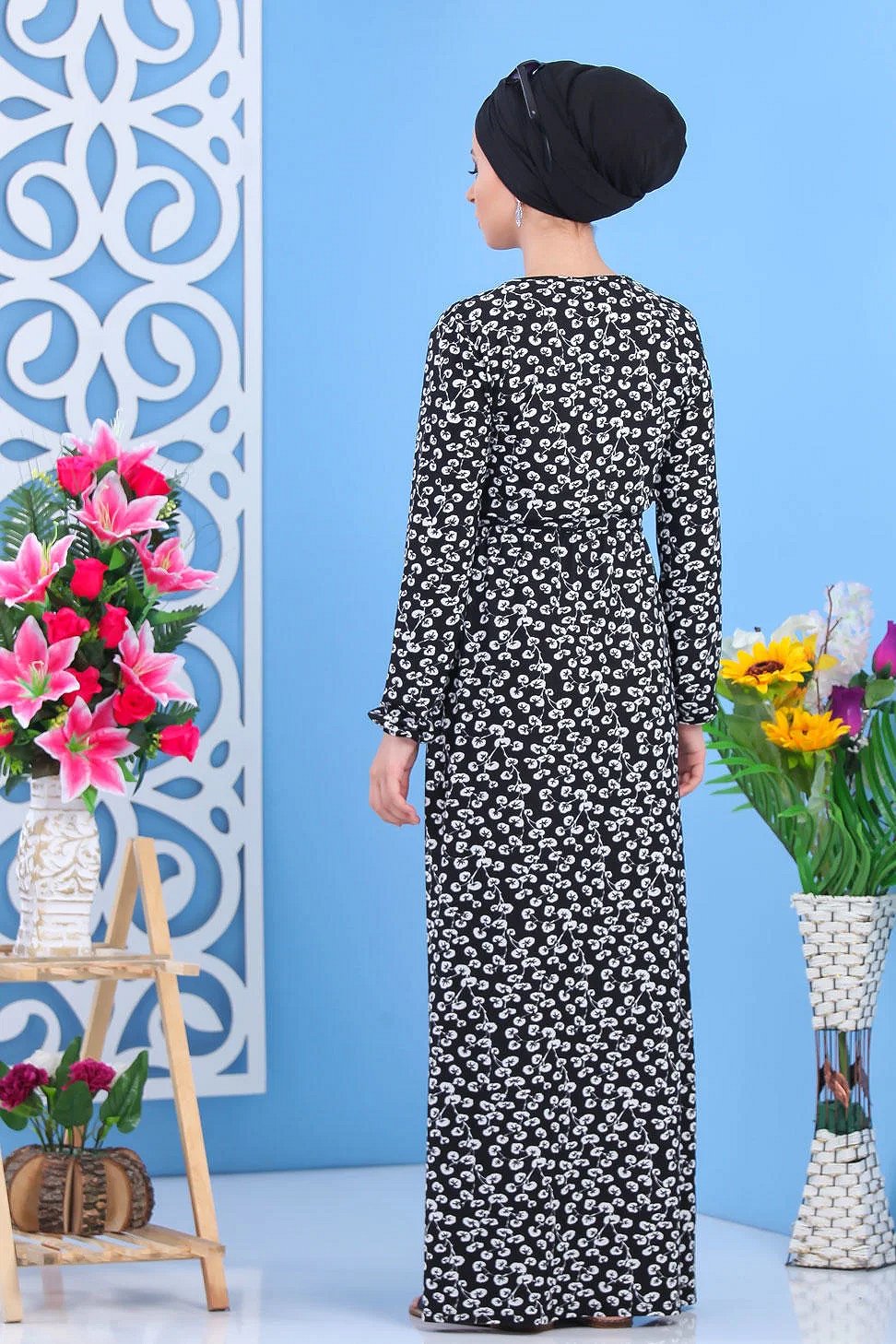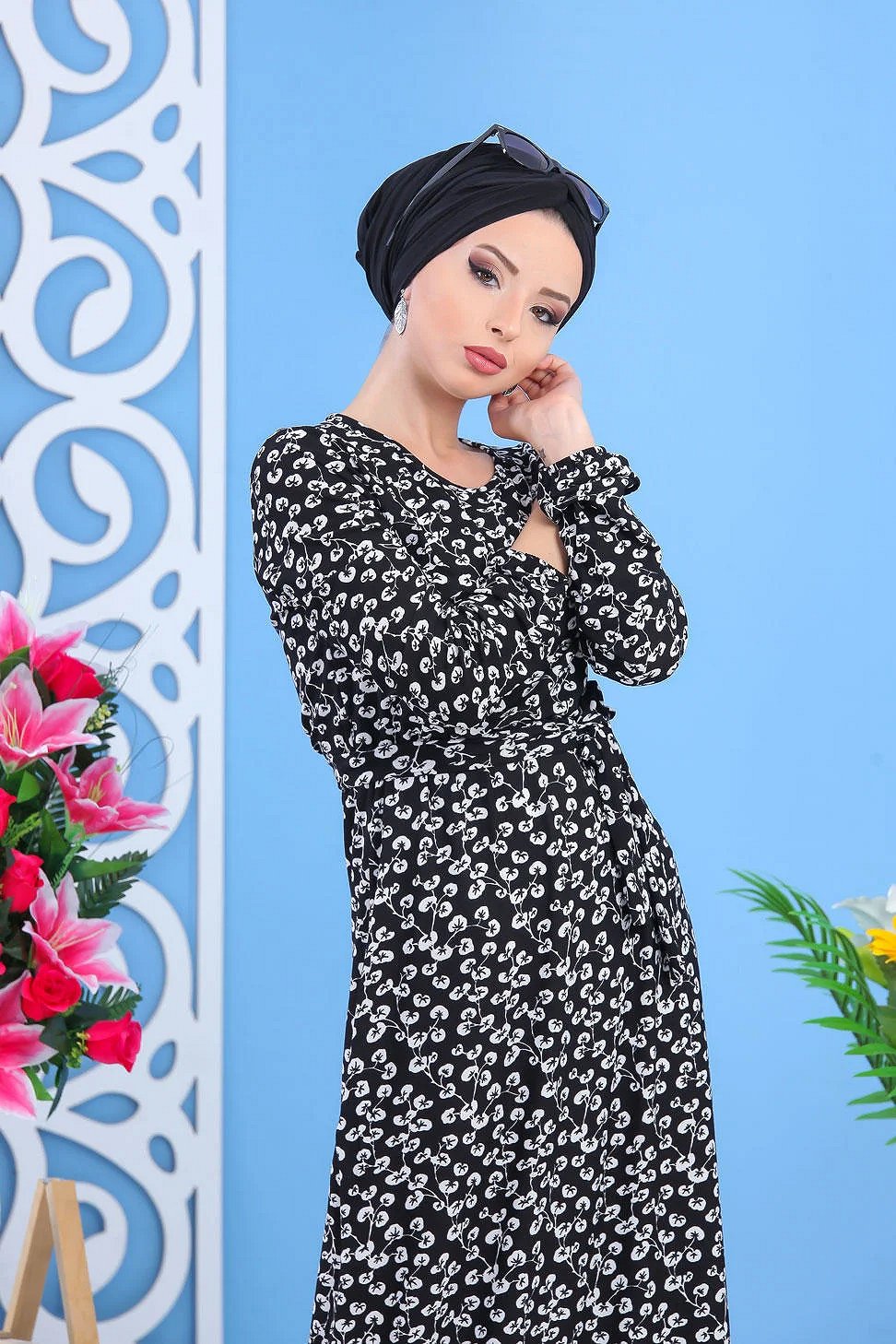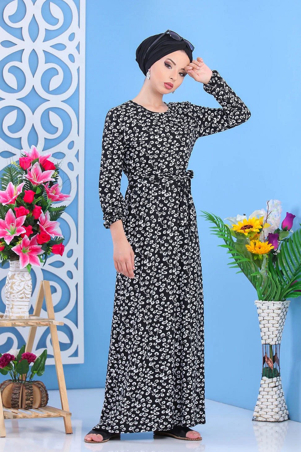 Robe longue "Maxi Dress", imprimés nénuphar de couleur blanc, col rond, élastiques a la taille et aux poignets, accommodée d'une ceinture, coupe évasée.
