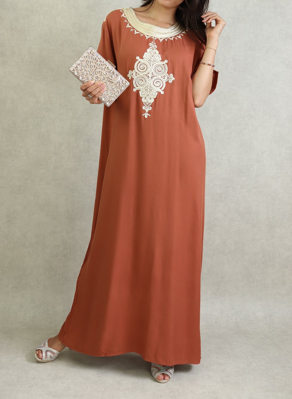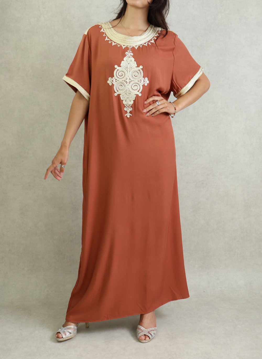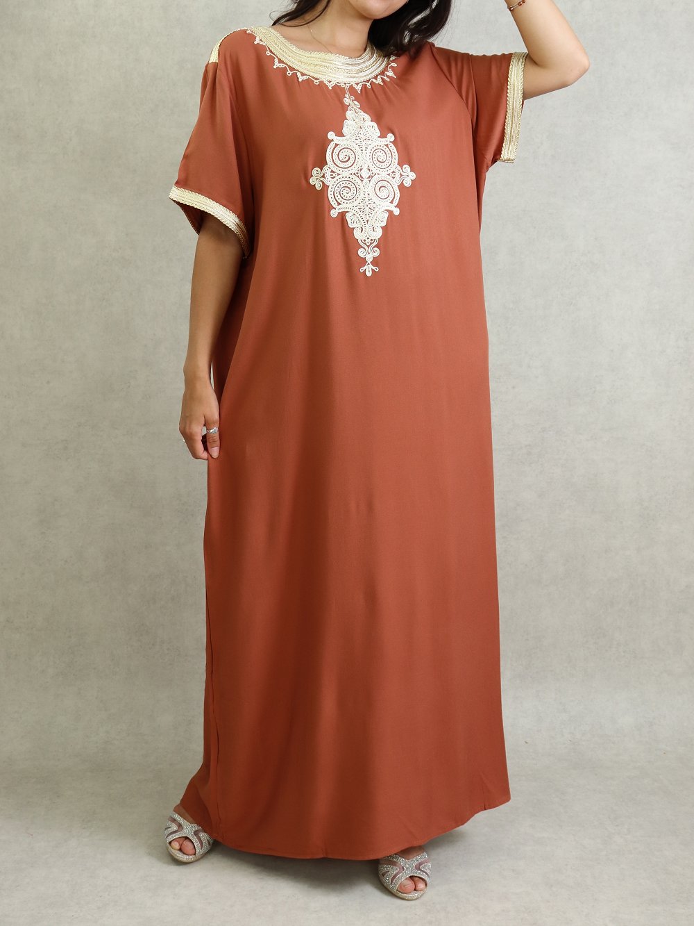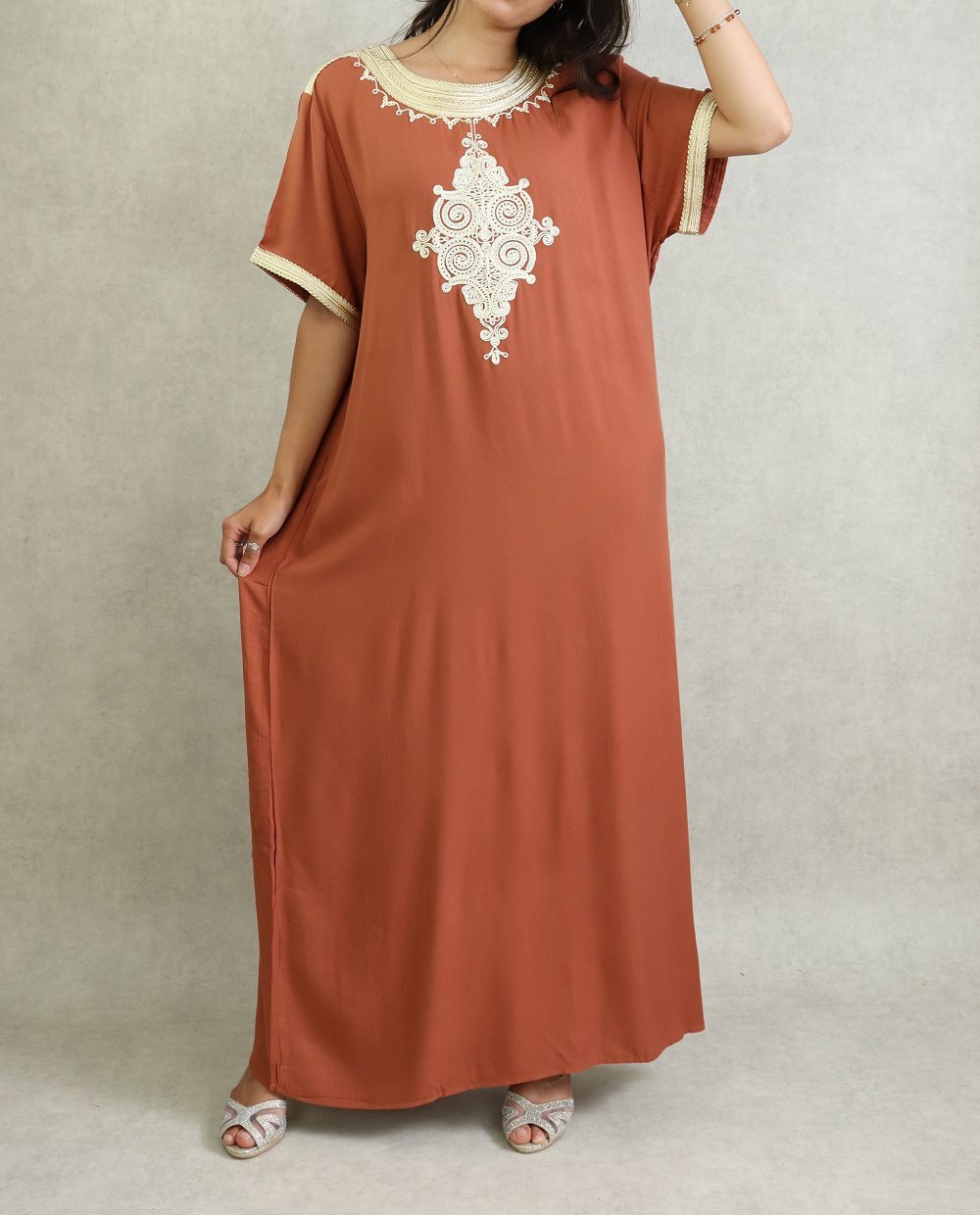 Une robe longue très confortable, manches courtes. Coupe droite avec nombreuses broderies. Matière fluide et agréable de type coton idéale pour la maison et la chaleur de l'été.