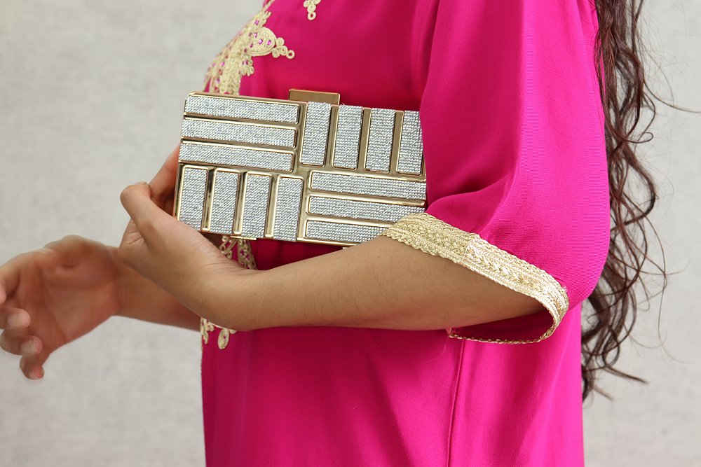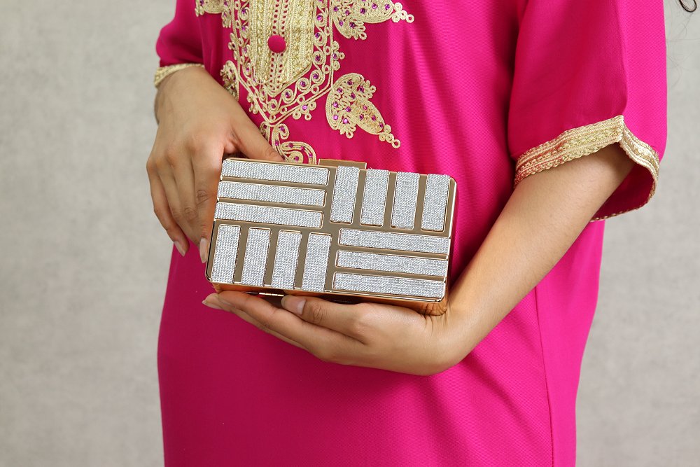 Sac à main rigide avec strasse élégant et léger à porter. Parfait pour événement spécial : mariage, soirée, cérémonie, fêtes... Ce sac rectangulaire ciselé. Bandoulière métallique. Fermeture par fermoirs-pression.