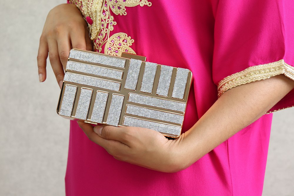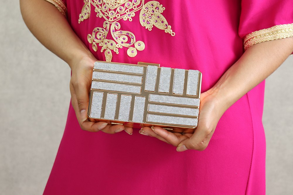 Pochette de luxe rigide - Sac a main femme pour mariage et soiree - Couleur Doree strass blanc argente