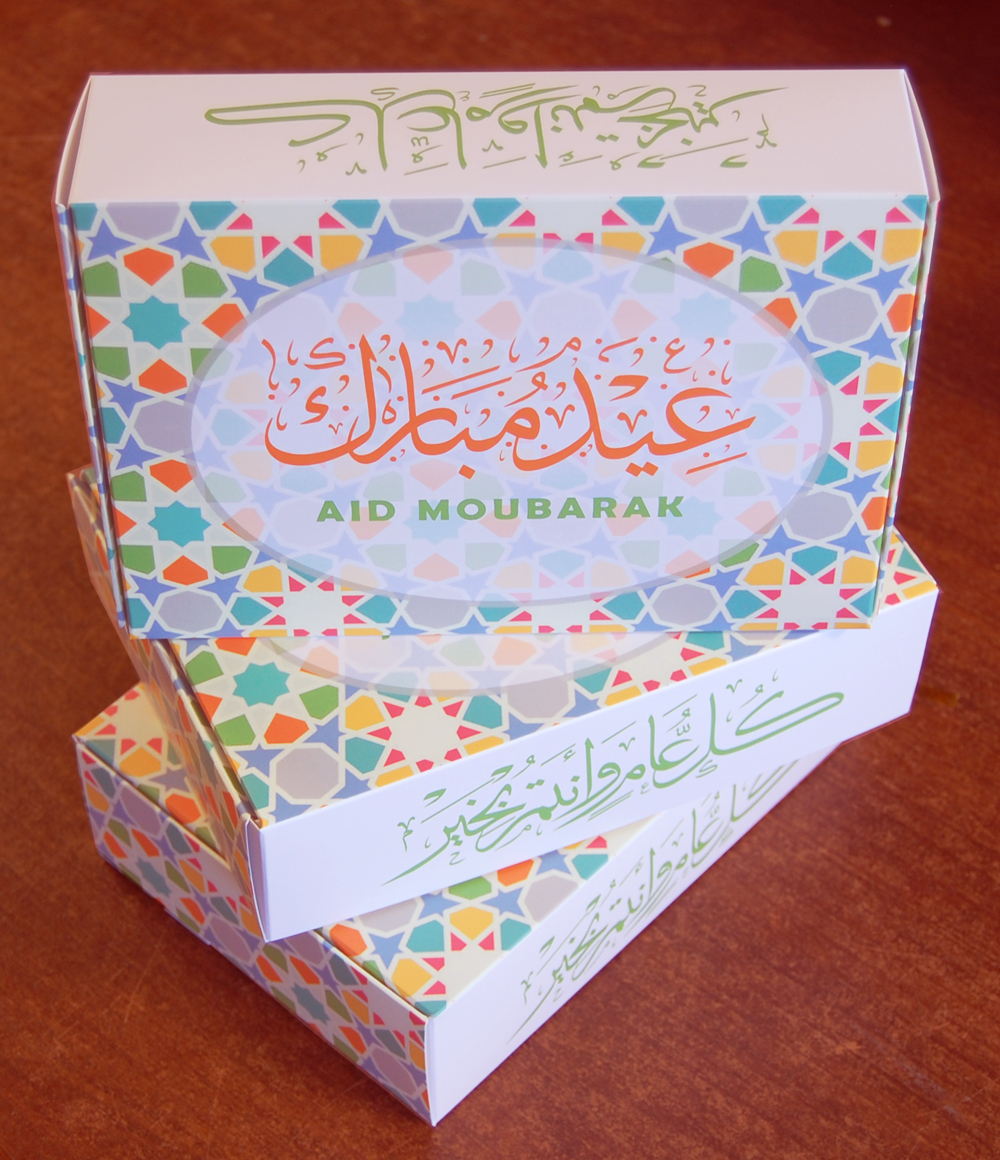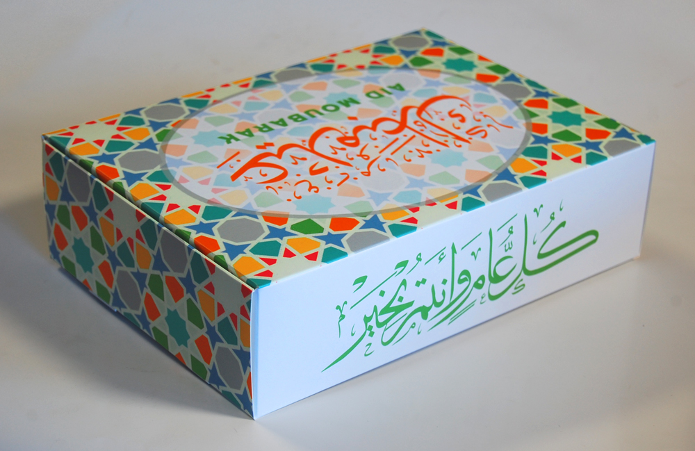 Les deux formules de félicitation suivantes qu'on utilise dans les différentes occasions islamiques sont écrites en calligraphie sur la boite : "عيد مبارك" et "كل عام وأنتم بخير".