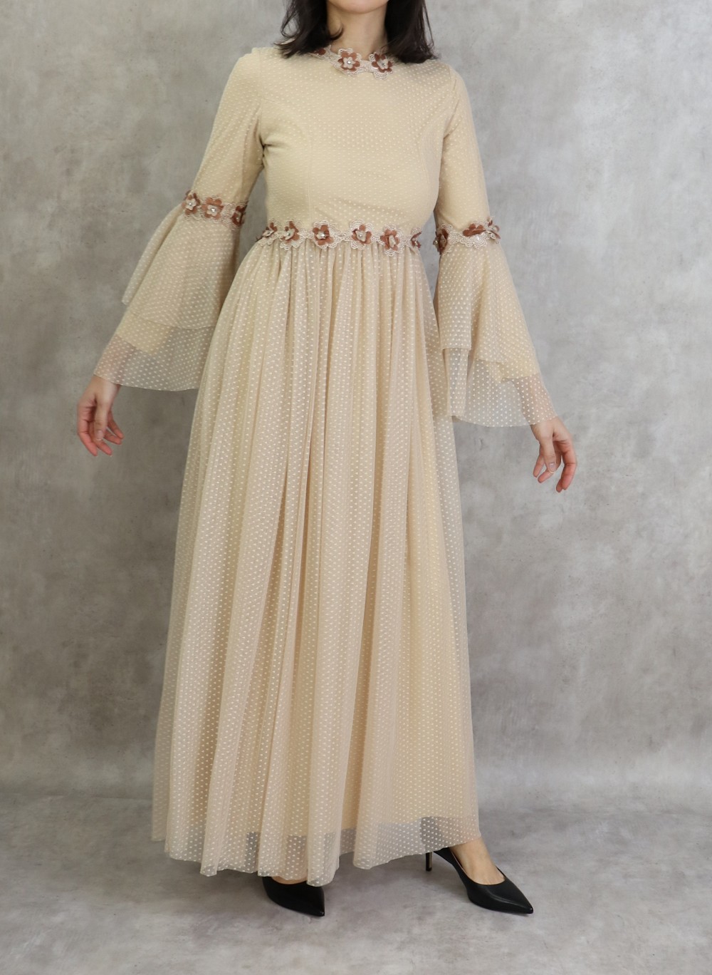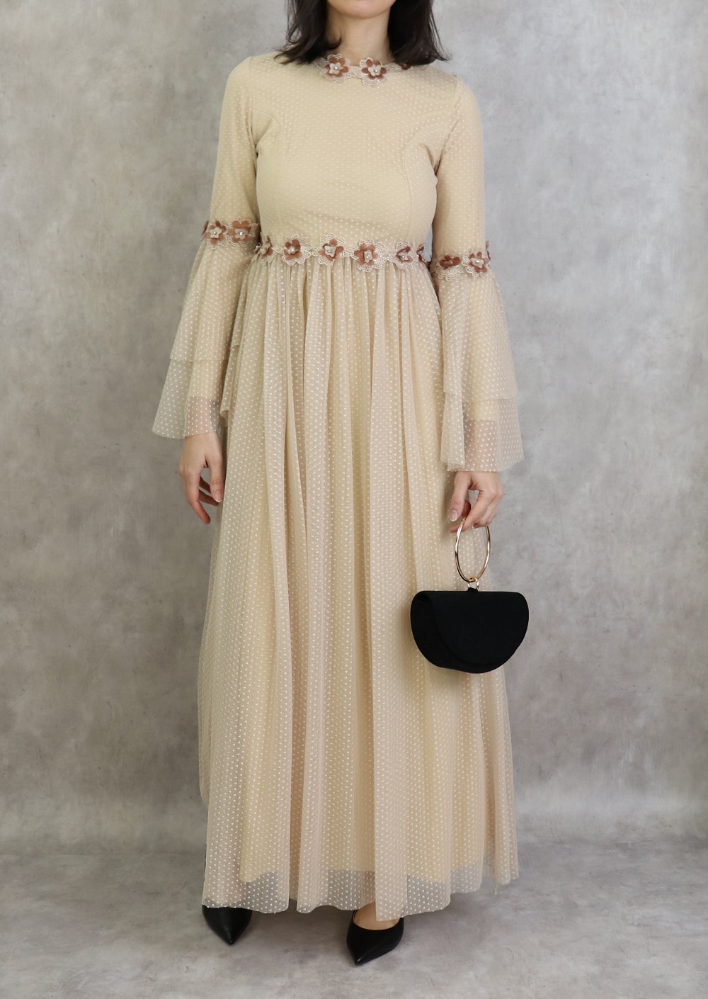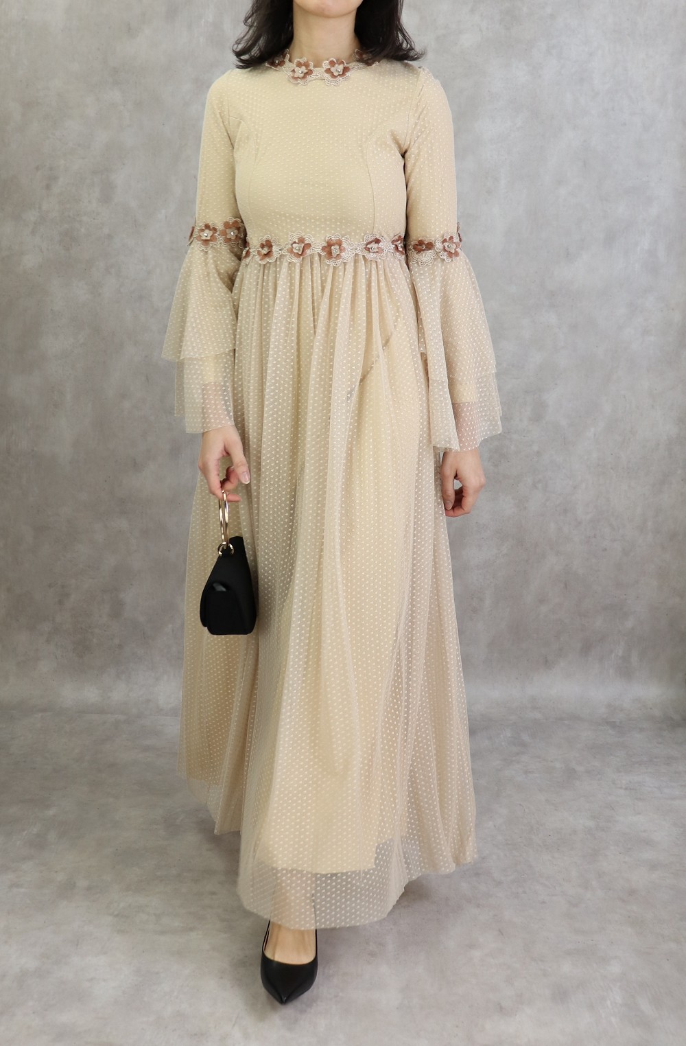 Robe longue, col rond décoré de fleurs et de strass ainsi que sur la taille, manches finition volants, Fermeture glissière au dos, entièrement doublée, tissu extérieur effet tulle.