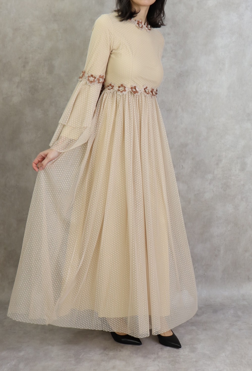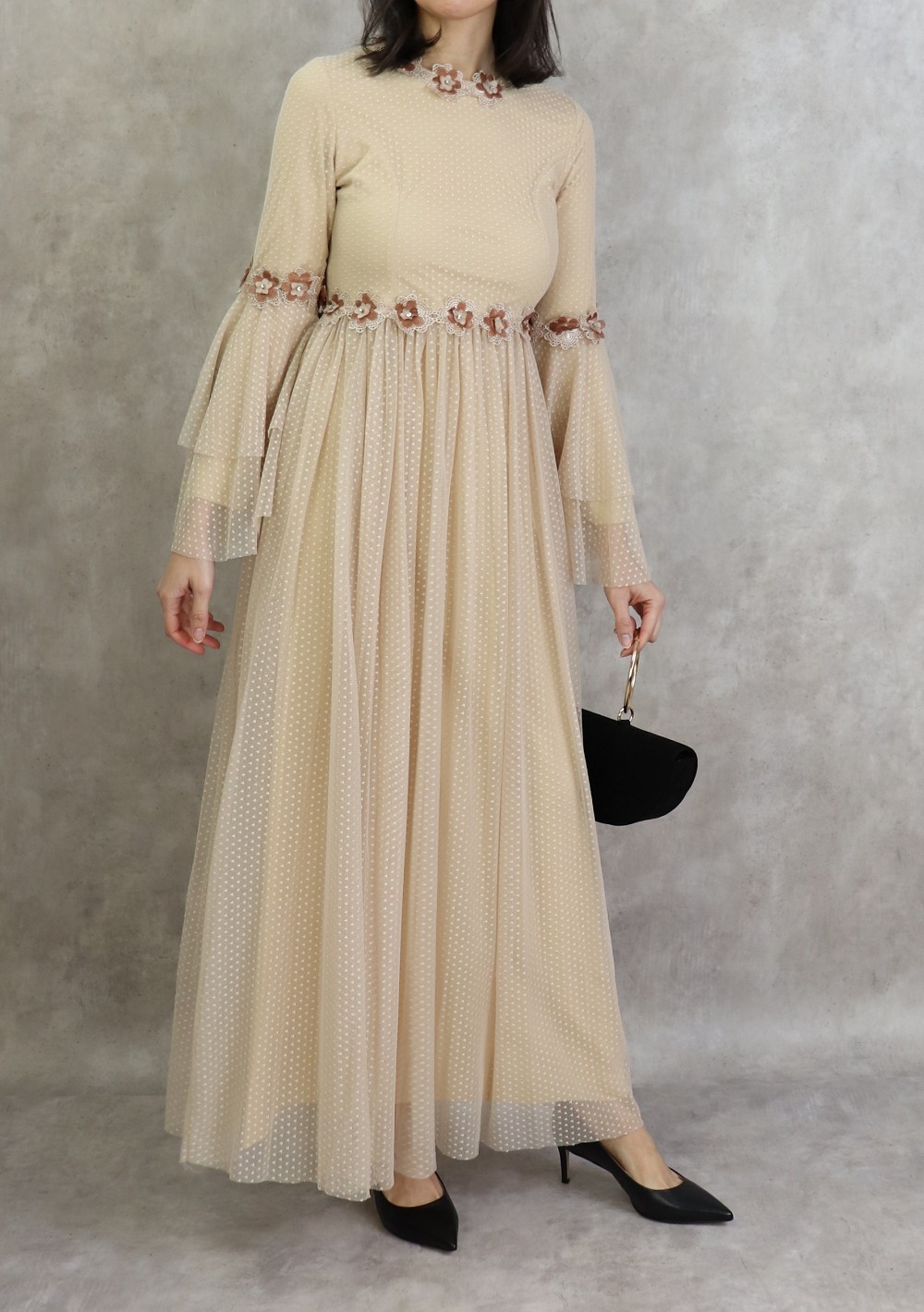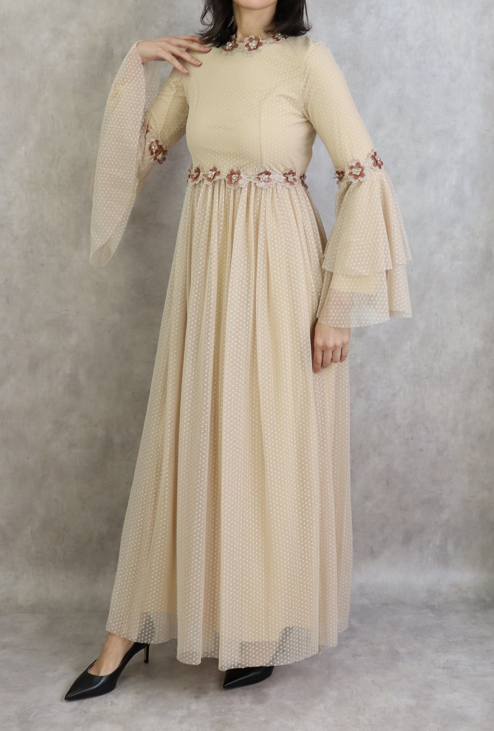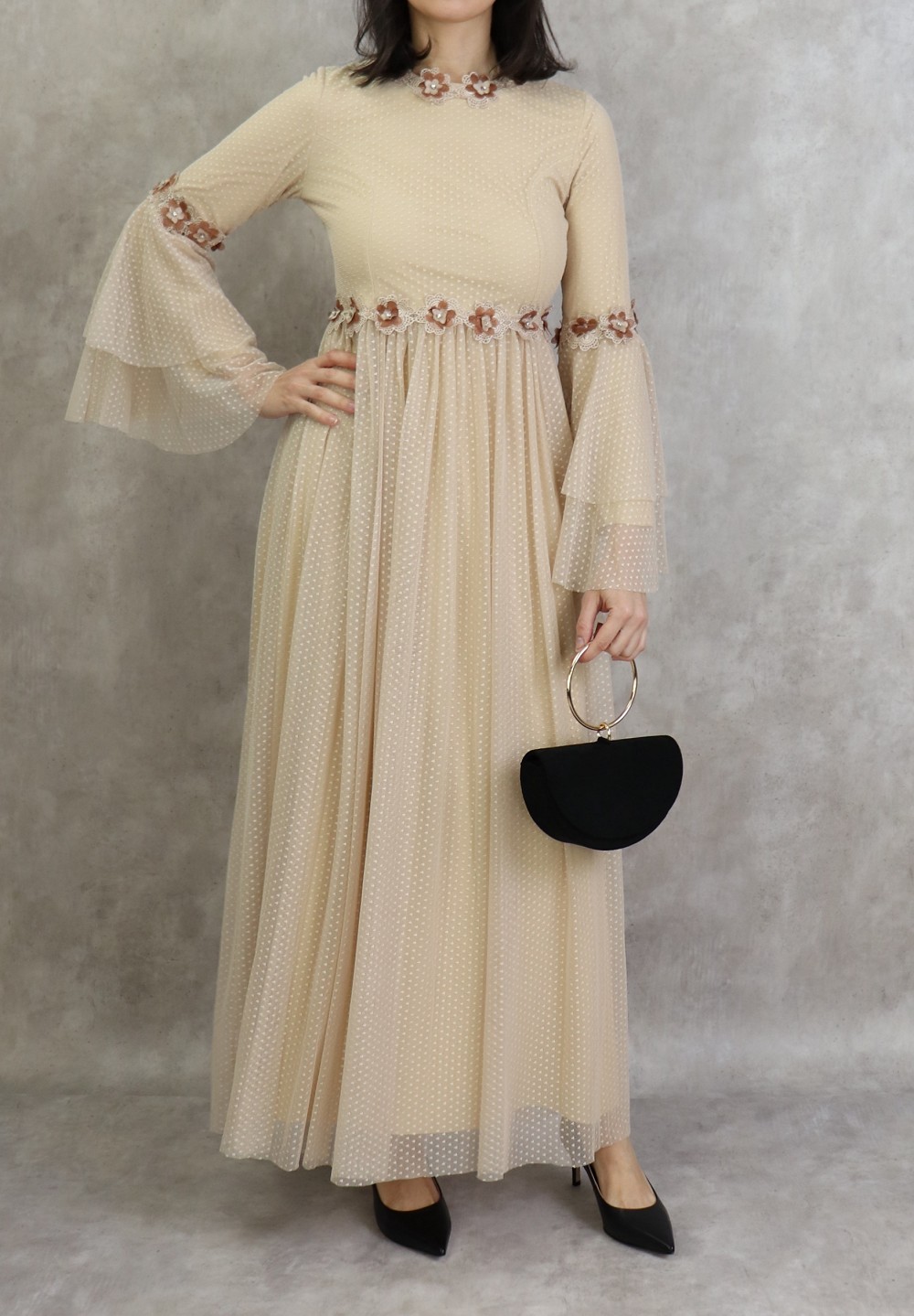 Robe longue, col rond décoré de fleurs et de strass ainsi que sur la taille, manches finition volants, Fermeture glissière au dos, entièrement doublée, tissu extérieur effet tulle.