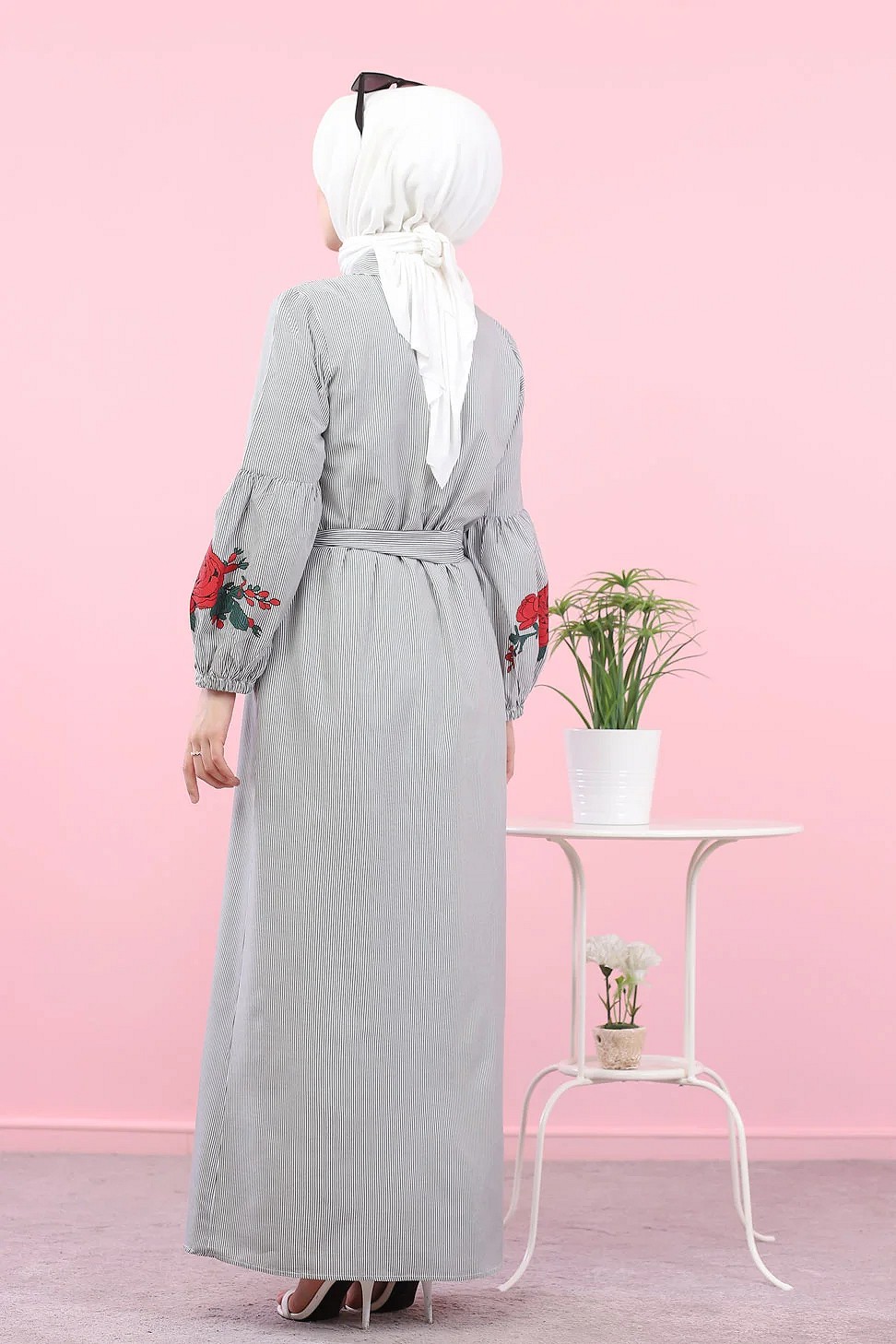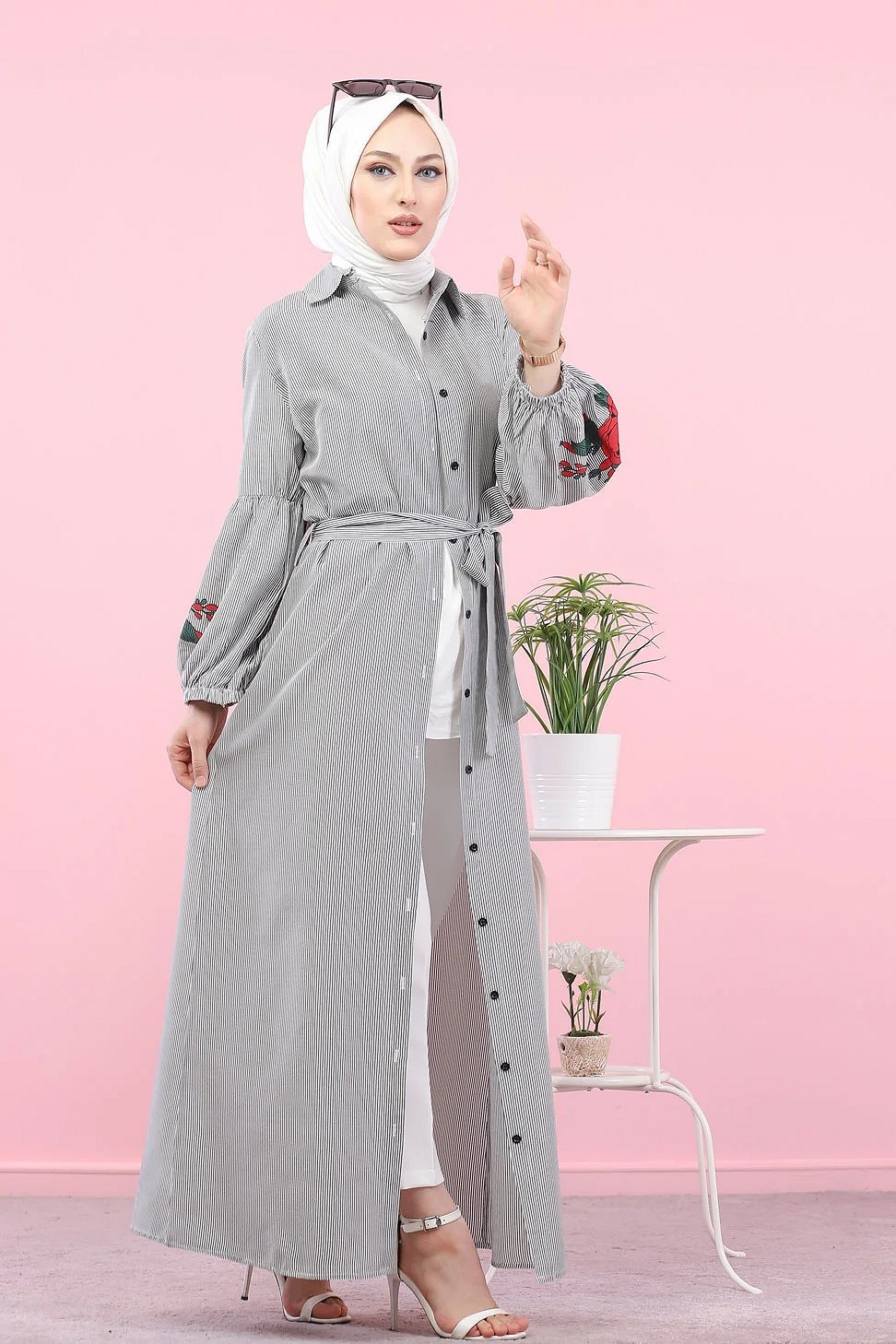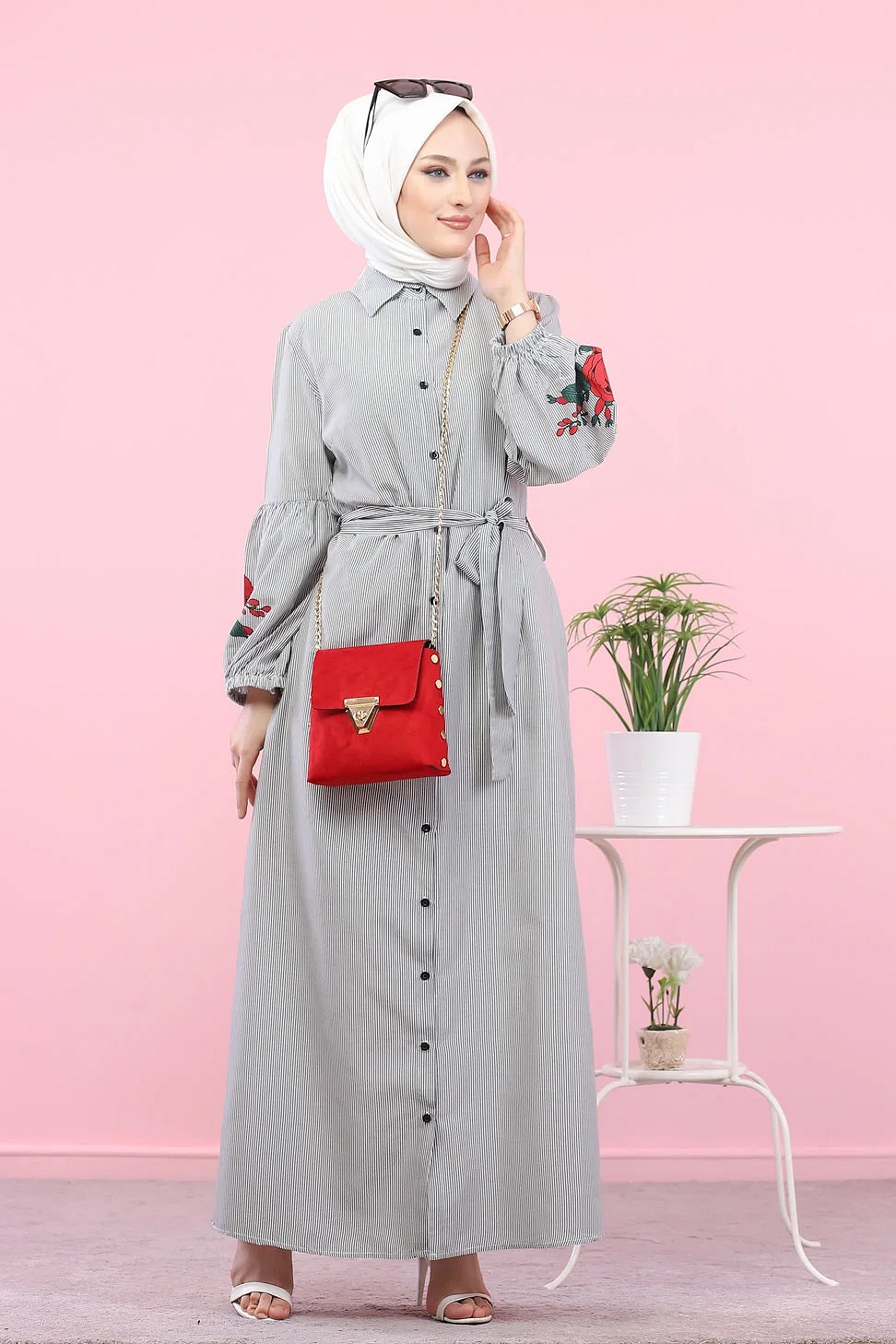 Robe chemise imprimee a rayures (Vetement hijab femme voilee) - Couleur gris et blanc