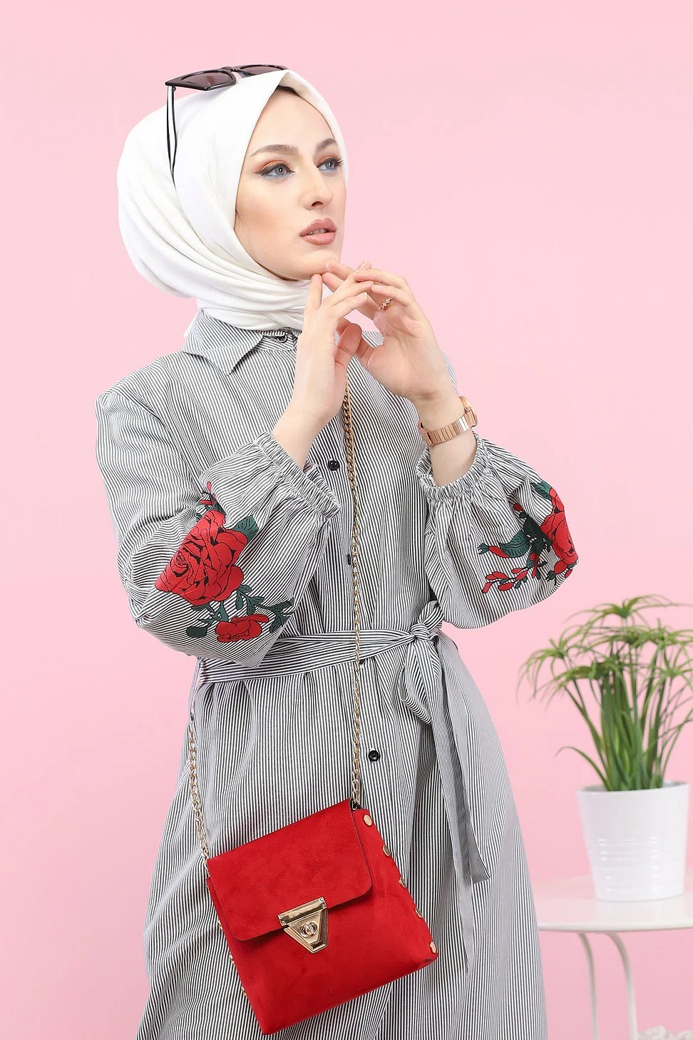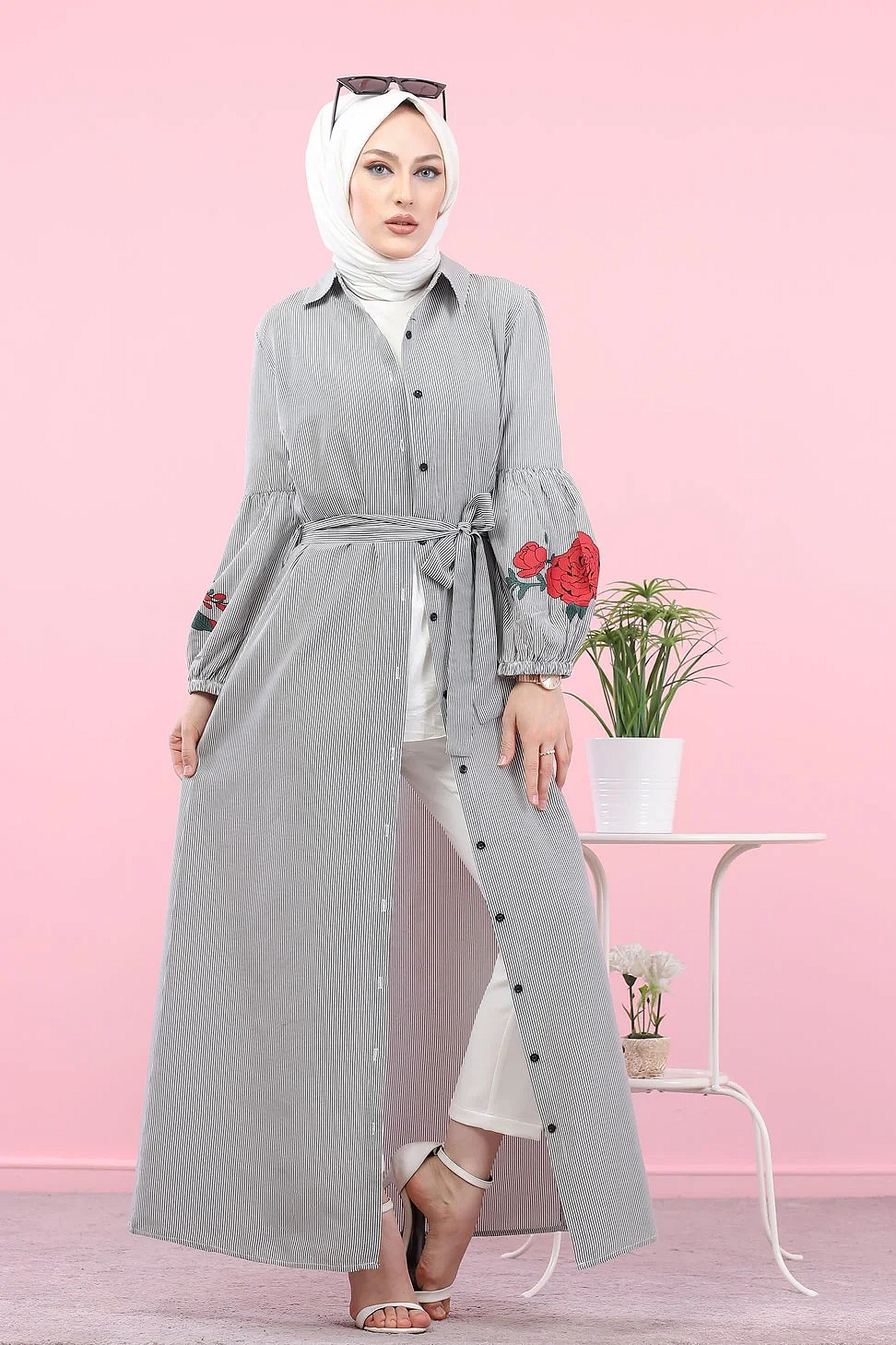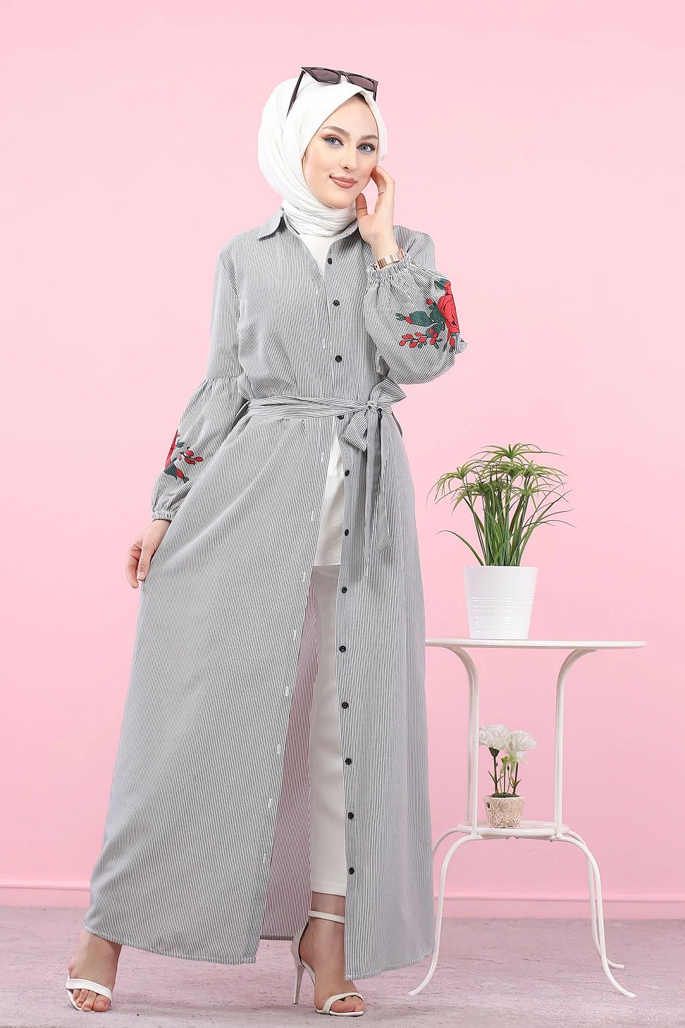 Robe chemise imprimée à rayures (Vetement hijab femme voilée) - Couleur gris et blanc Vetement & Accessoire