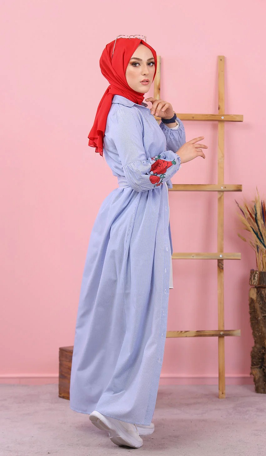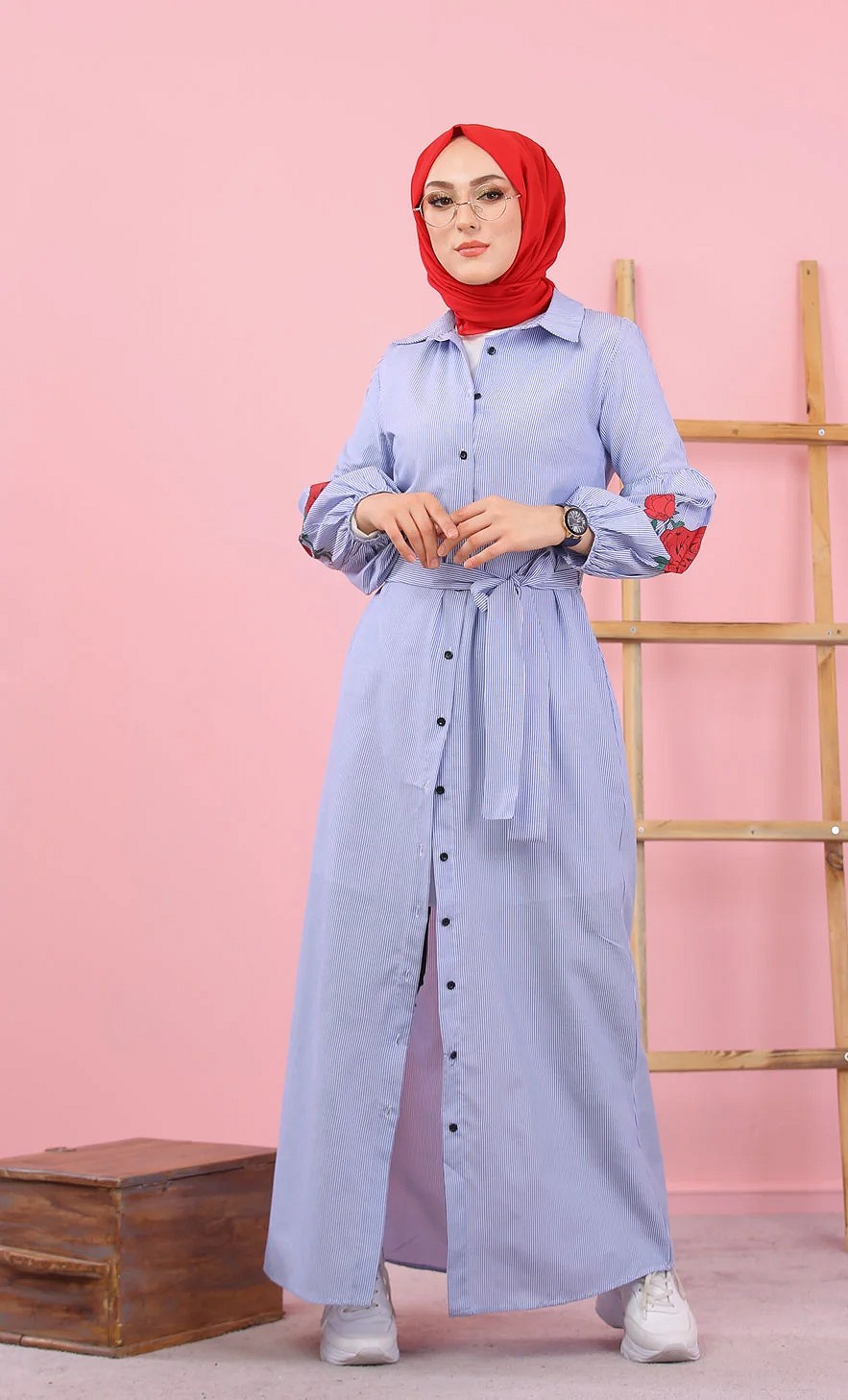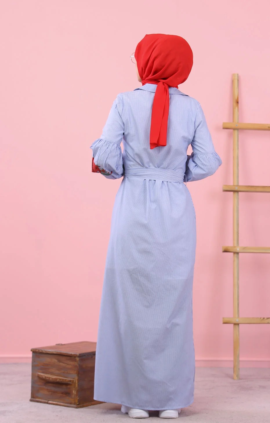 Robe chemise longue imprimee a rayures et ceinture assortie (Vetement femme voilee) - Couleur bleu et blanc