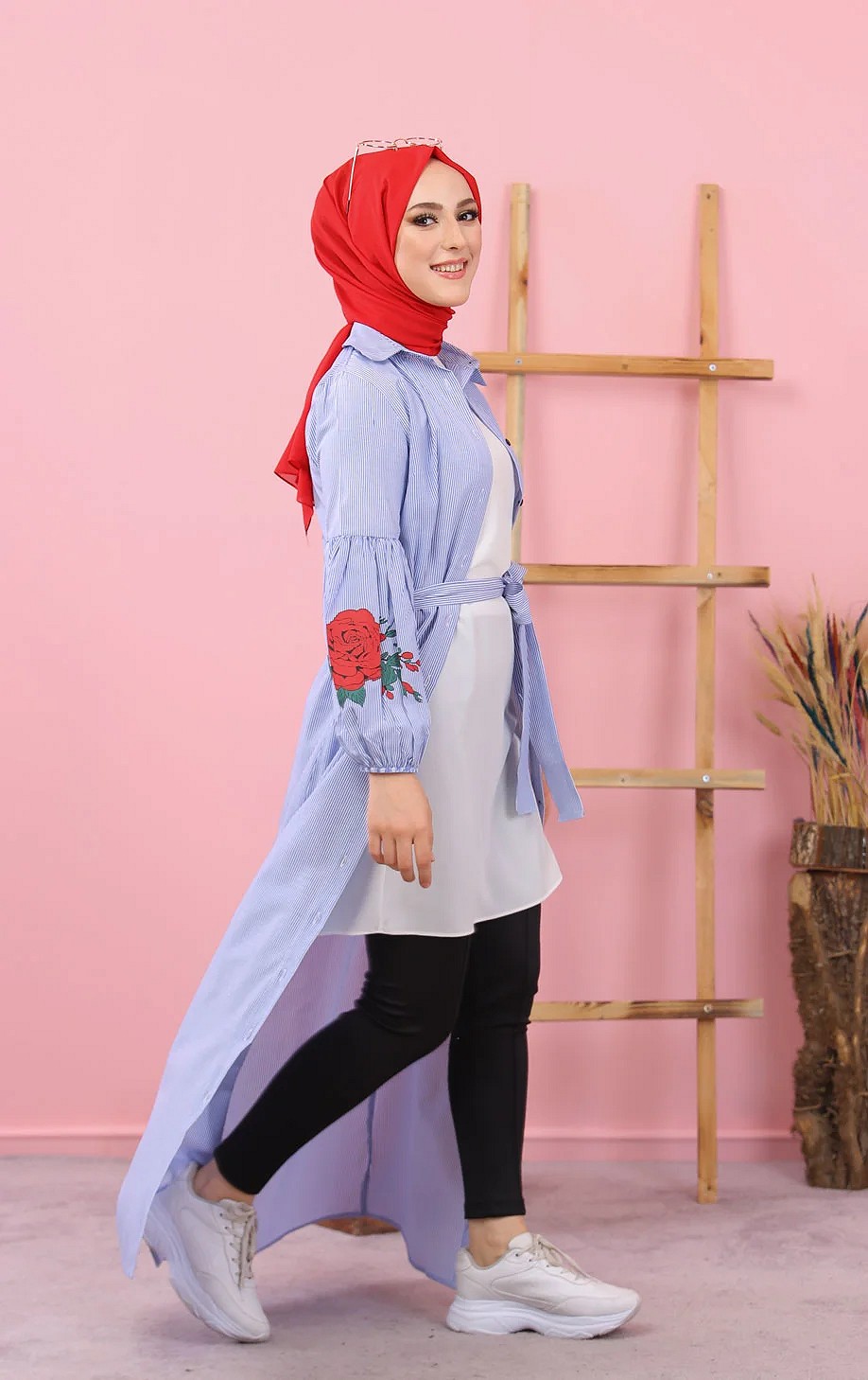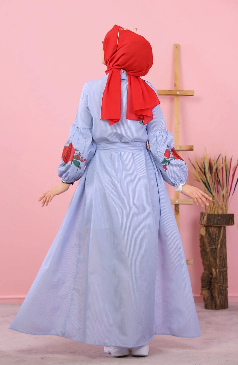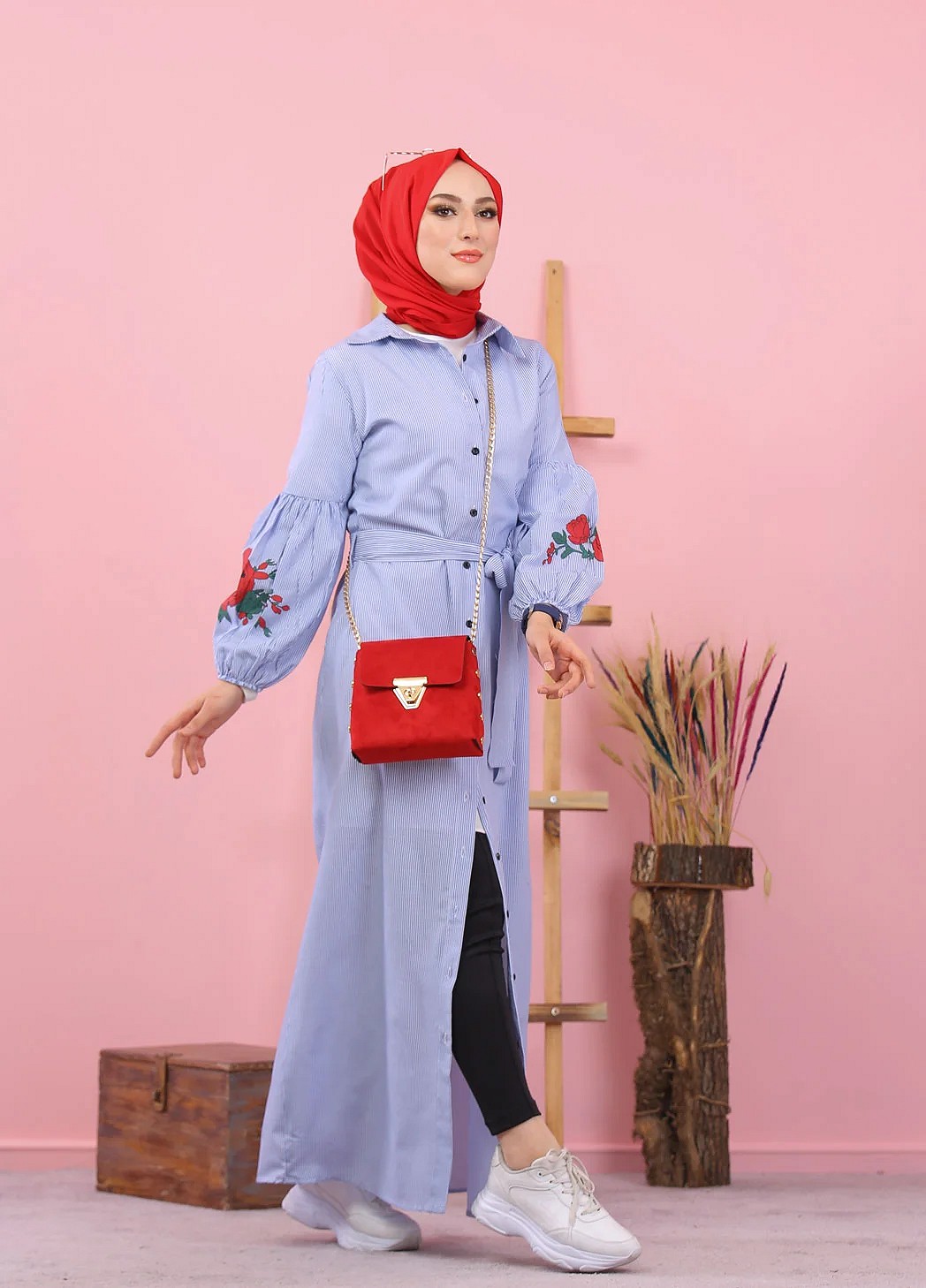 Robe chemise longue imprimee a rayures et ceinture assortie (Vetement femme voilee) - Couleur bleu et blanc