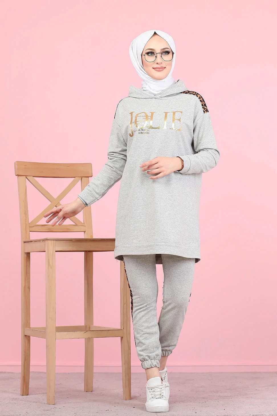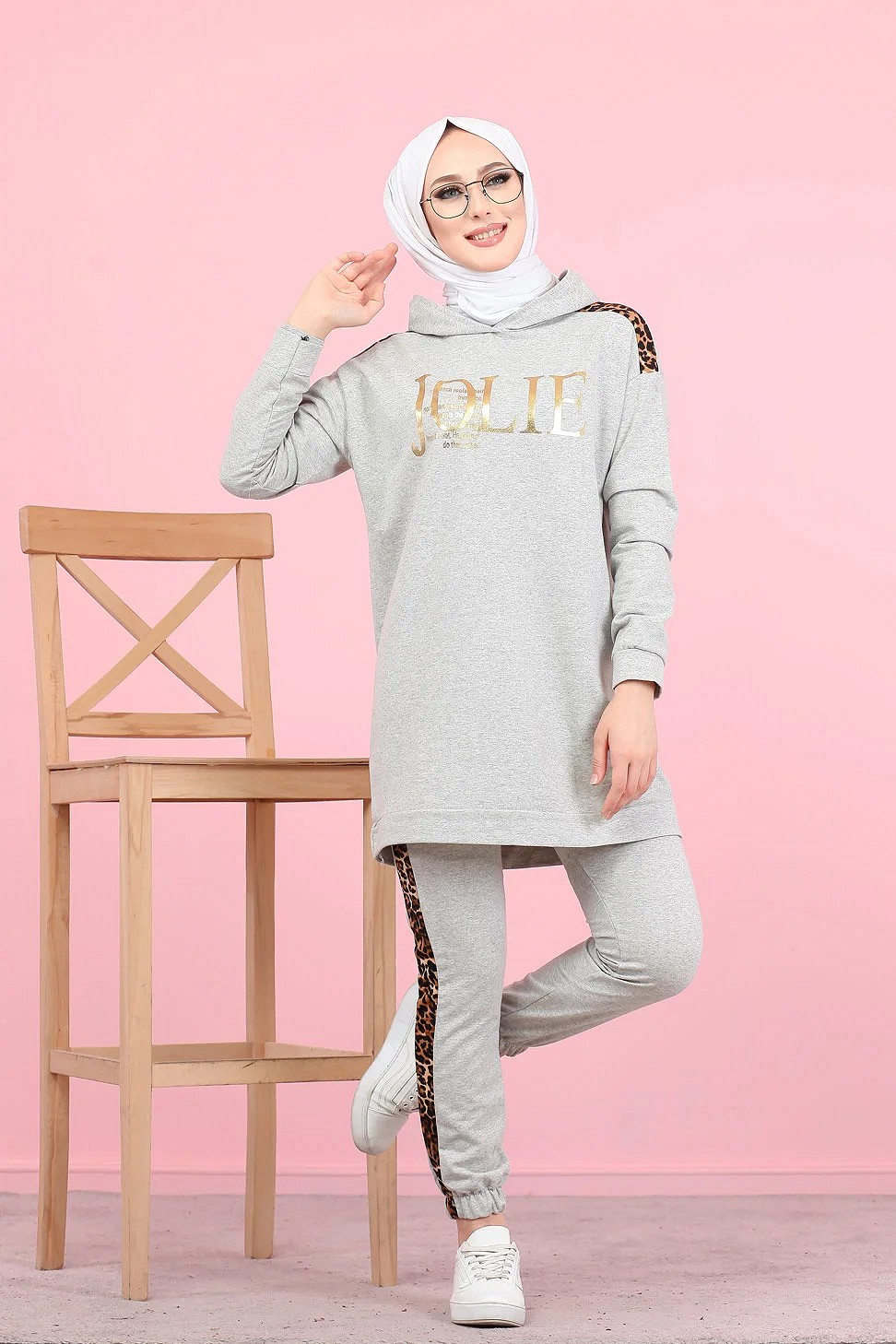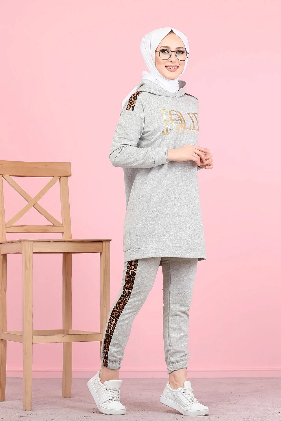 Survetement femme motif panthere Tunique a capuche et Pantalon imprime "Jolie" (Hijab Sport) - Couleur gris clair