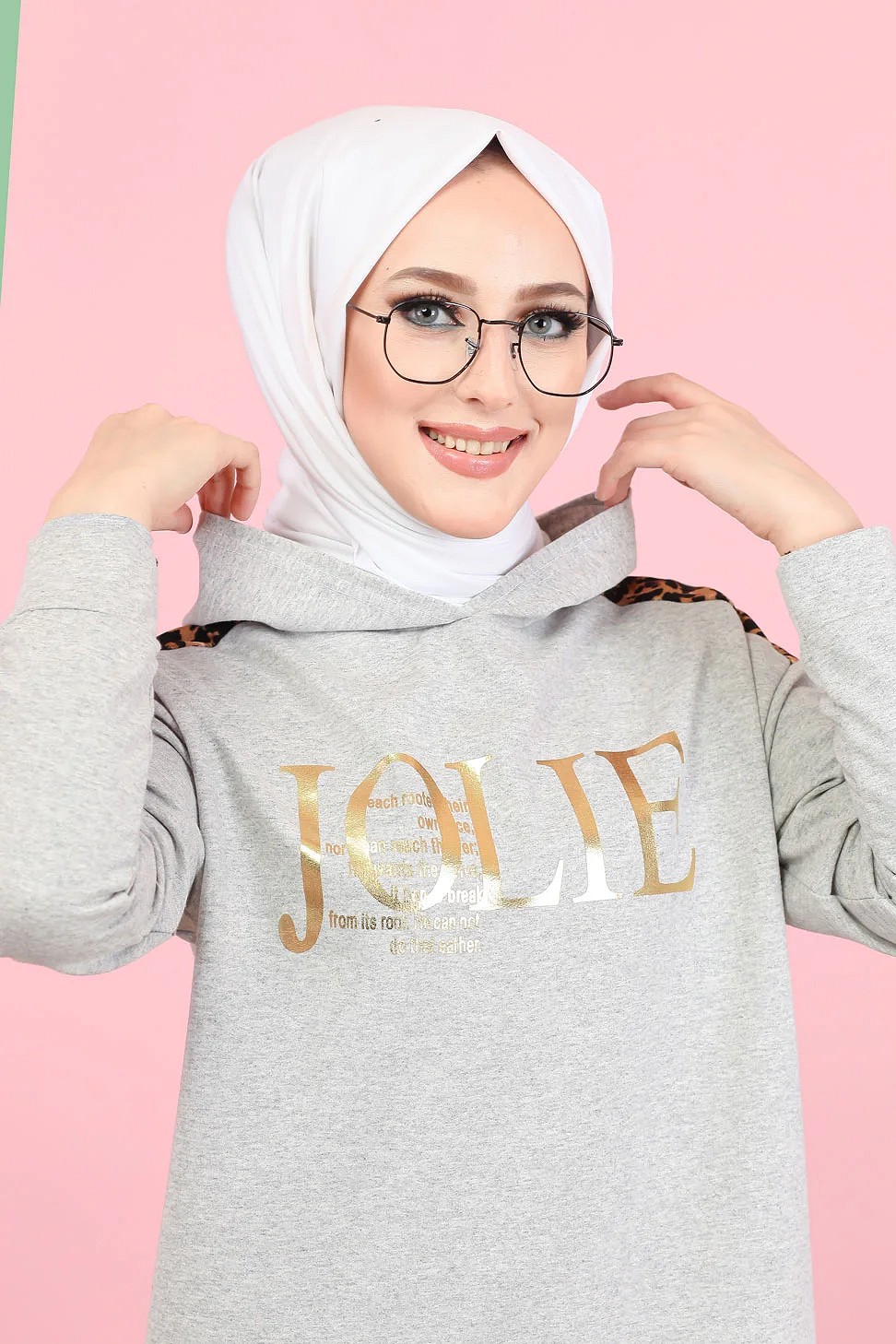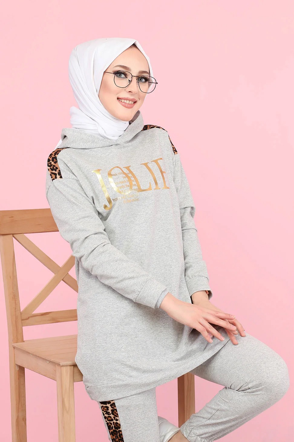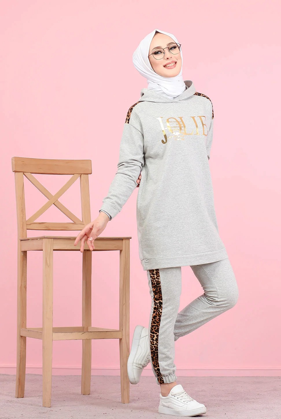 Survetement femme motif panthere Tunique a capuche et Pantalon imprime "Jolie" (Hijab Sport) - Couleur gris clair