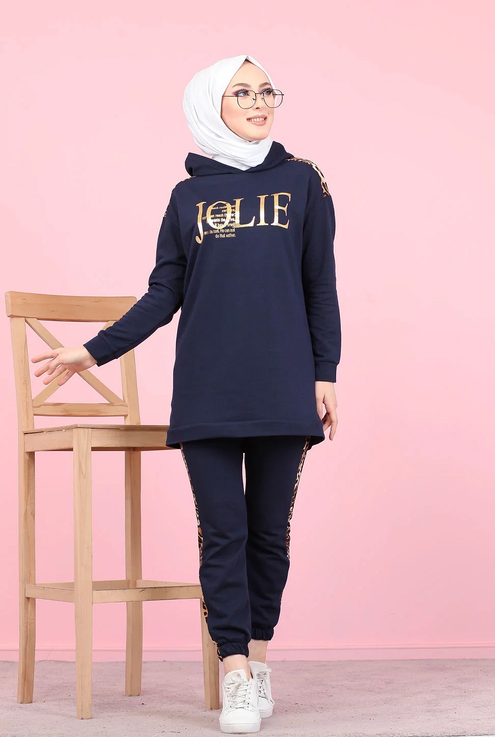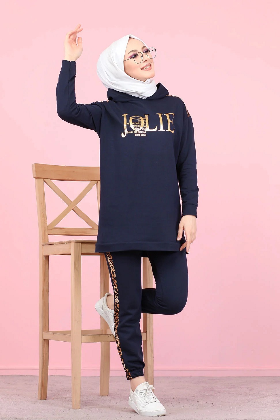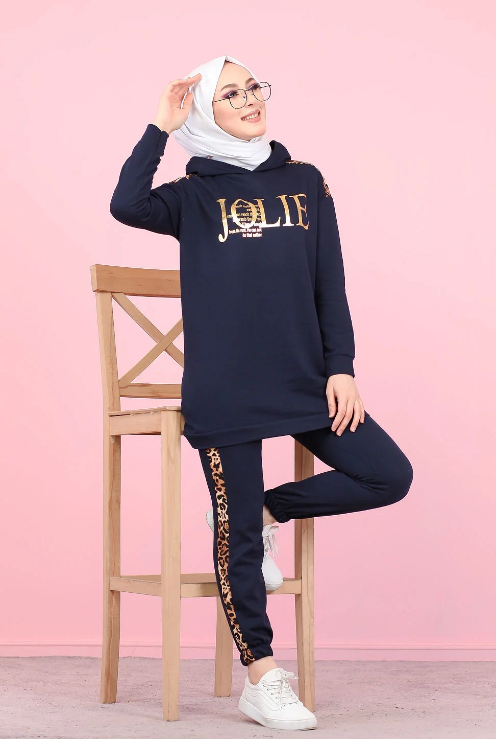 Ensemble survêtement femme deux pièces (Tunique à capuche et Pantalon jogger) avec motif panthère et sweet imprimé "Jolie" en écriture dorée...