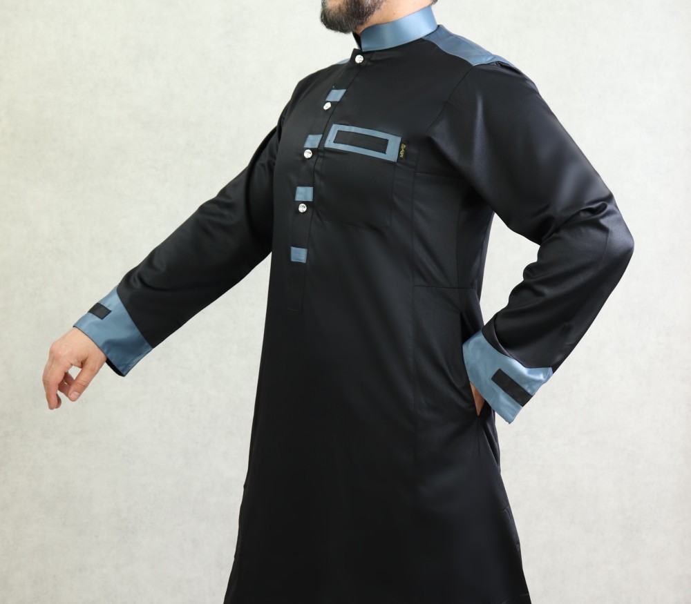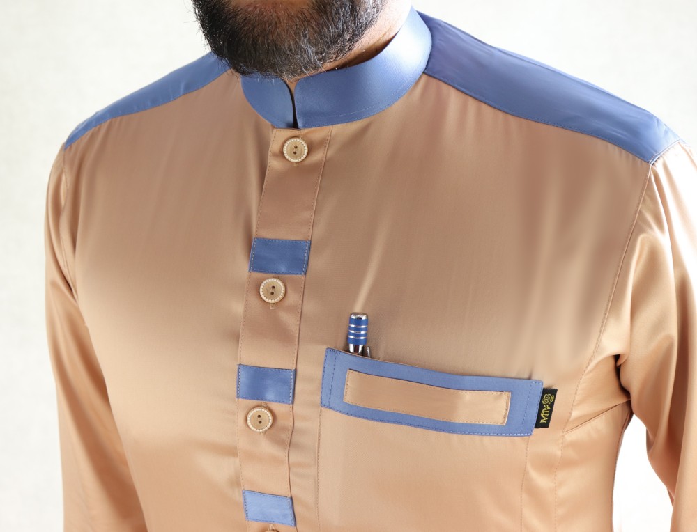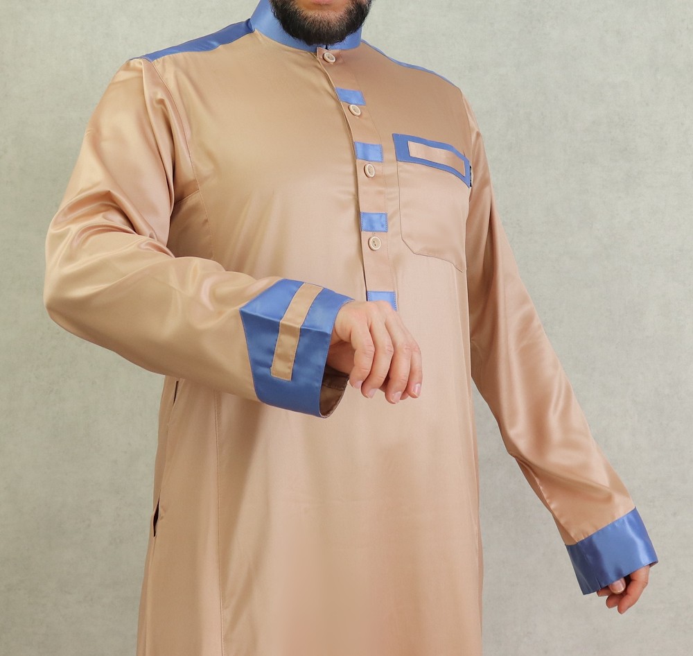 Qamis beige moderne avec poche sur le devant. Bandes décoratives bleu au niveau des épaules du devant et des poignets. Fermeture boutons argentés au niveau de la poitrine. Tissu satiné. Col mao.