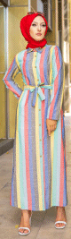 Robe entièrement boutonnée devant avec ceinture assortie (Vetement d'été femme voilée) - Rayures Rouge-Bleu-Gris-Jaune-Vert - REF. 32884 (25.00 €)