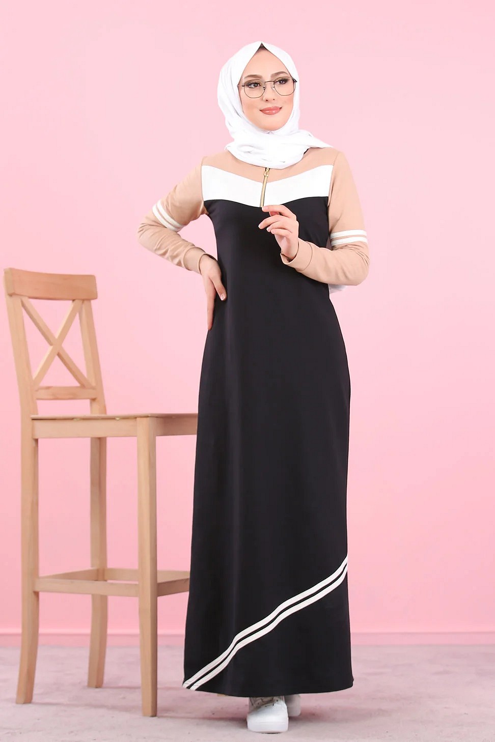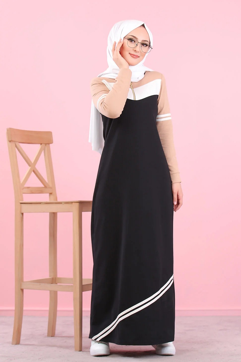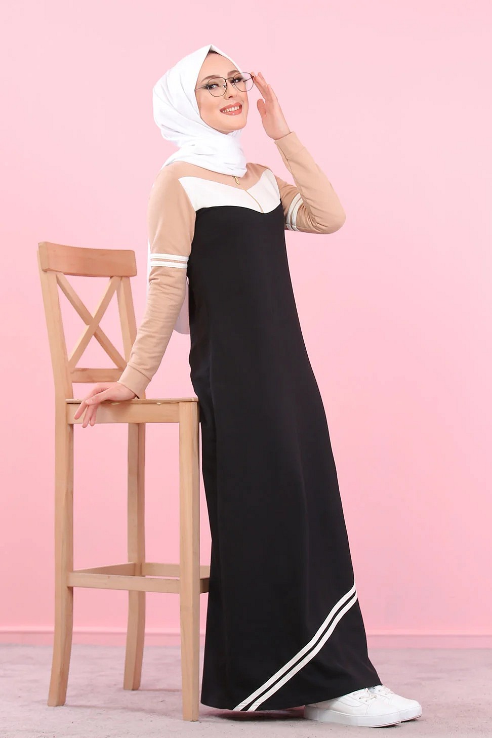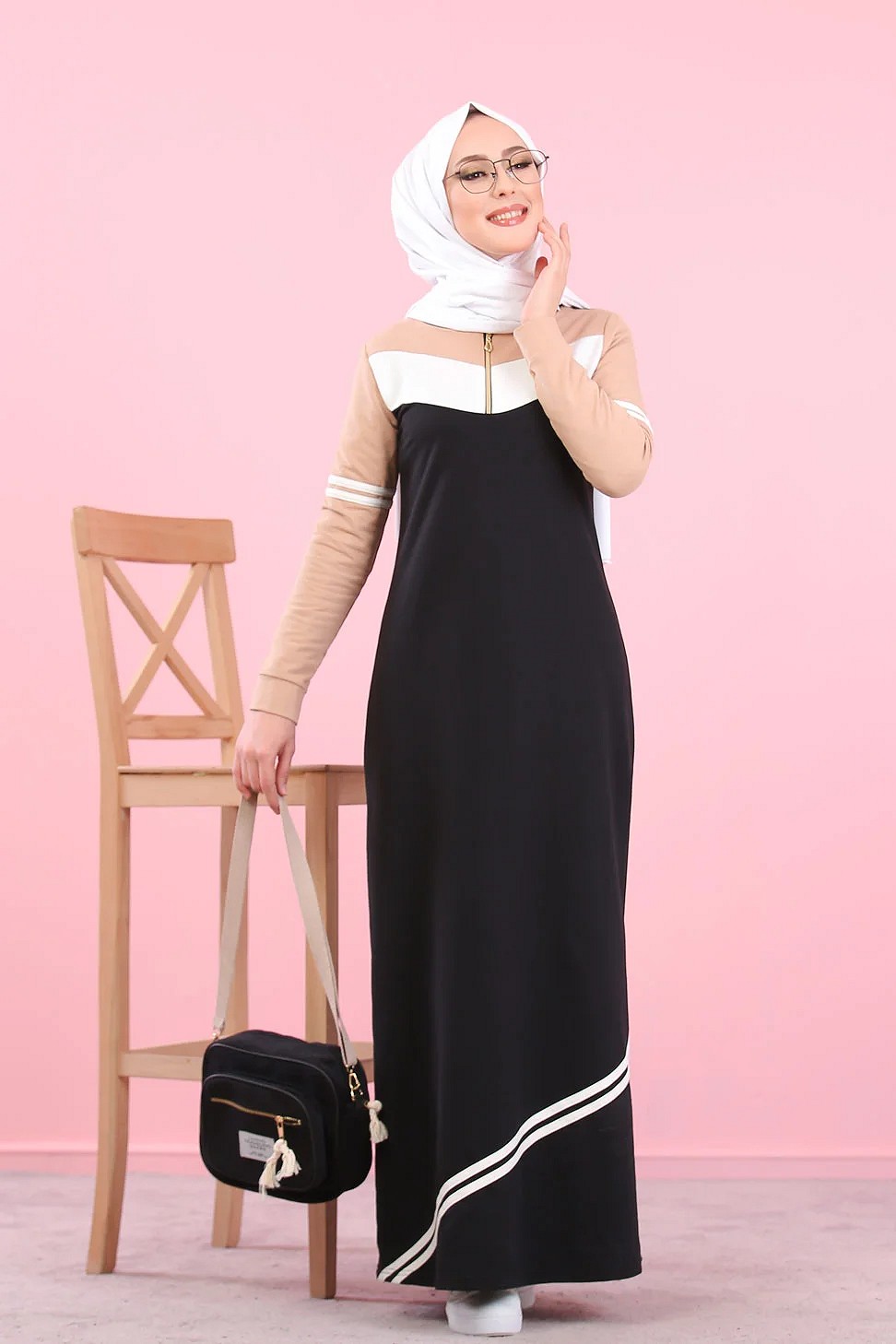 Robe sweat-shirt longue pour femme musulmane - Vetement Modest Fashion (Mode islamique) - Couleur noir et beige