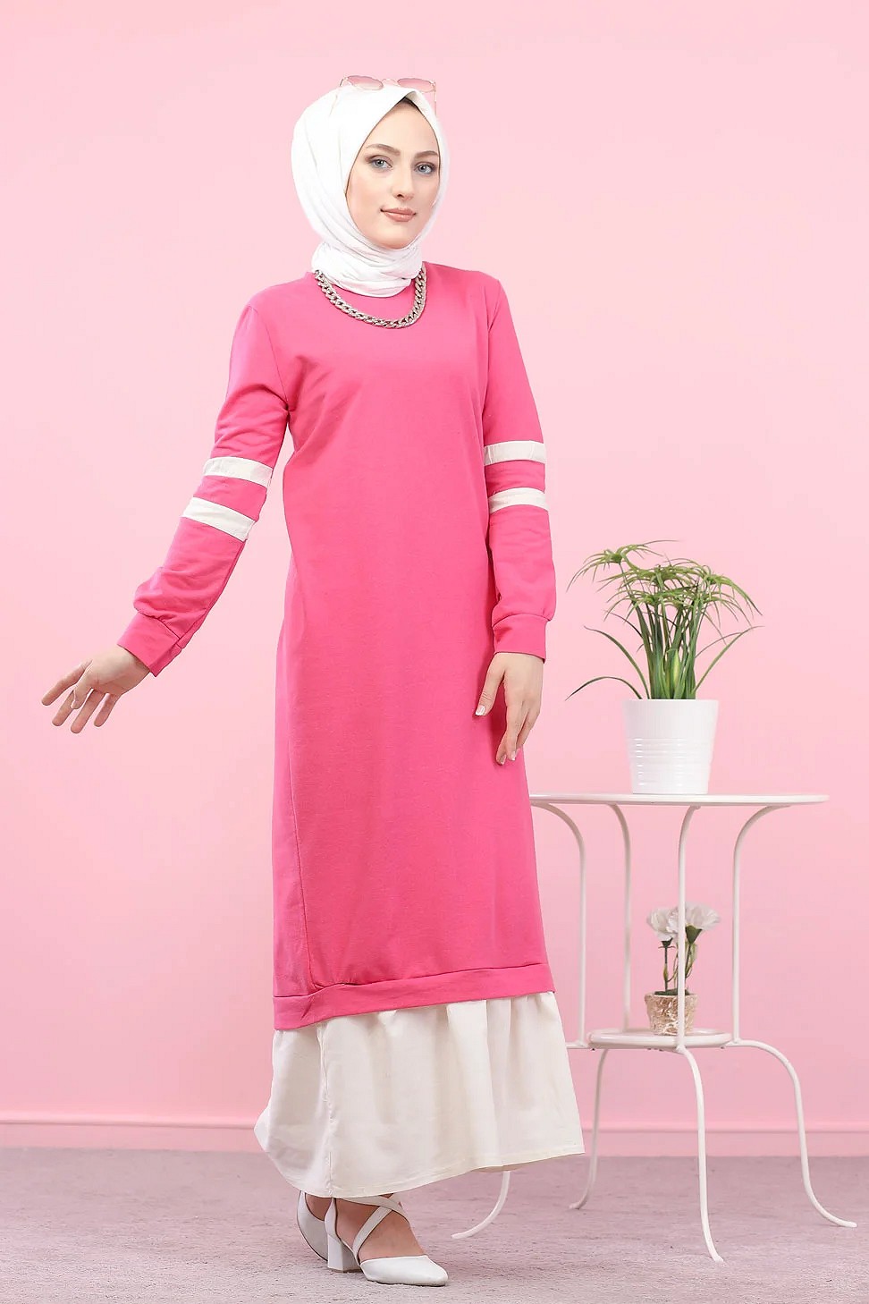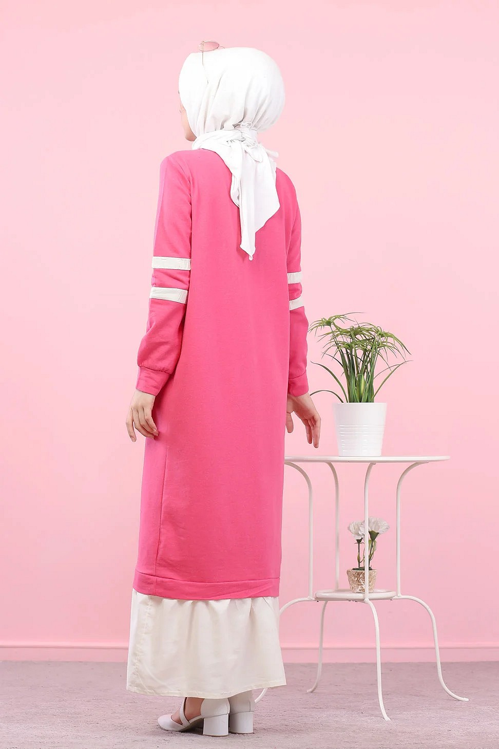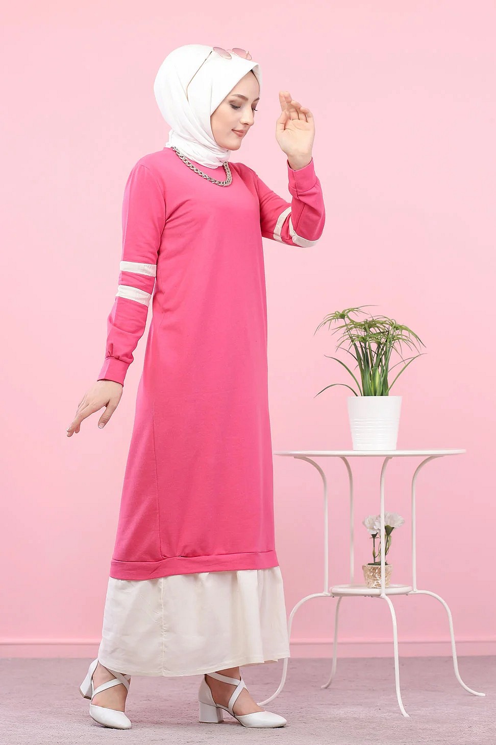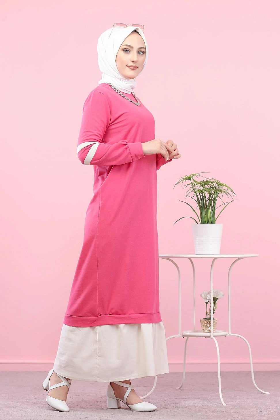 Robe longue moderne et decontractee bi-couleur pour femme voilee (Robes Hijab pas cher) - Couleur rose fuchsia et blanc