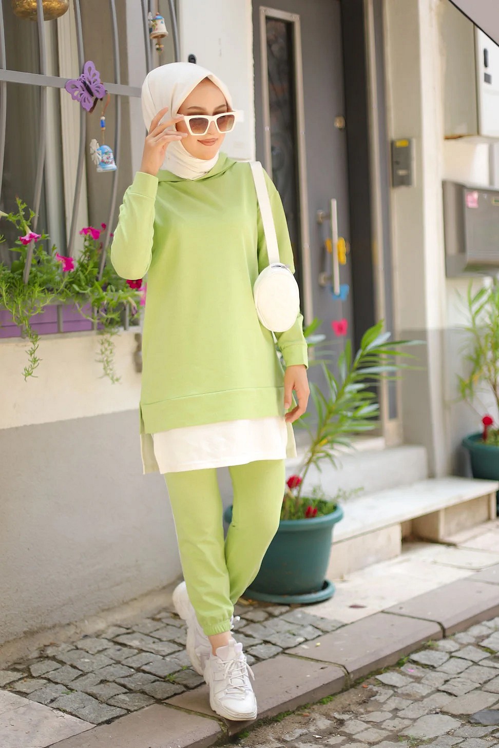 Survêtement deux pièces composé d'un sweat à capuche, coupe droite et d'un pantalon taille élastique. Le Sweat-shirt est rallongé avec extension de couleur blanche.