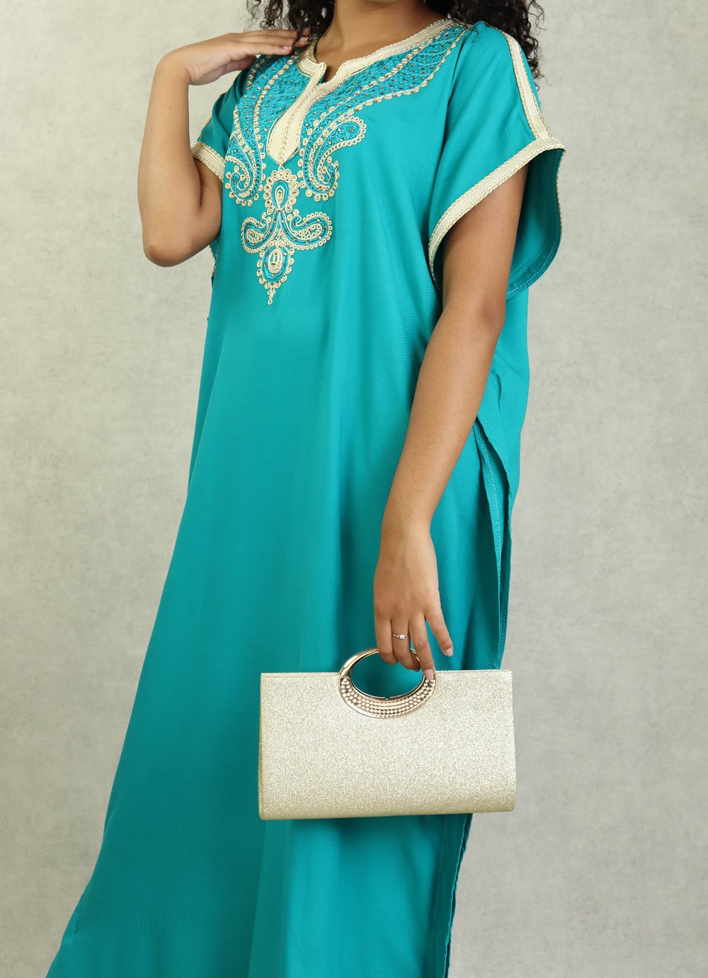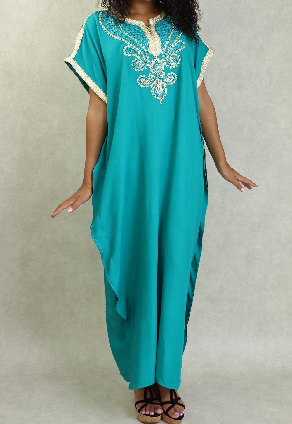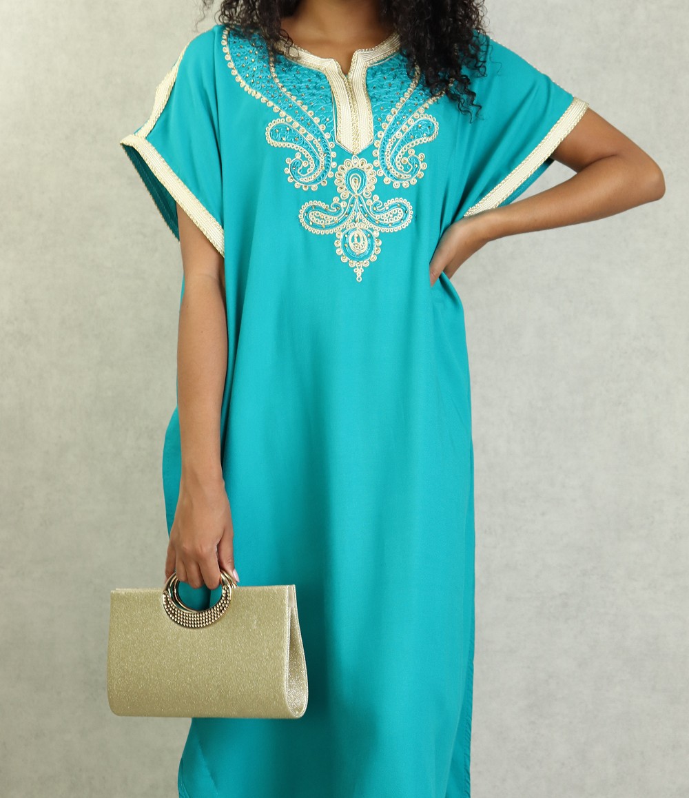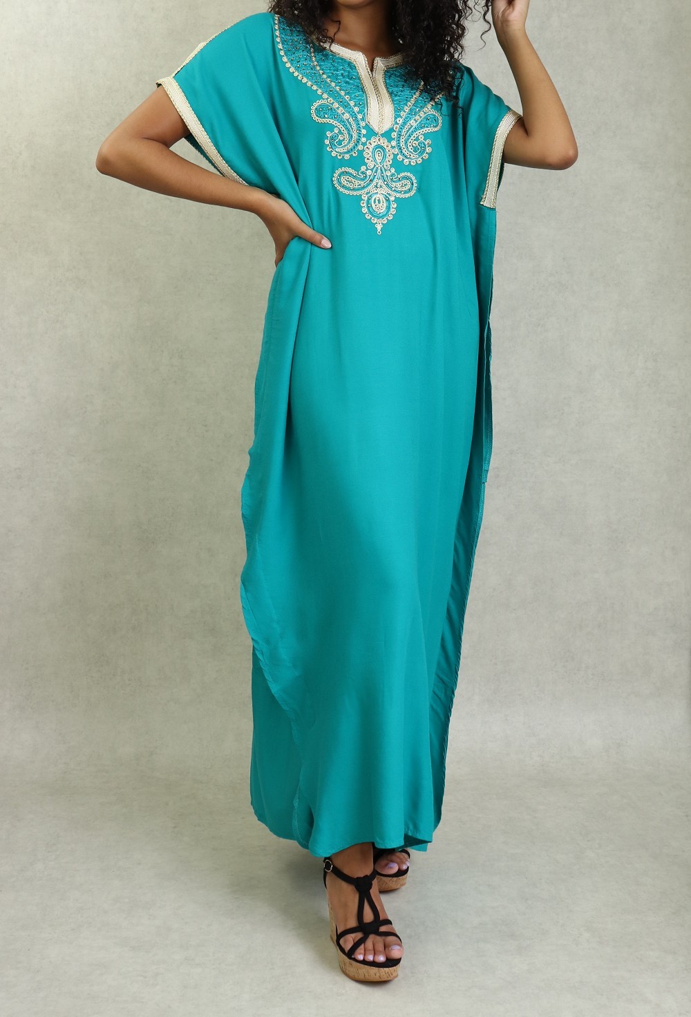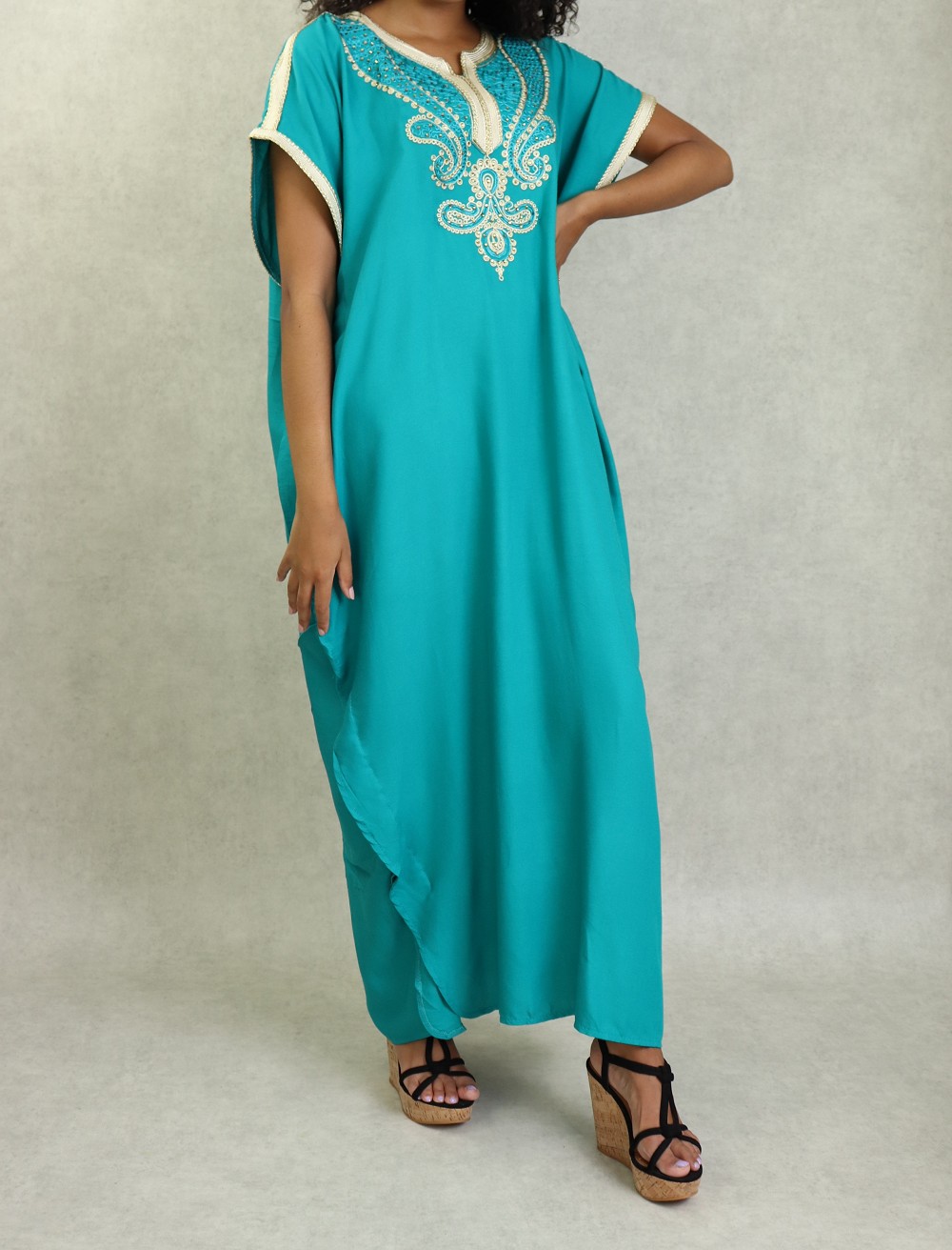 Robe orientale longue manche courte avec belles broderies pour femme - Couleur Vert émeraude Vetement & Accessoire