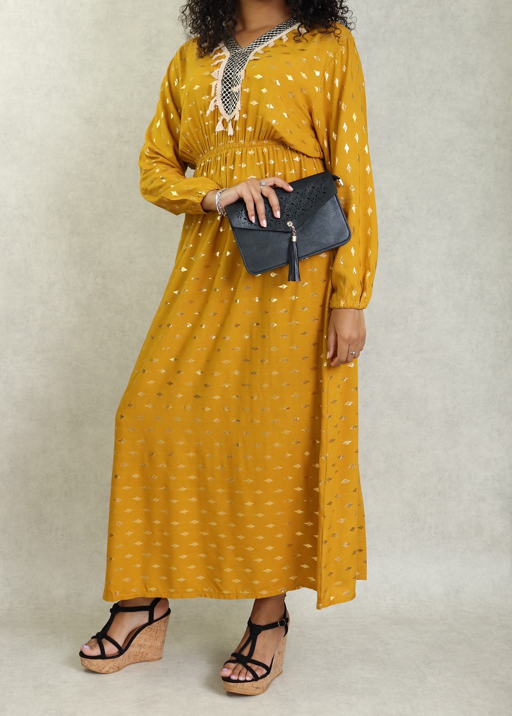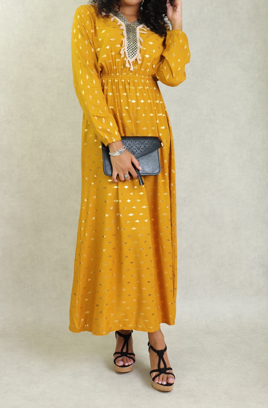 Robe fluide avec motifs dorés broderies et pompons pour femme - Couleur Jaune moutarde Vetement & Accessoire