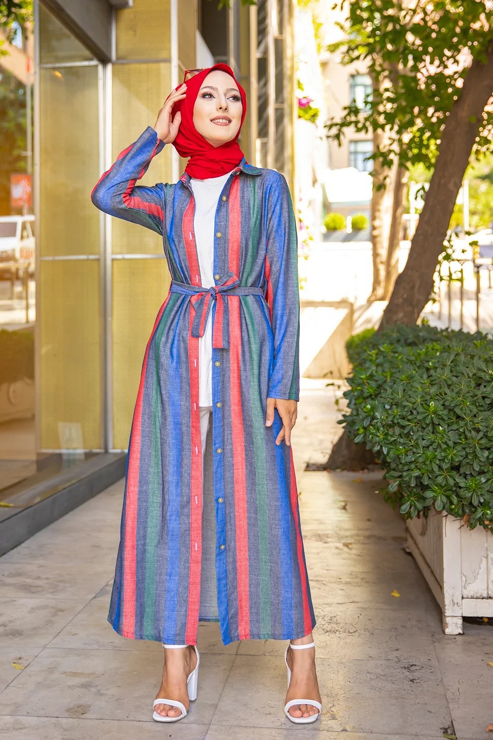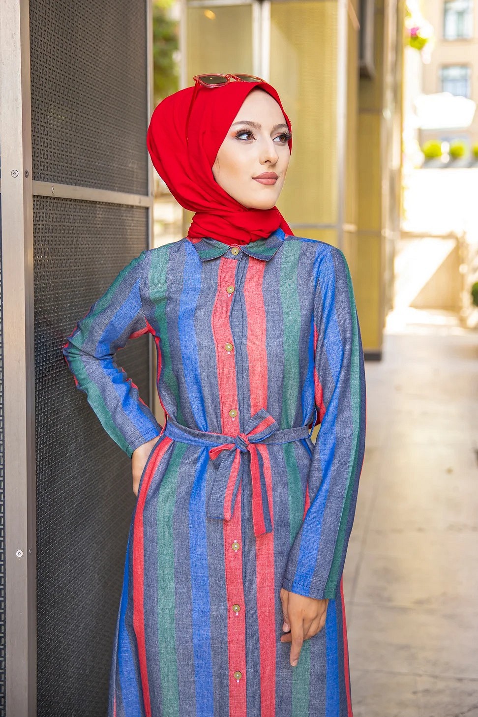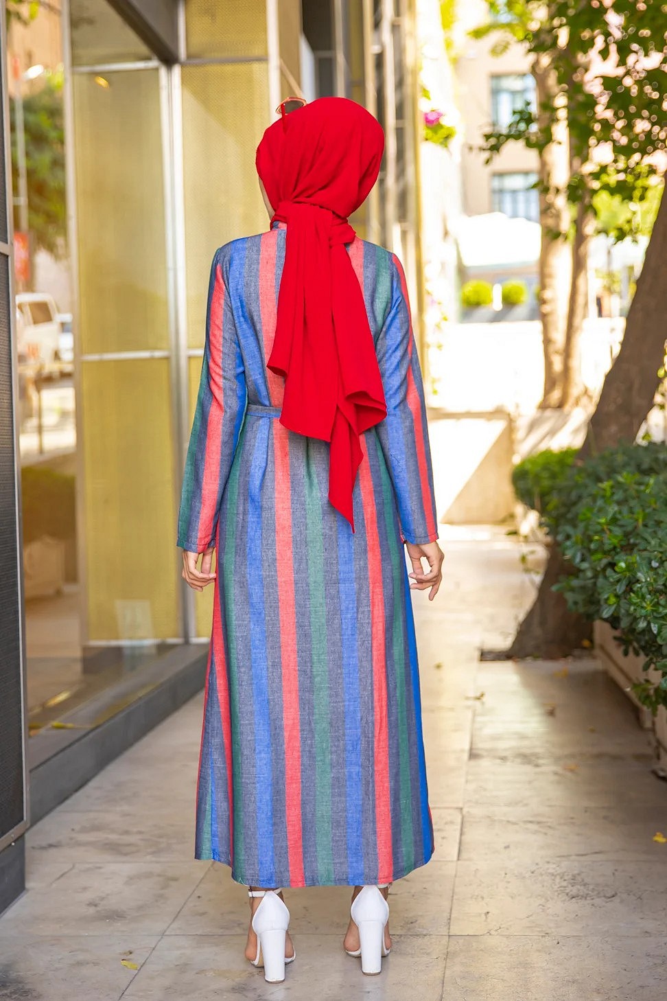 Robe entierement boutonnee devant avec ceinture assortie (Vetement ete femme voilee) - Couleur des rayures : Bleu-Rouge-Gris-Kaki