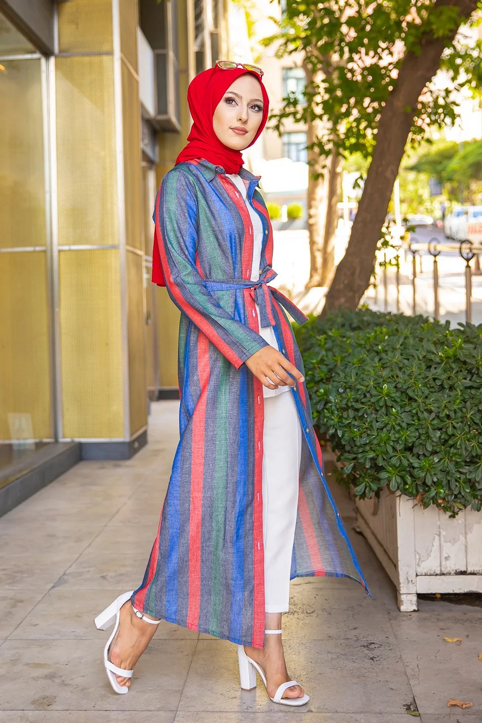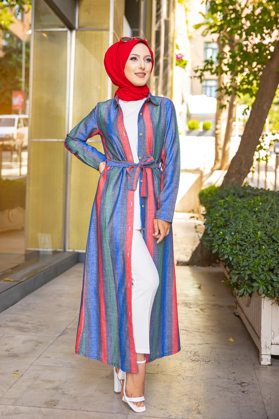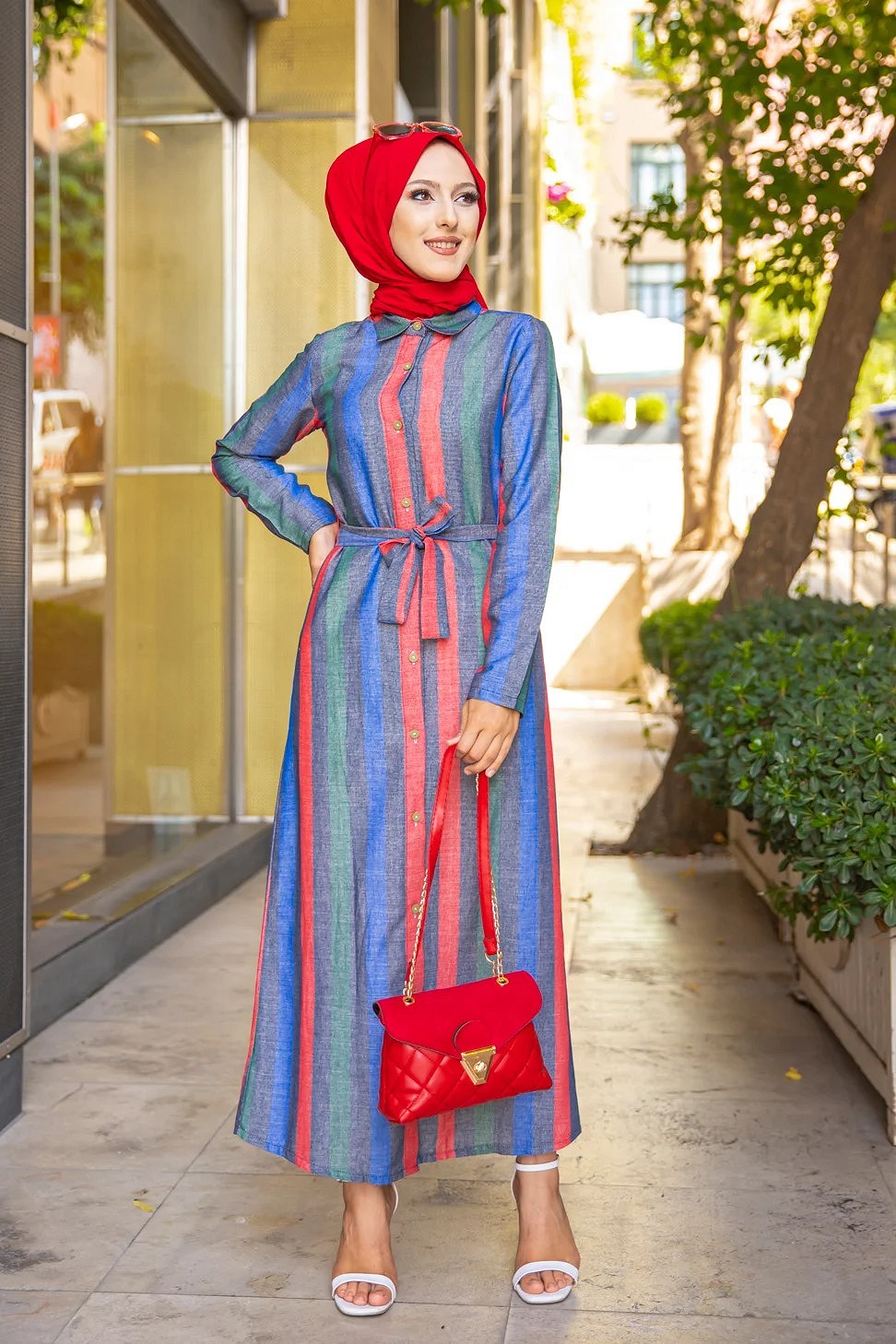 Robe entierement boutonnee devant avec ceinture assortie (Vetement ete femme voilee) - Couleur des rayures : Bleu-Rouge-Gris-Kaki