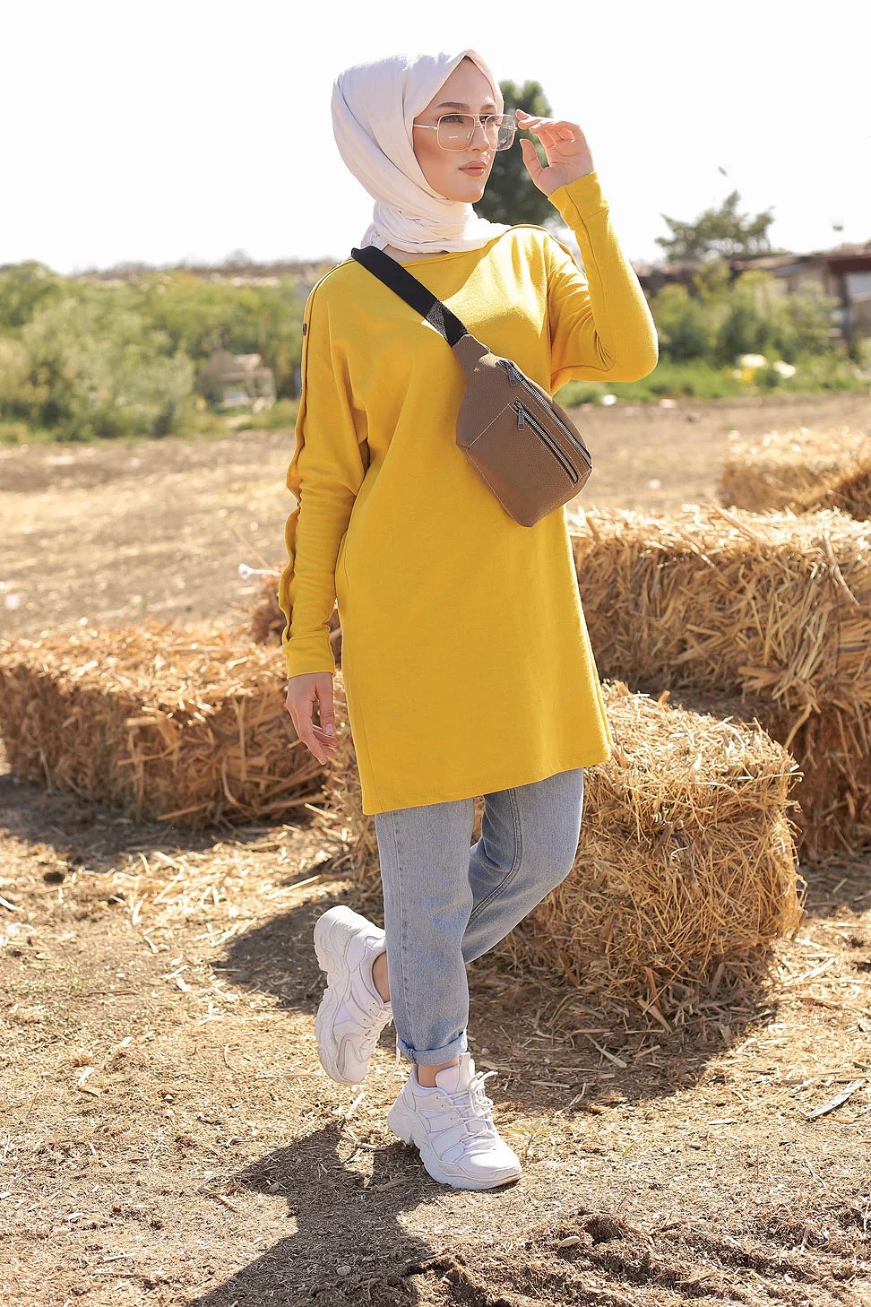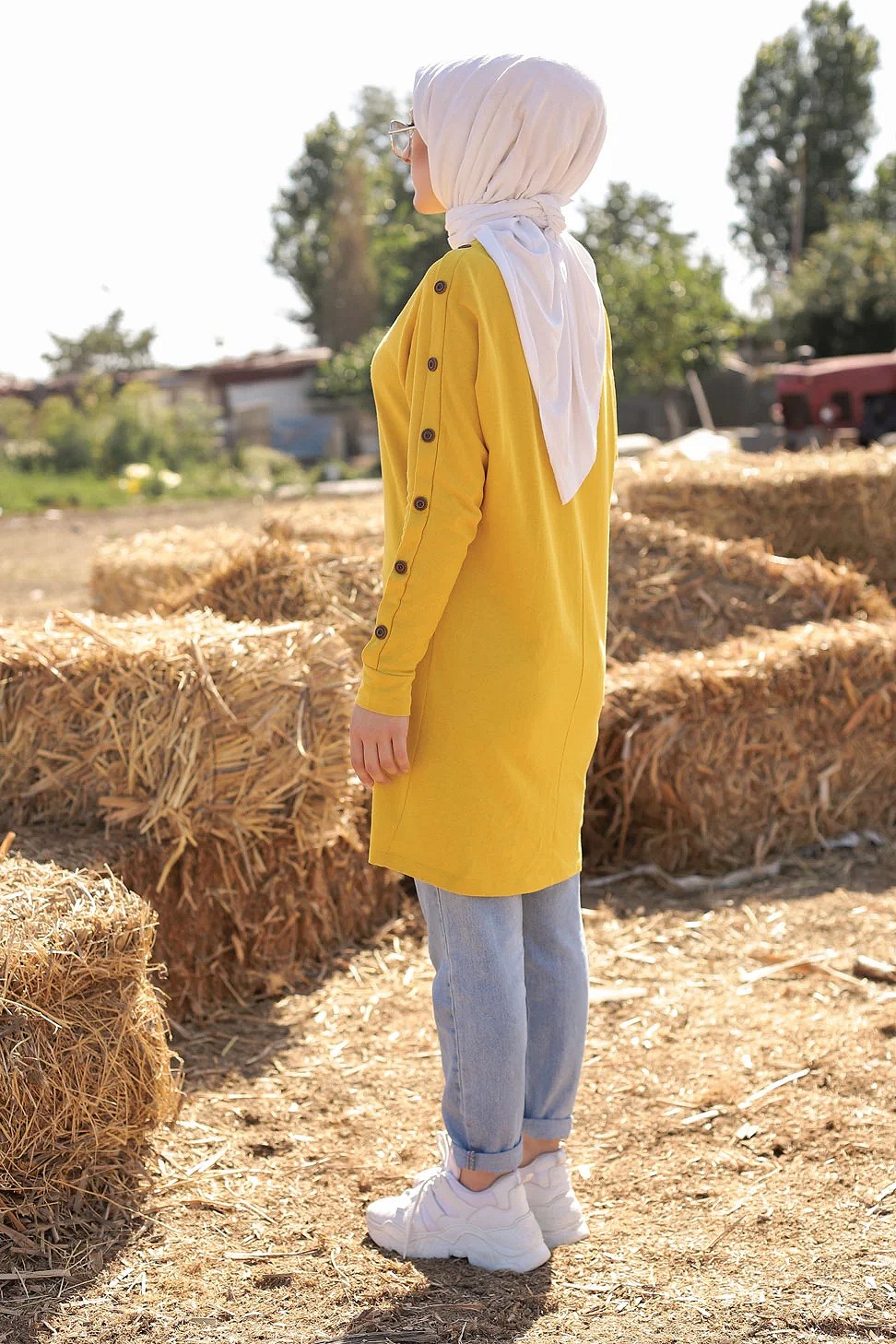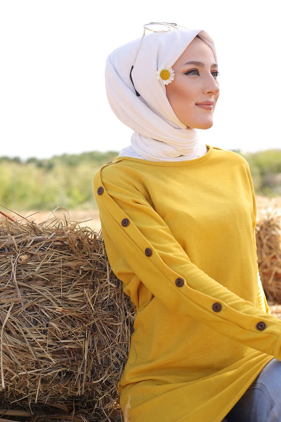 Sweat léger mi long, col rond, manches ornées de boutons décoratifs, coupe droite, tissu type sweat.
