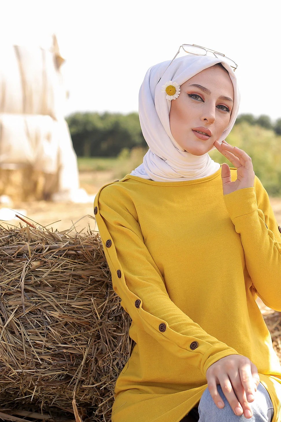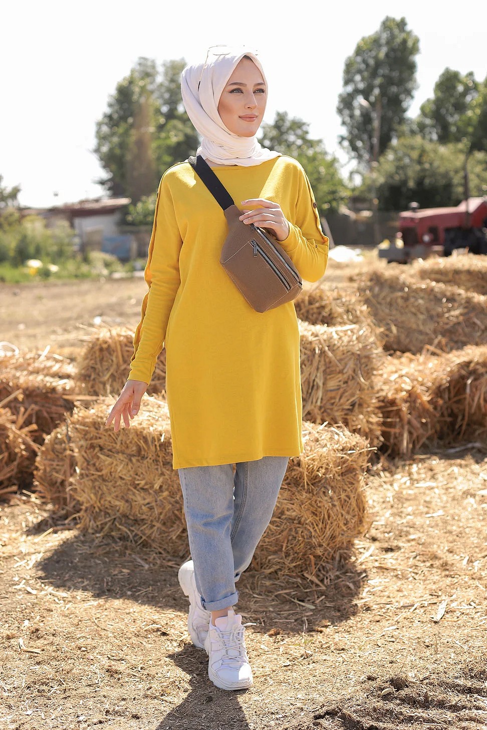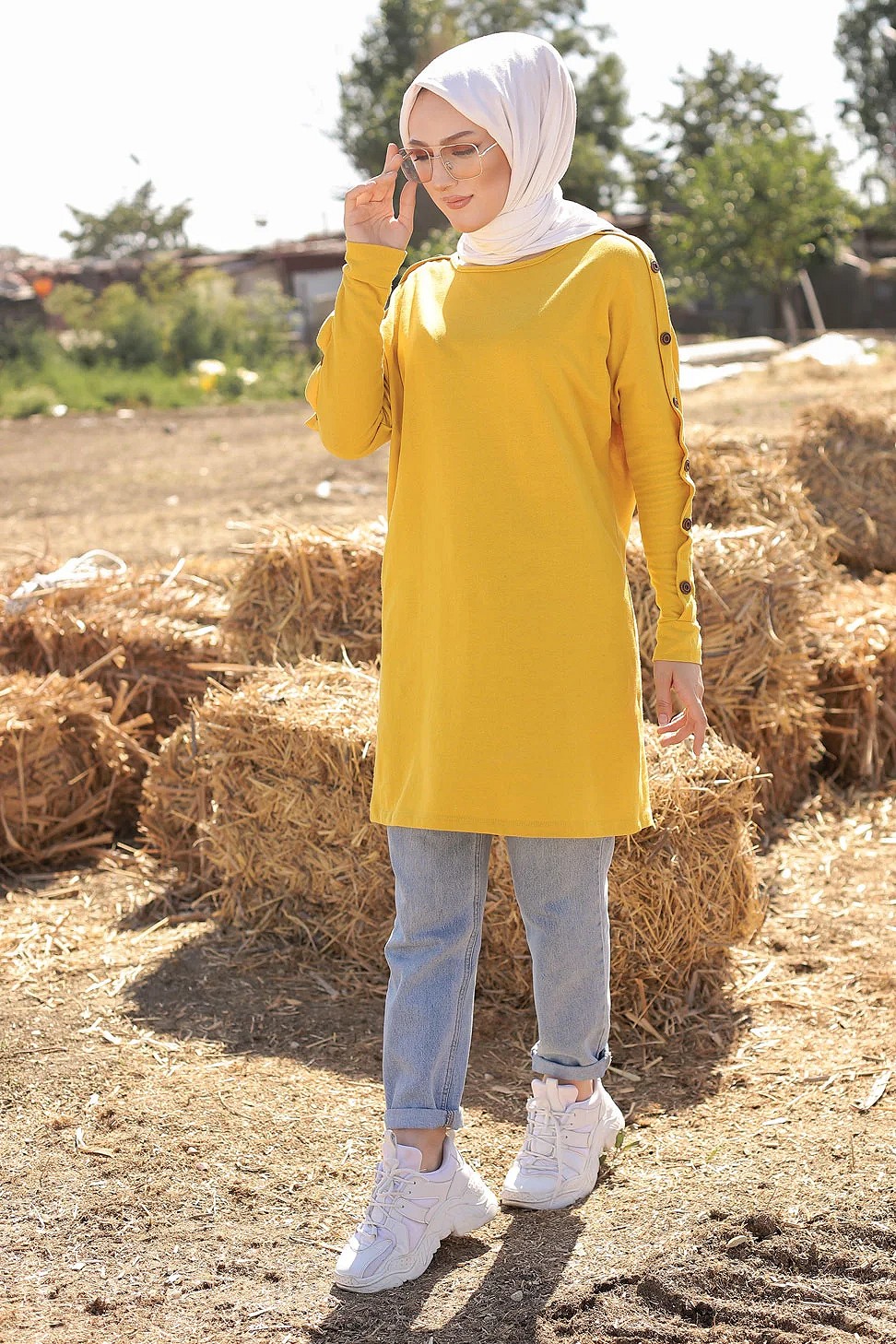 Sweat léger mi long, col rond, manches ornées de boutons décoratifs, coupe droite, tissu type sweat.