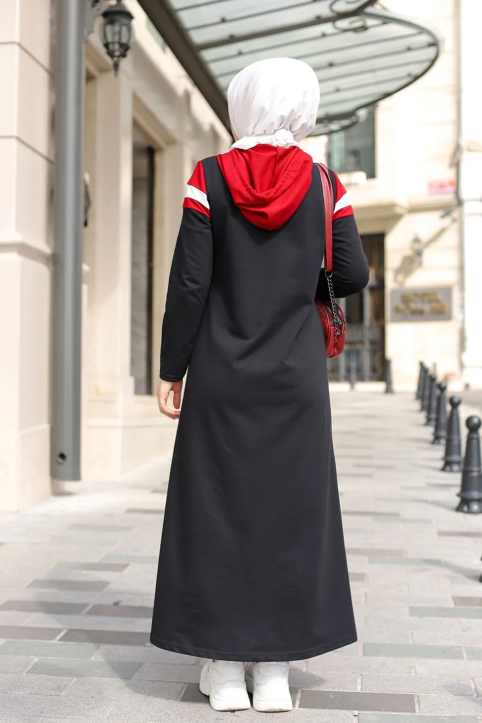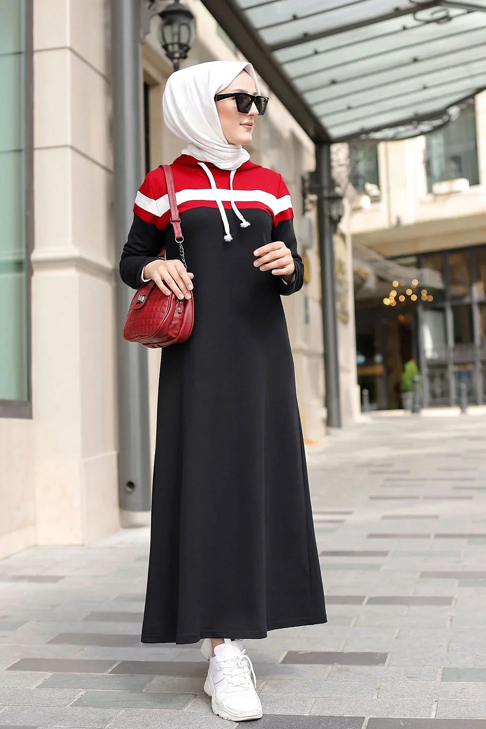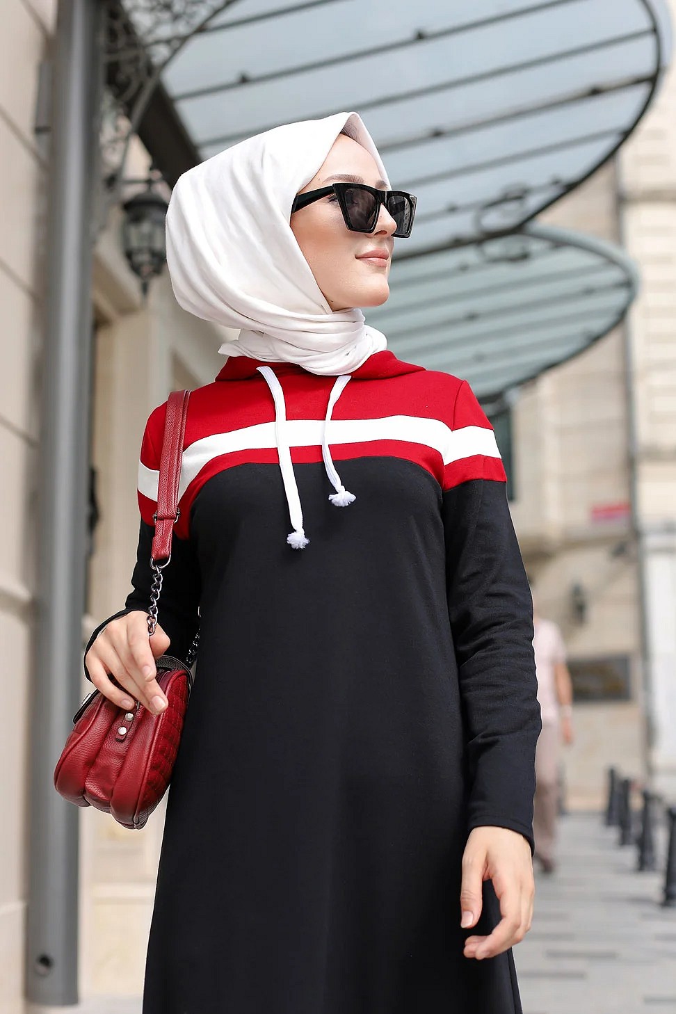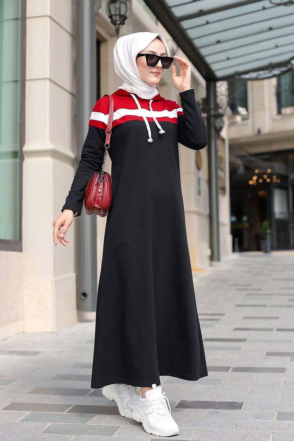 Robe longue, col capuche avec deux liens de serrage, coupe légèrement évasée, tissu effet sweat.